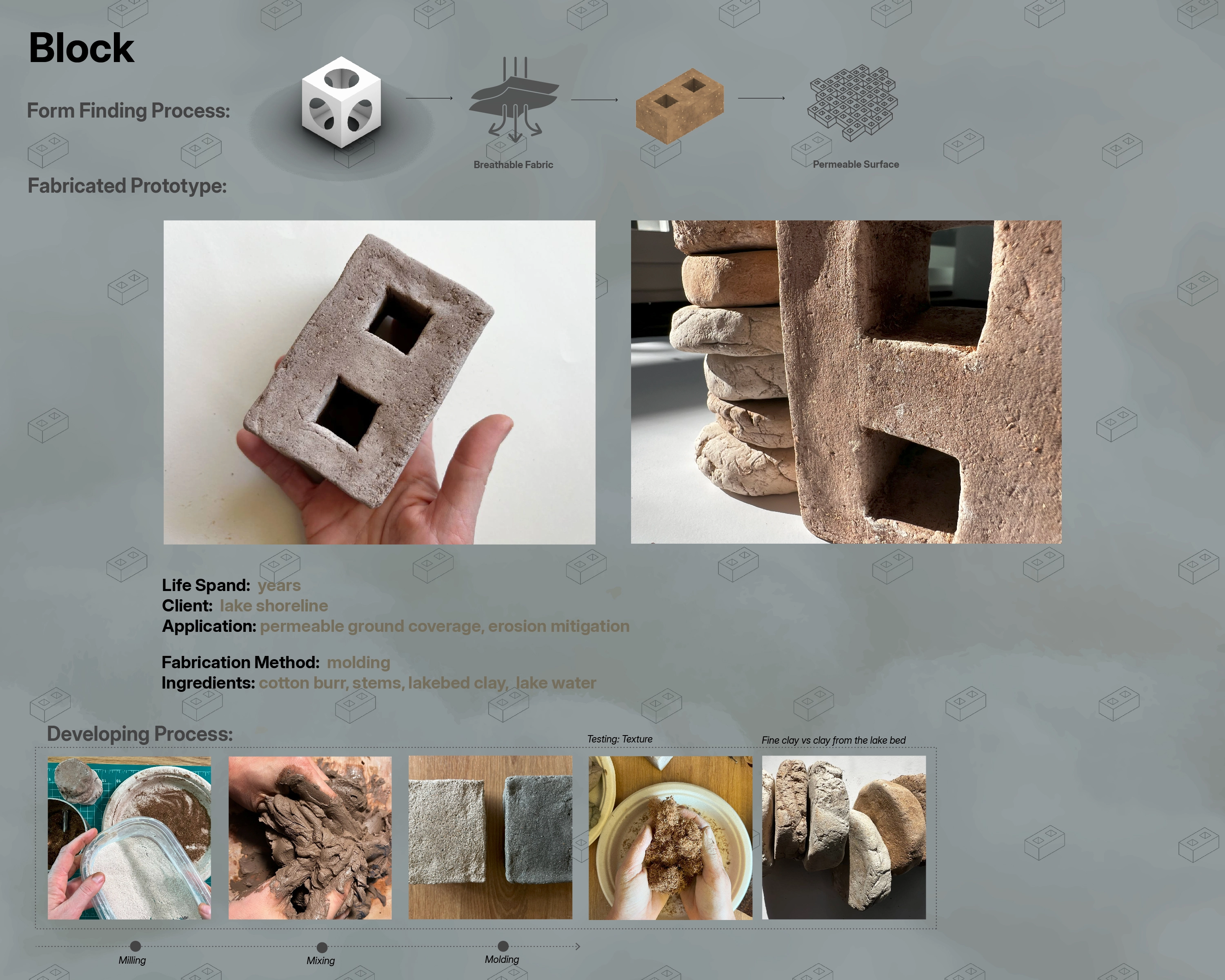 The research involves experimenting with secondary cellulose transformations through recipes and digital and physical fabrication methods, developing and testing new materials. This material-driven design process is connected with lake restoration, proposing small-scale alternative water infrastructure built with nature. A product line was developed to aid lake restoration, based on the physical features of combined aggregates like texture, flexibility, viscosity, and water resistance, showing the variations and flexibility of biomaterials and their potential to replace unsustainable solutions like concrete. These cotton-based products are more responsive to the lake ecology and agricultural needs.