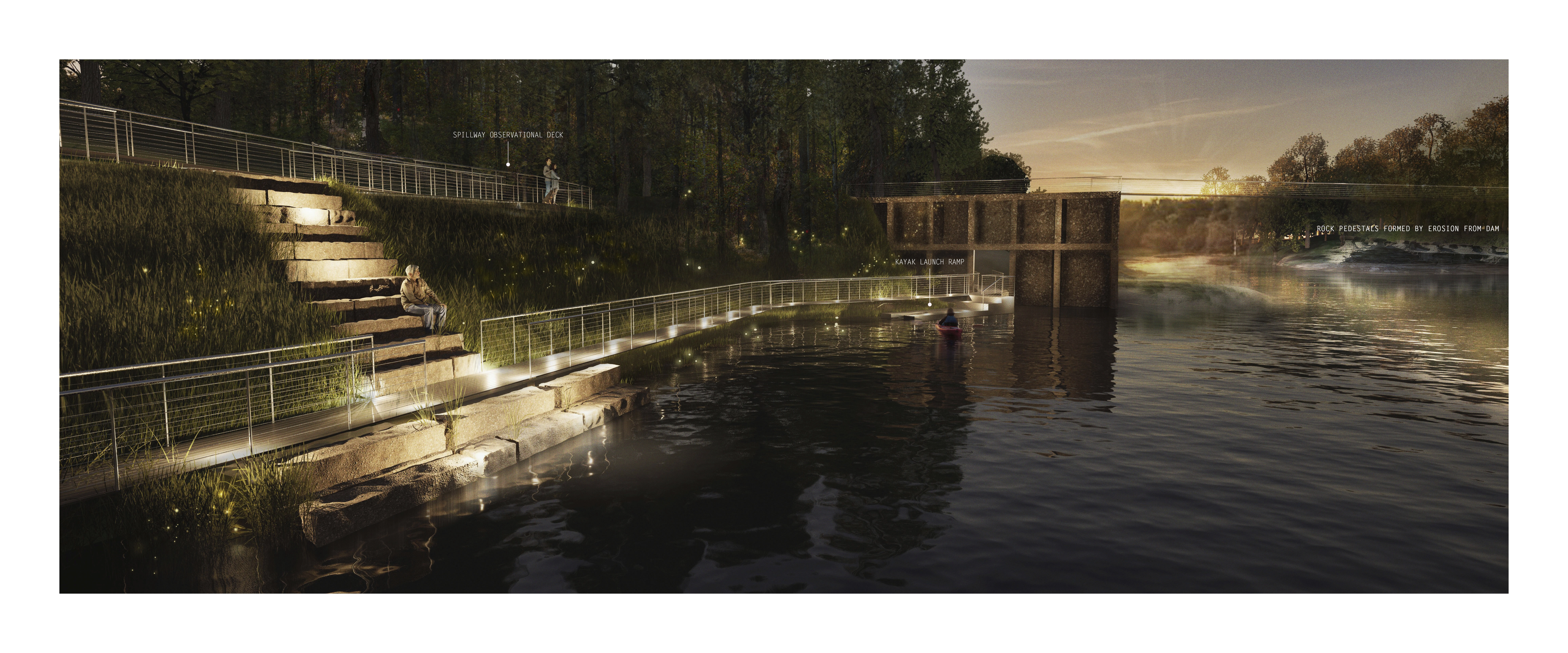 The boardwalk comprises three levels, each carefully designed to provide unique experiences. The first level serves as the main point of entry, featuring dense vegetation like native oaks, sycamores, and ash trees. The second level is an open meadow area with native grasses like bluestem and switchgrass, along with seasonal flowers. This level offers shaded spots provided by the canopies of the 1st level and houses smaller trees such as black tupelo and river birch, which enjoy wet conditions towards the pumphouse.The final level of the boardwalk brings visitors closer to the water, providing access for activities like kayaking and fishing. Here, the design incorporates moments where visitors can interact with remnants of the dam, including areas where the river once flowed through gates when the dam was operational or standing on the bridge that floats over the existing form of the dam allowing viewers to see the formations, known as "rock pedestals," created by water currents from the dam during its operation. The pumphouse allows kayakers and visitors to appreciate the grandeur of its patinated machinery amidst wild river vegetation from within. Archways cut into the pumphouse allows up close exploration of this area.
