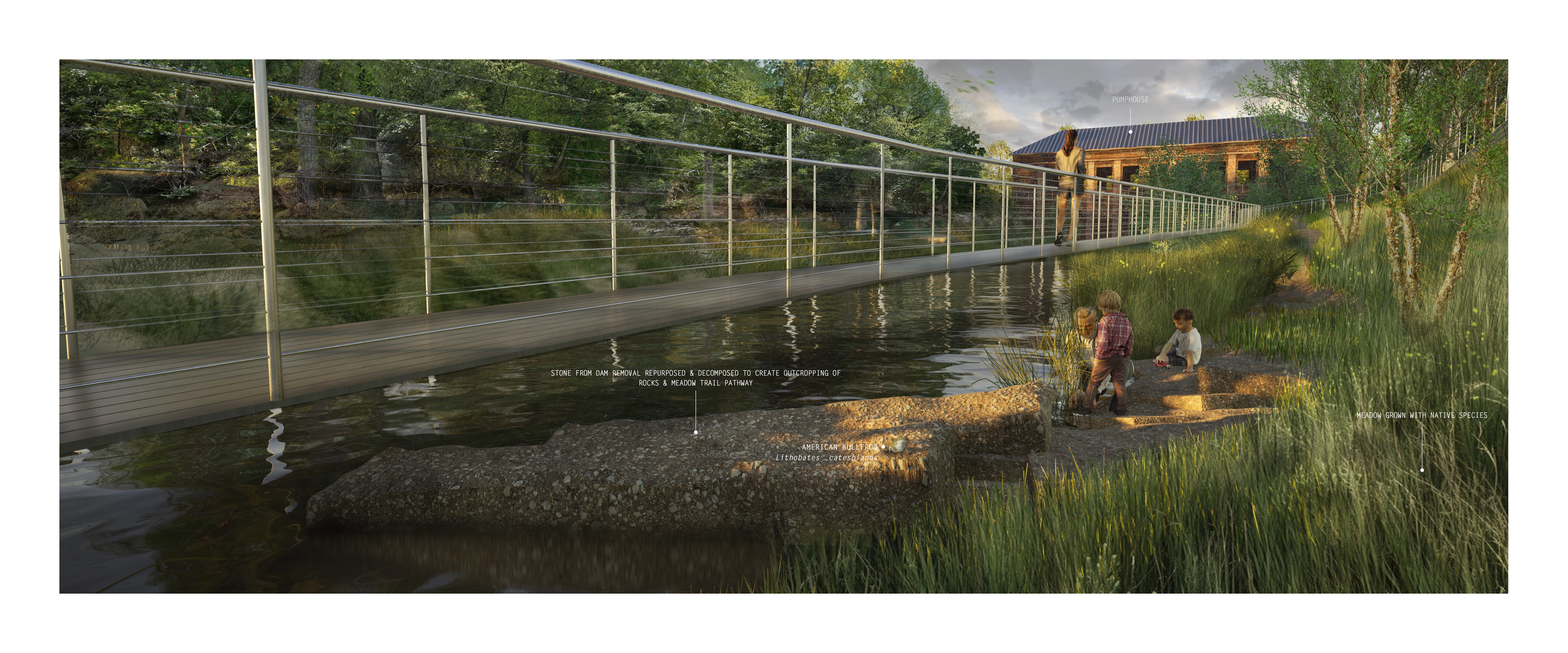 The design approach centers around the removal of the dam to enable fish passage and mitigate downtown flooding.Part of the design involves removing the forebay wall along with several feet of soil in order to enhance the river's capacity to hold water and manage river surges effectively. The design includes diverting a portion of the river where the forebay wall once stood. This approach reflects the historical operational path of the river, restoring where the water had previously flowed: through the forebay, into the pumphouse, and then pumped out downstream.