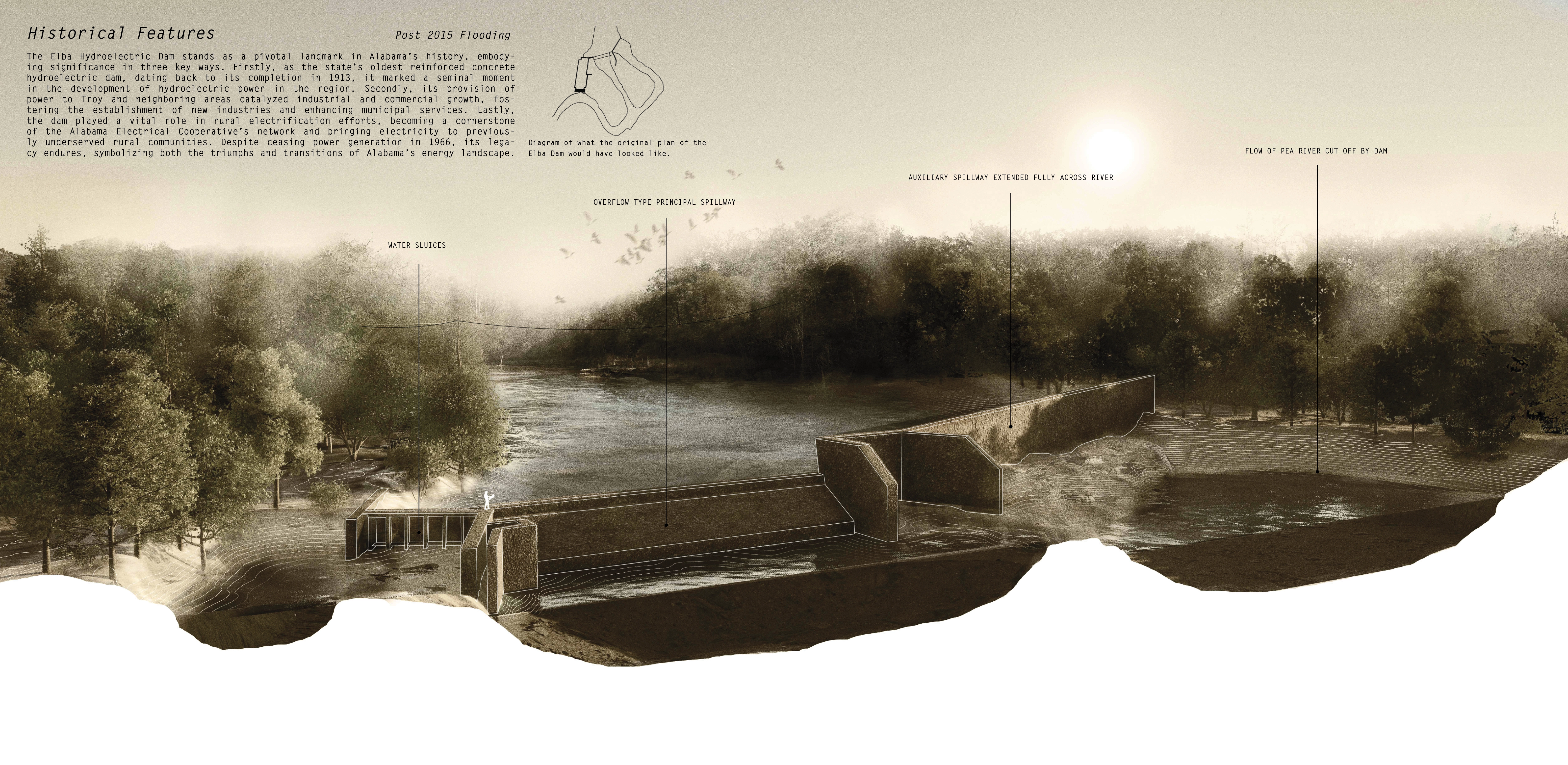 The revitalization of the Elba Dam honors the site’s historic structures, preserving them as living reminders of the role they played in powering the local communities of Elba, Troy, and Dothan until the dam’s decommissioning in 2015.This project seeks to transform the overgrown inaccessible hydroelectric dam into an engaging, accessible space that immerses viewers in a landscape reminiscent of past technological achievements. The design proposes for the removal of the dam to enhance environmental protection and bolster community resilience. Removing the spillway projects a 29% increase in access to critical habitat types utilized by threatened and endangered fish and mussel species, while also mitigating future flood risks in Elba.