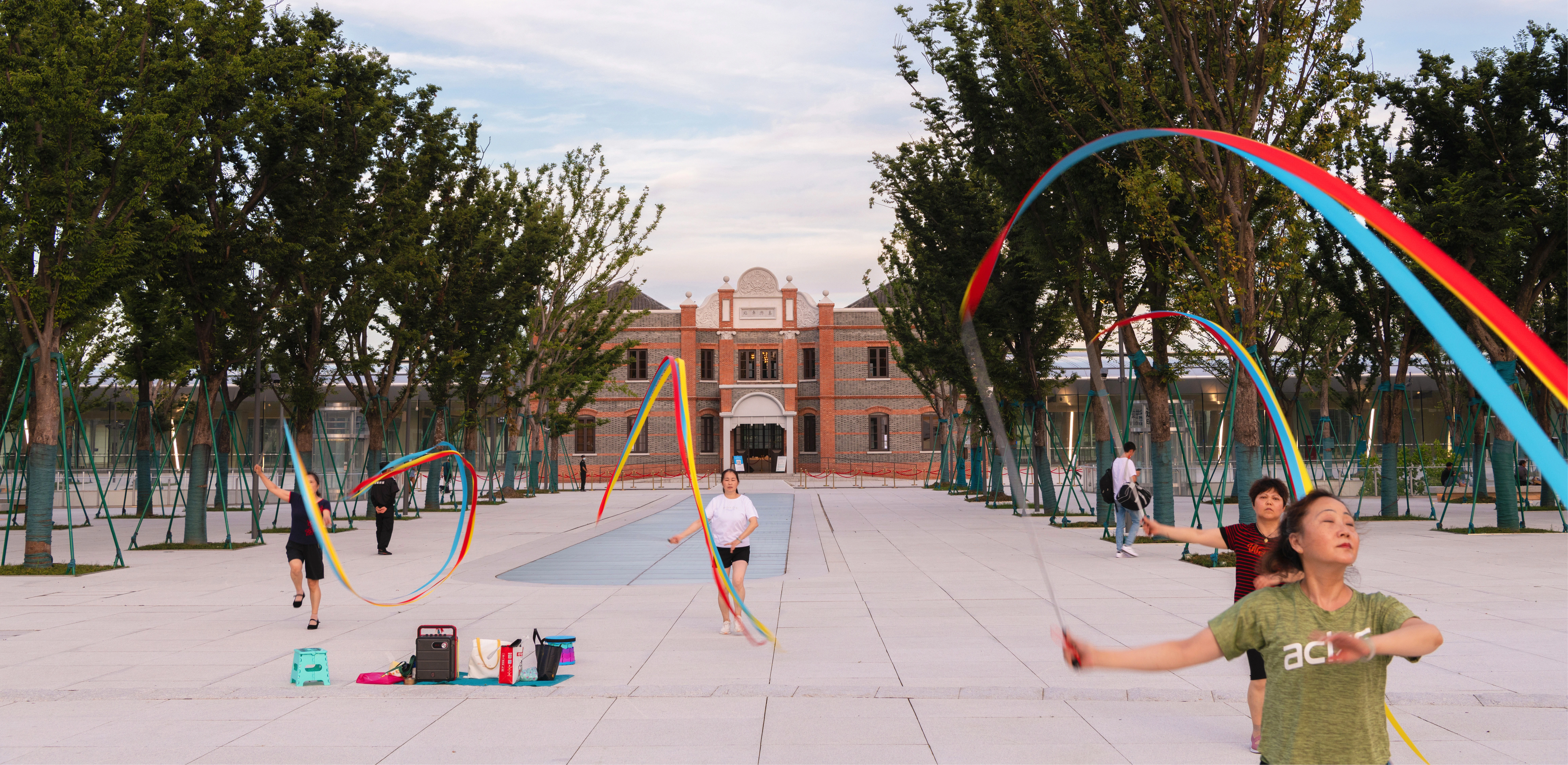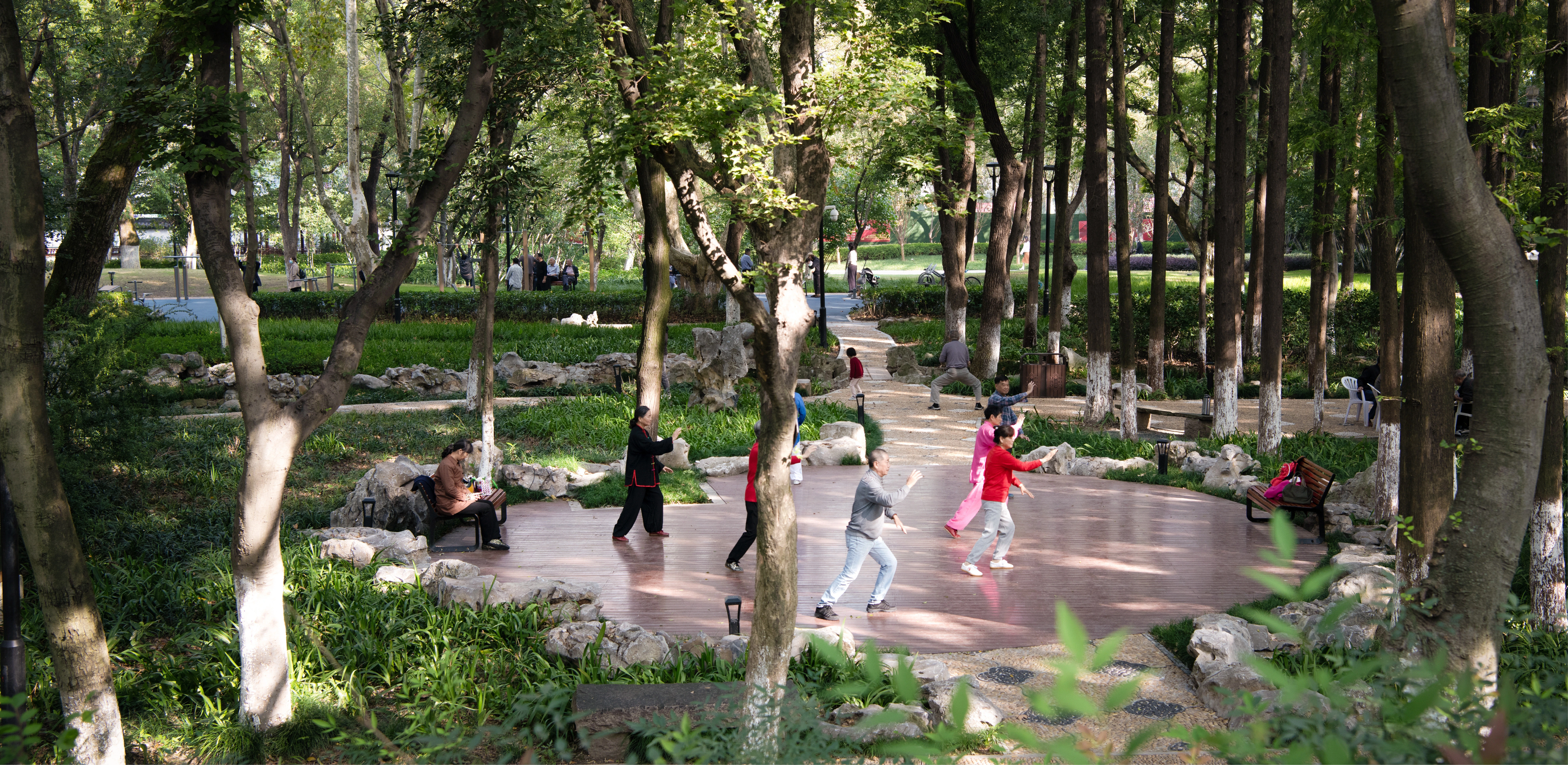 The park showcases civic and cultural spaces deeply rooted in the city's history. Abundant designed spaces beneath the woodland canopy offer neighbors the opportunity to engage in traditional activities such as Taiji, Kung Fu, singing, playing musical instruments, playing Go and Chinese chess, and writing calligraphy on the ground, especially during the hot summer months. The tree-lined plaza becomes a favorite space for locals to engage in square dancing, festival gatherings, as well as for students to join the English corner. The rooftop park is the first in the country to offer visitors a unique experience of overlooking the bustling train platform.