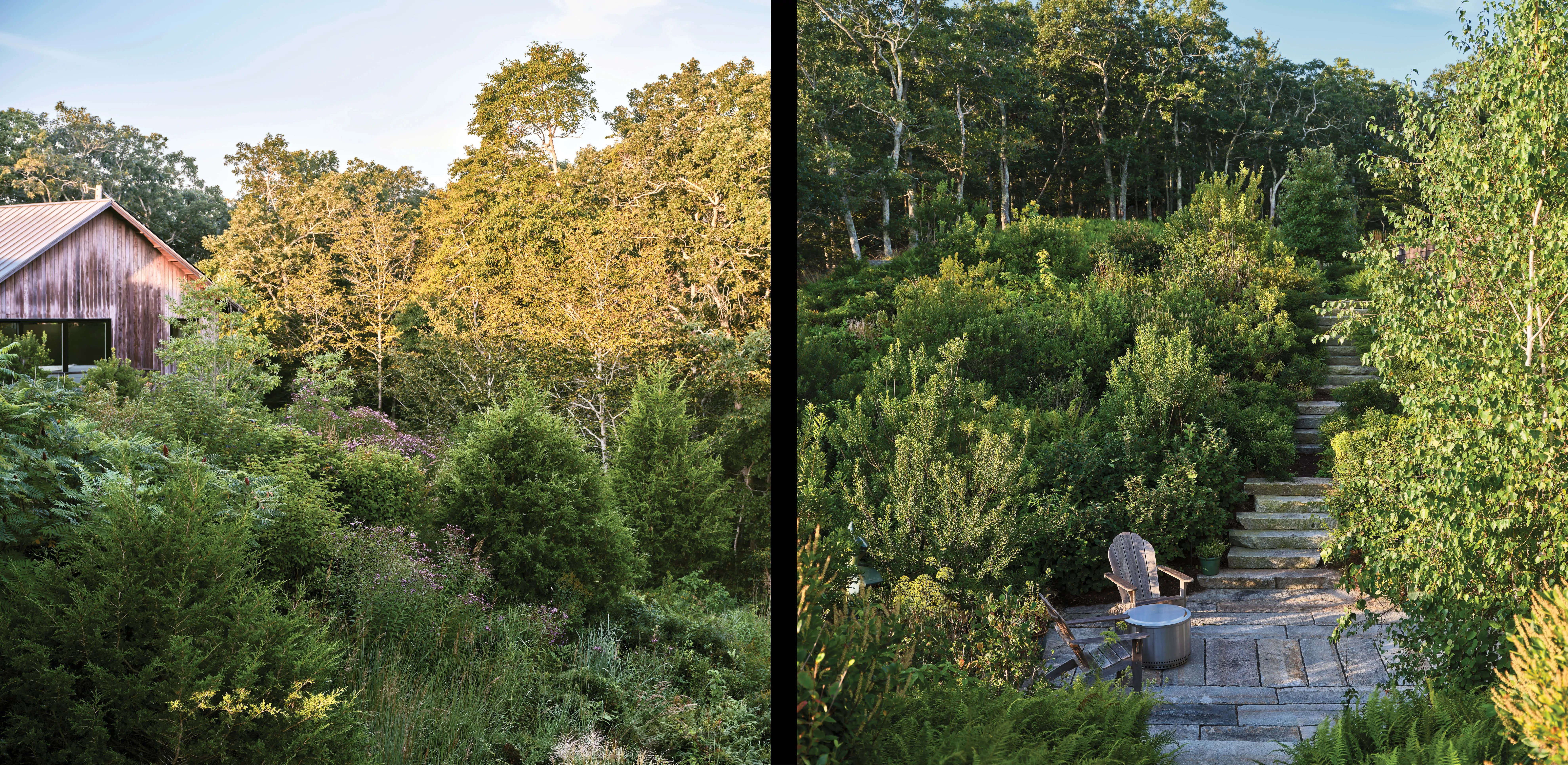 By the time the landscape architects joined the project, much of the land had already been cleared for house construction, leaving behind a barren, lifeless expanse surrounded by a sculptural beech, oak, and pine forest. Rather than replant the forest, the team embraced a successional native plant palette, crafting a mosaic of unique species assemblages that grew quickly into a thick vegetative armor that adapts to everchanging weather patterns. The challenge was to invite wanderlust through experiences that engage the site’s topography and to stimulate the island’s unique ecologies to return to the site where mature woodland once stood. The resulting landscape blends strength with beauty, offering dynamic multiseasonal interest, increased habitat, and expansive biodiversity.