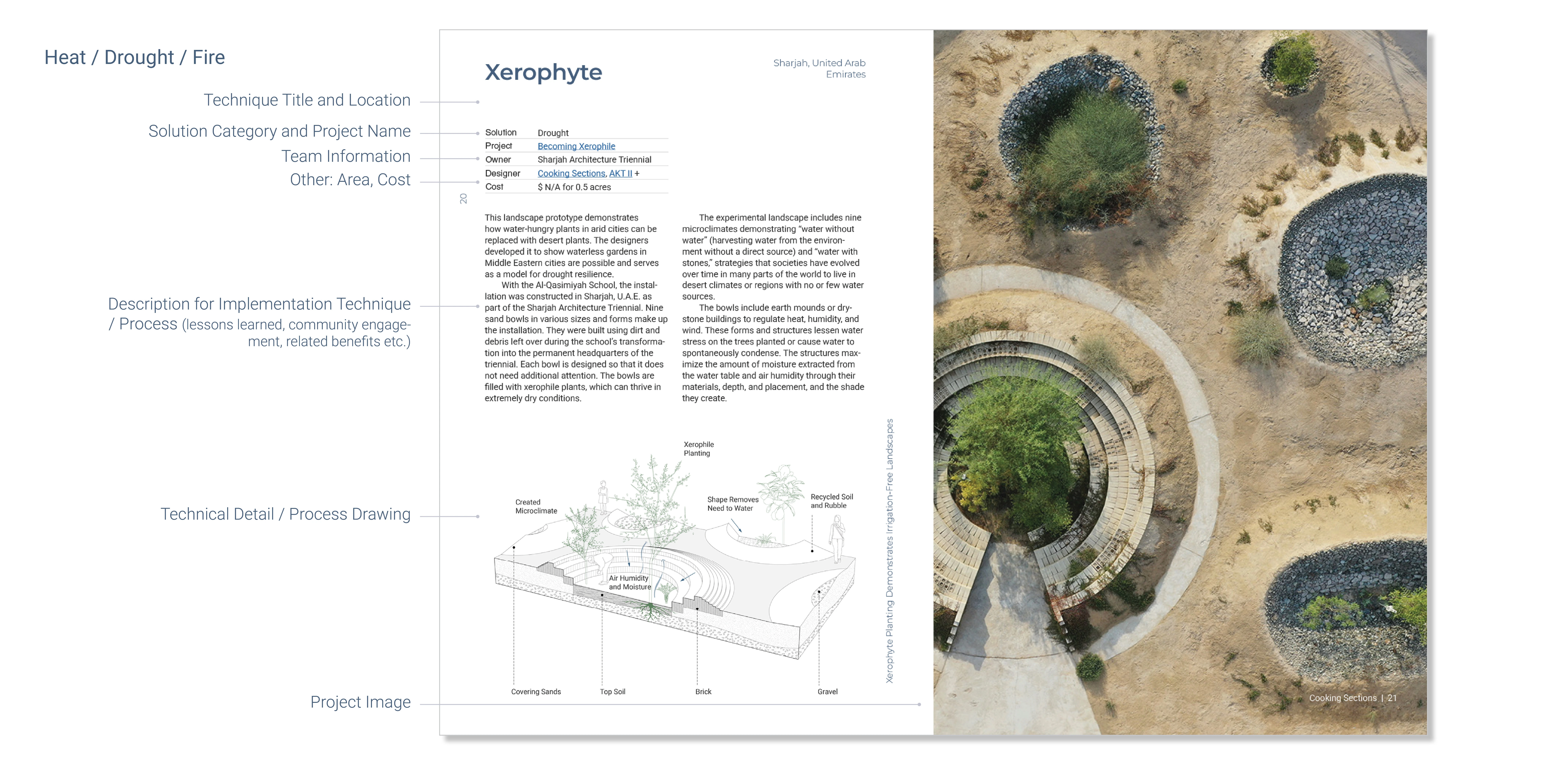 Each project showcases a technique with insights on community engagement, project team, lessons learned, a technical detail or process drawing and a project image that makes the content accessible to a broader audience.