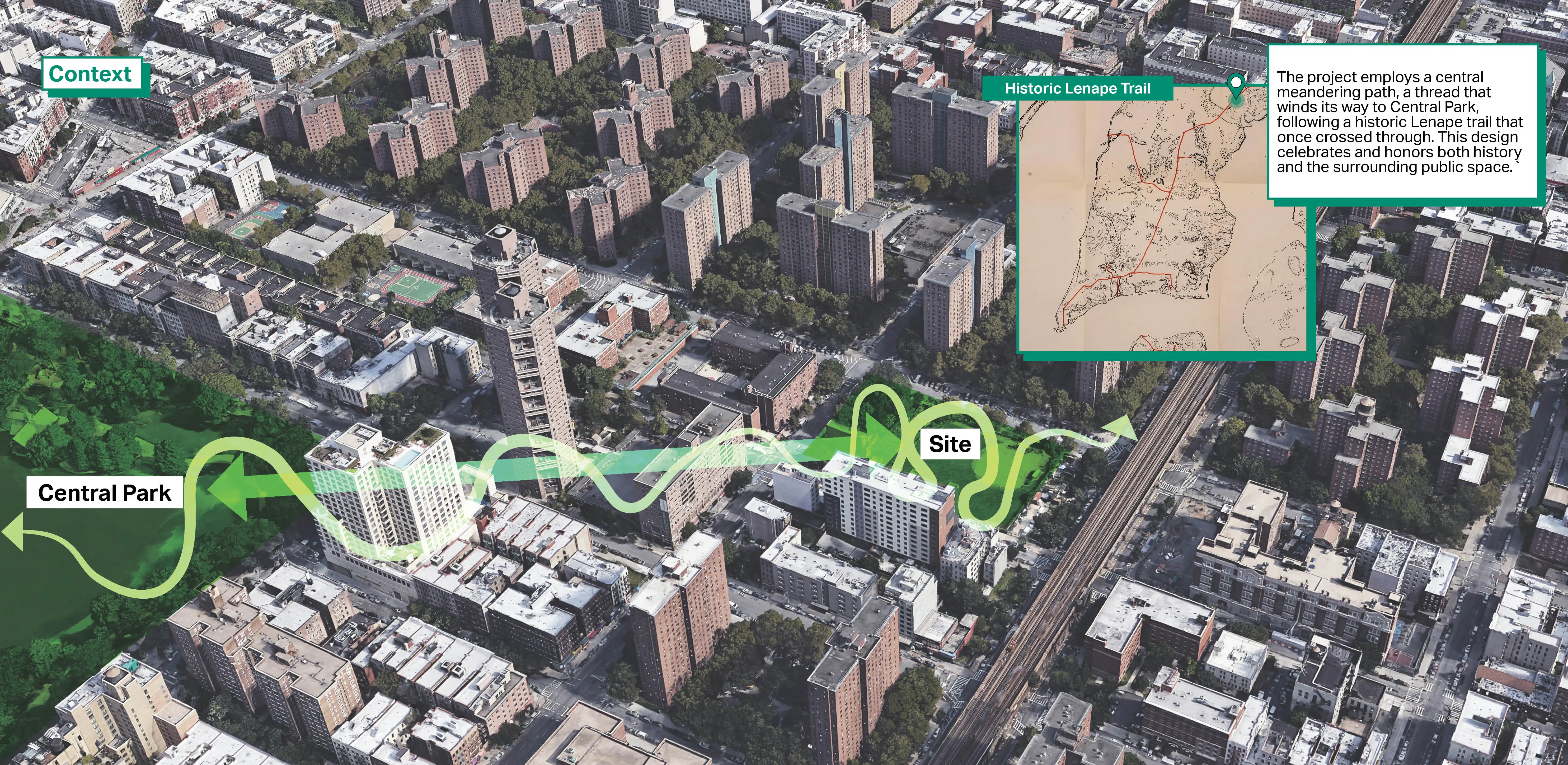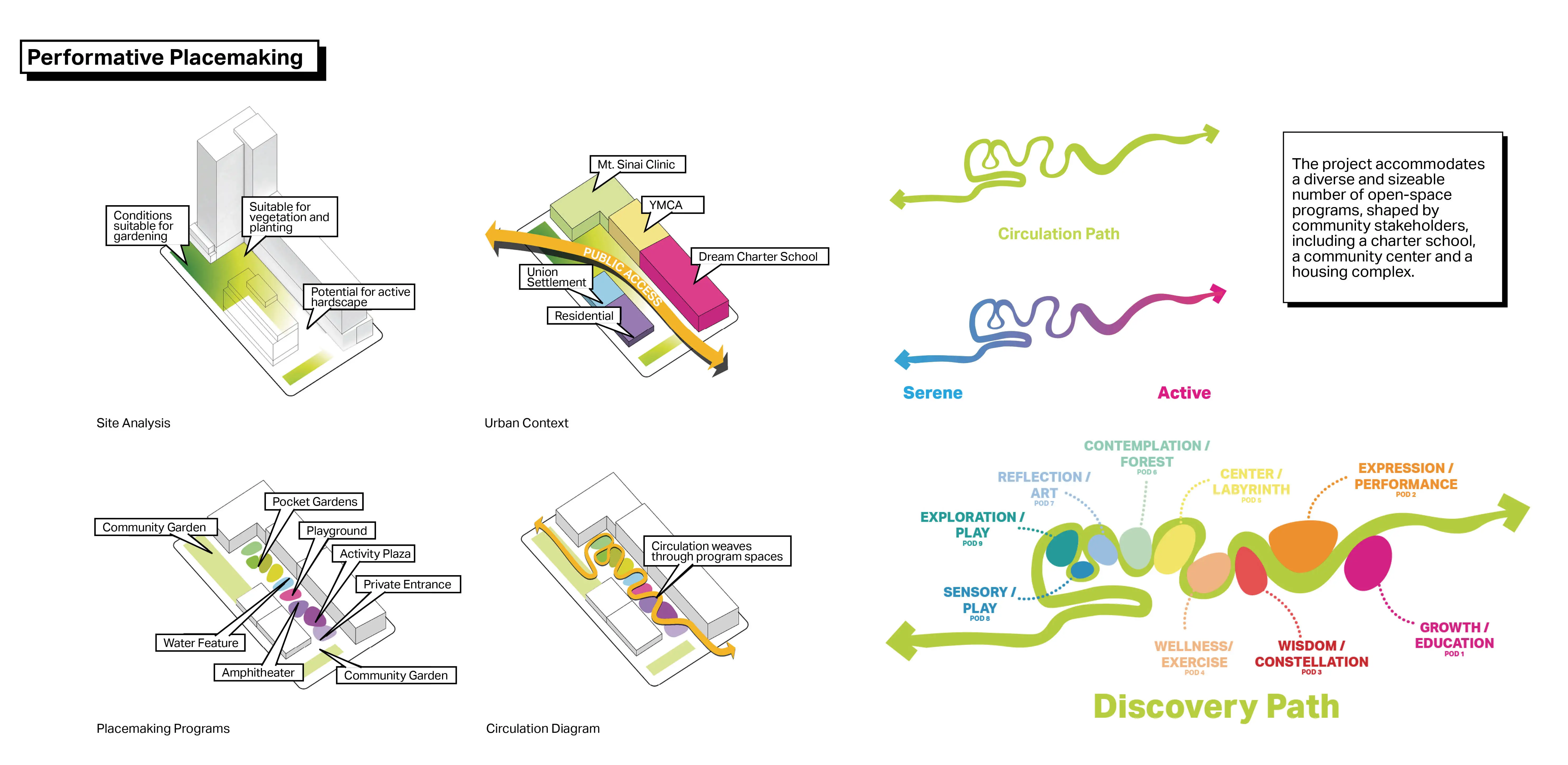 The design for Sendero Verde took a cue from an historical Lenape trail that once traversed the site. The project is arranged around a central meandering landscaped path, which weaves through the project from Park Avenue to the western end of 111th Street and Madison Avenue. The building massing is broken down into three separate volumes which frame this path, creating a central courtyard. This courtyard spills out onto different levels, creating opportunities for placemaking. The meandering pathway of Sendero Verde links a variety of programmed landscapes, creating spaces that cater to all types of users. The project accommodates a diverse and sizeable number of open-space programs, shaped by community stakeholders, and includes a charter school, a community center and a housing complex. Sendero Verde showcases how urban landscapes can creatively address complex spatial, structural, and accessibility constraints while maintaining a welcoming and inclusive environment for its residents and the local community. This design connects users of all ages to their environment through a strategy that incorporates native plants resilient to the site’s on-structure conditions. Active and passive program zones are surrounded by diverse plant communities, creating shaded spaces for learning about urban ecologies in both intimate moments and gathering spaces.