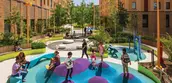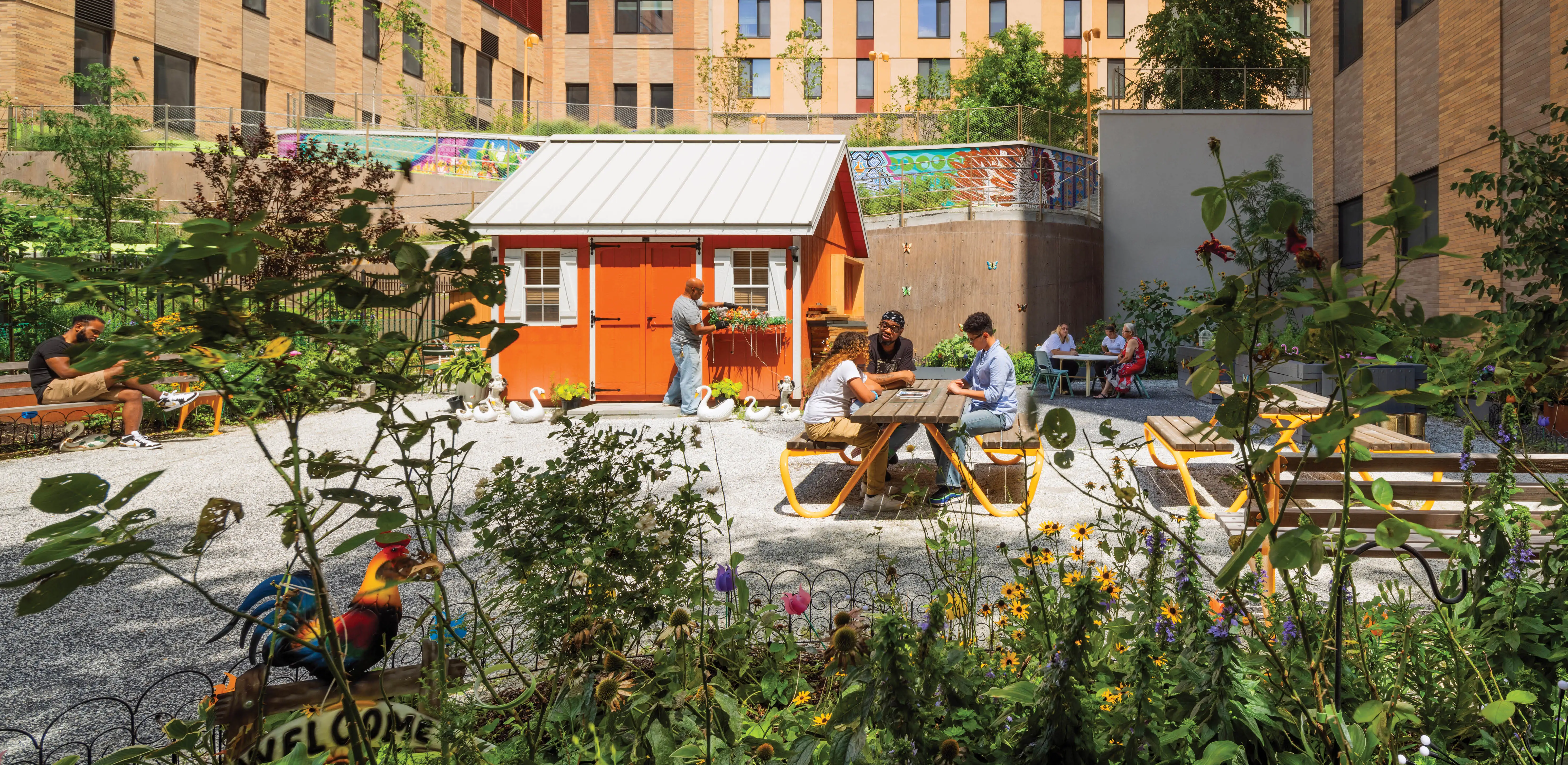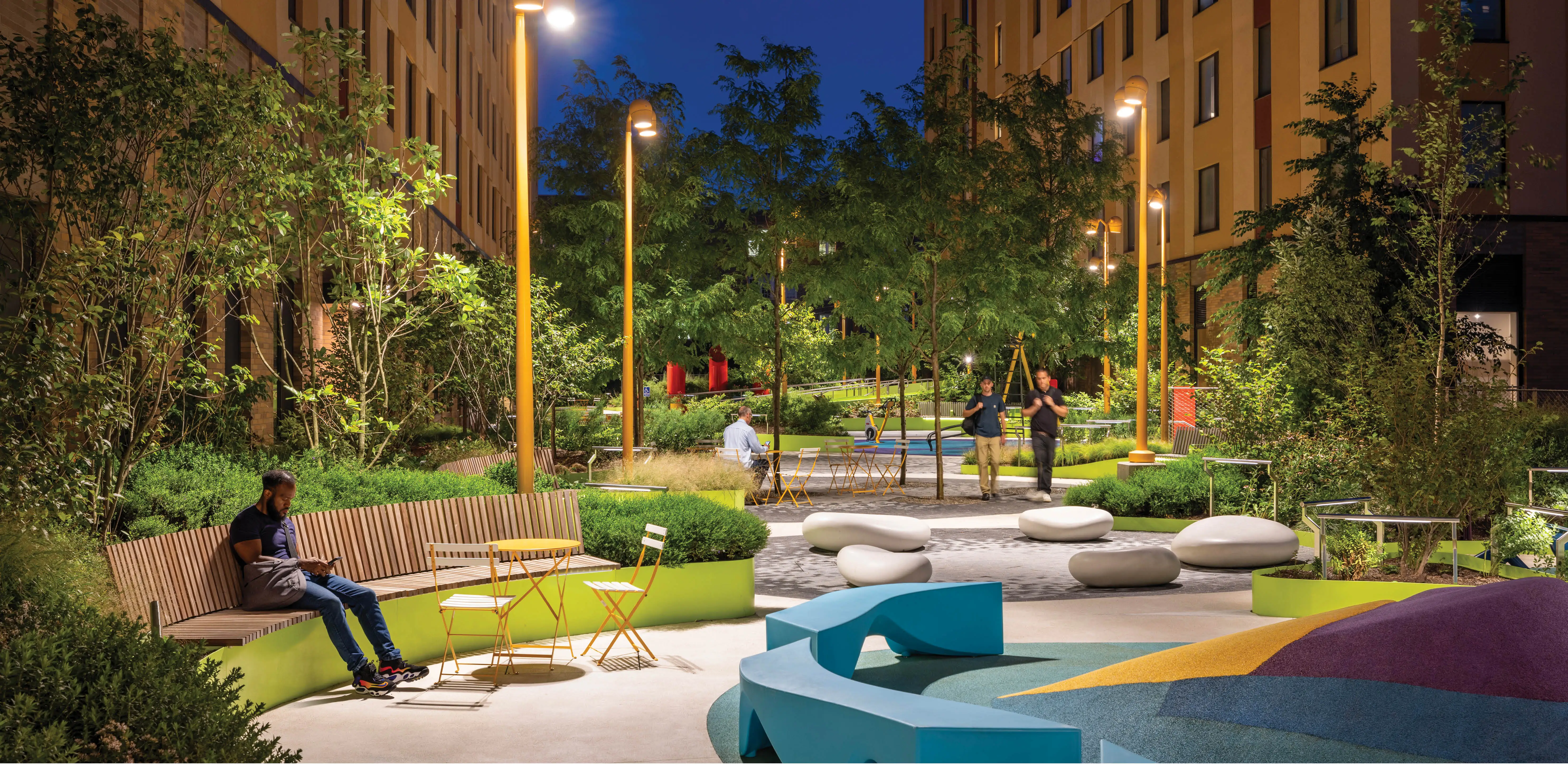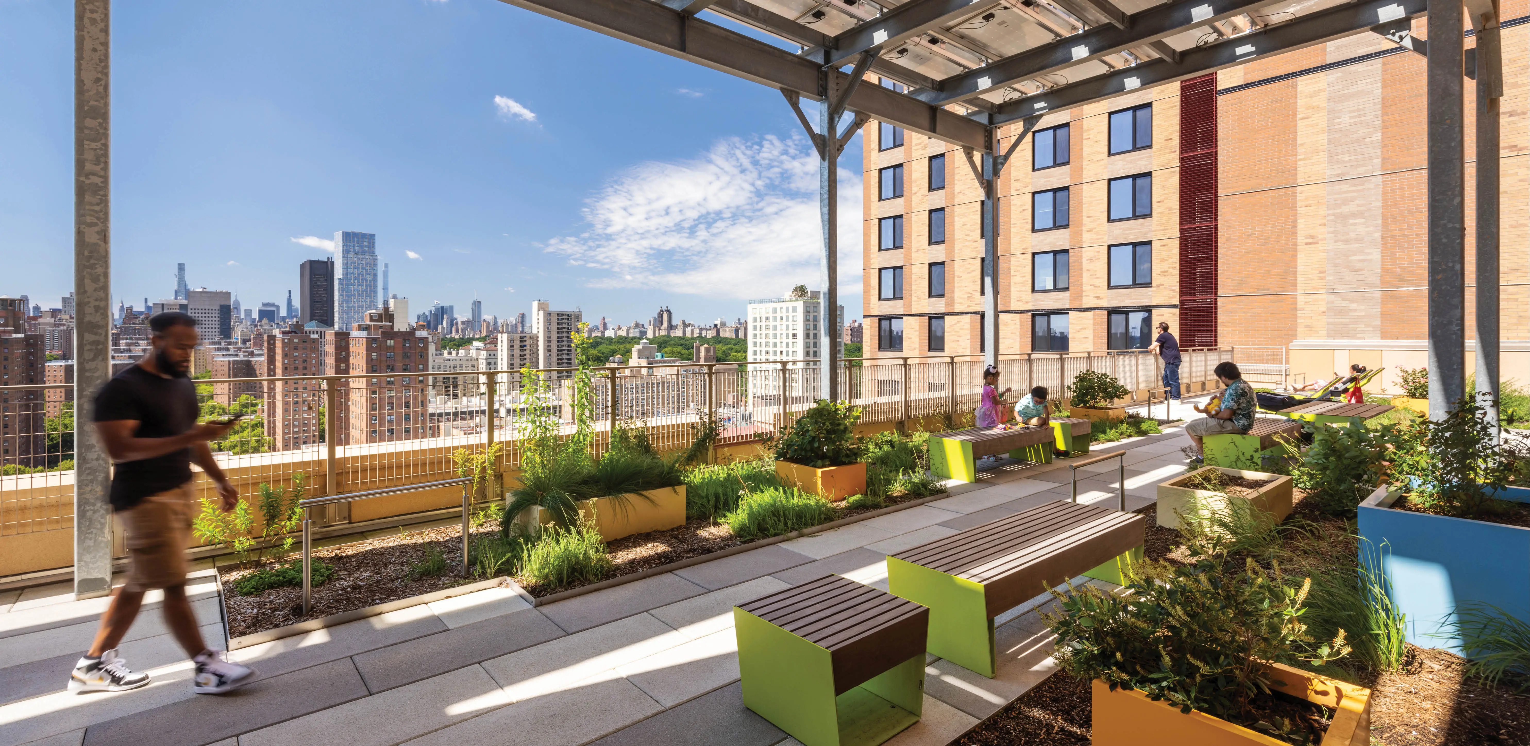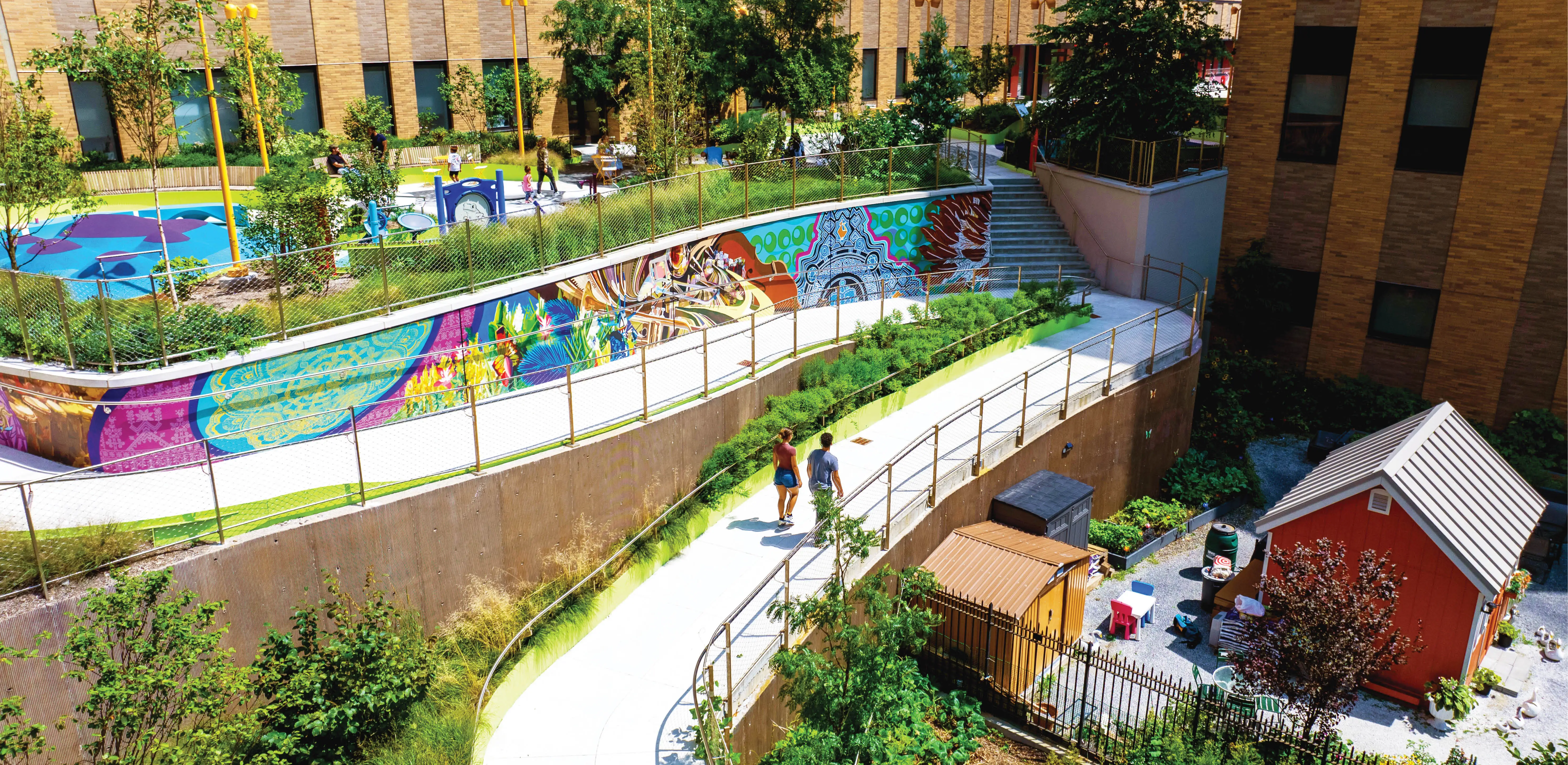 Sendero Verde serves over 700 households in a sustainable, fully affordable development that is the world’s largest Passive House-certified project. The heart of the complex is the publicly accessible elevated courtyard, a shared green space intentionally positioned above street level to offer a peaceful, protected environment. The courtyard features intimate pods for quiet conversation, interactive zones for exercise and play, and a spacious plaza with a performance podium, which hosts community gatherings, cultural celebrations, and artistic performances. This area is specifically designed to foster a strong sense of belonging and social cohesion, celebrating the diverse cultural identity of East Harlem.