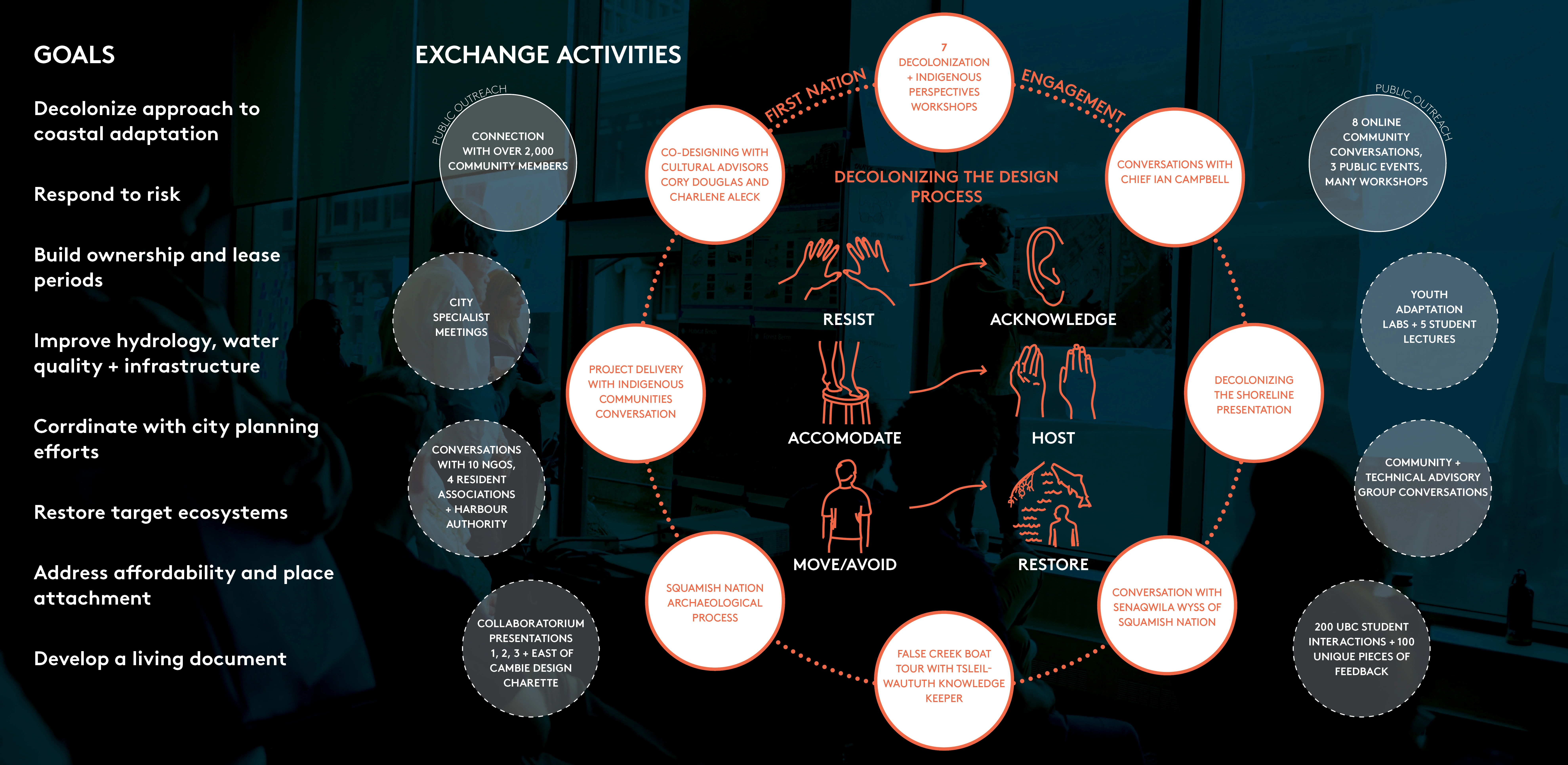 RECIPROCITY AND EXCHANGE Vancouver is situated on the unceded traditional homelands of the xwməθkwəy’əm (Musqueam), Skwxwú7mesh (Squamish), and səlilwətaɬ (Tsleil-Waututh) Host Nations. The area currently known as False Creek has significant meaning to Host Nations who have stewarded the land since time immemorial. Today, the shoreline is a major destination for residents and visitors, and vulnerable to flooding as sea level rises to one meter and beyond in the coming century. The Sea2City Design Challenge was a 12-month initiative to reimagine Vancouver's False Creek shoreline in the context of reconciliation between Host Nations, the City, the province and wider community. Embodying values of reciprocity and exchange, this challenge positioned teams as collaborators rather than competitors, with shared cultural advisors and “collaboratorium” workshops with the city and both teams. The design outcomes inform a framework and vision that prioritizes reconciliation with Host Nations to guide City and regional Coastal Adaptation Plans.