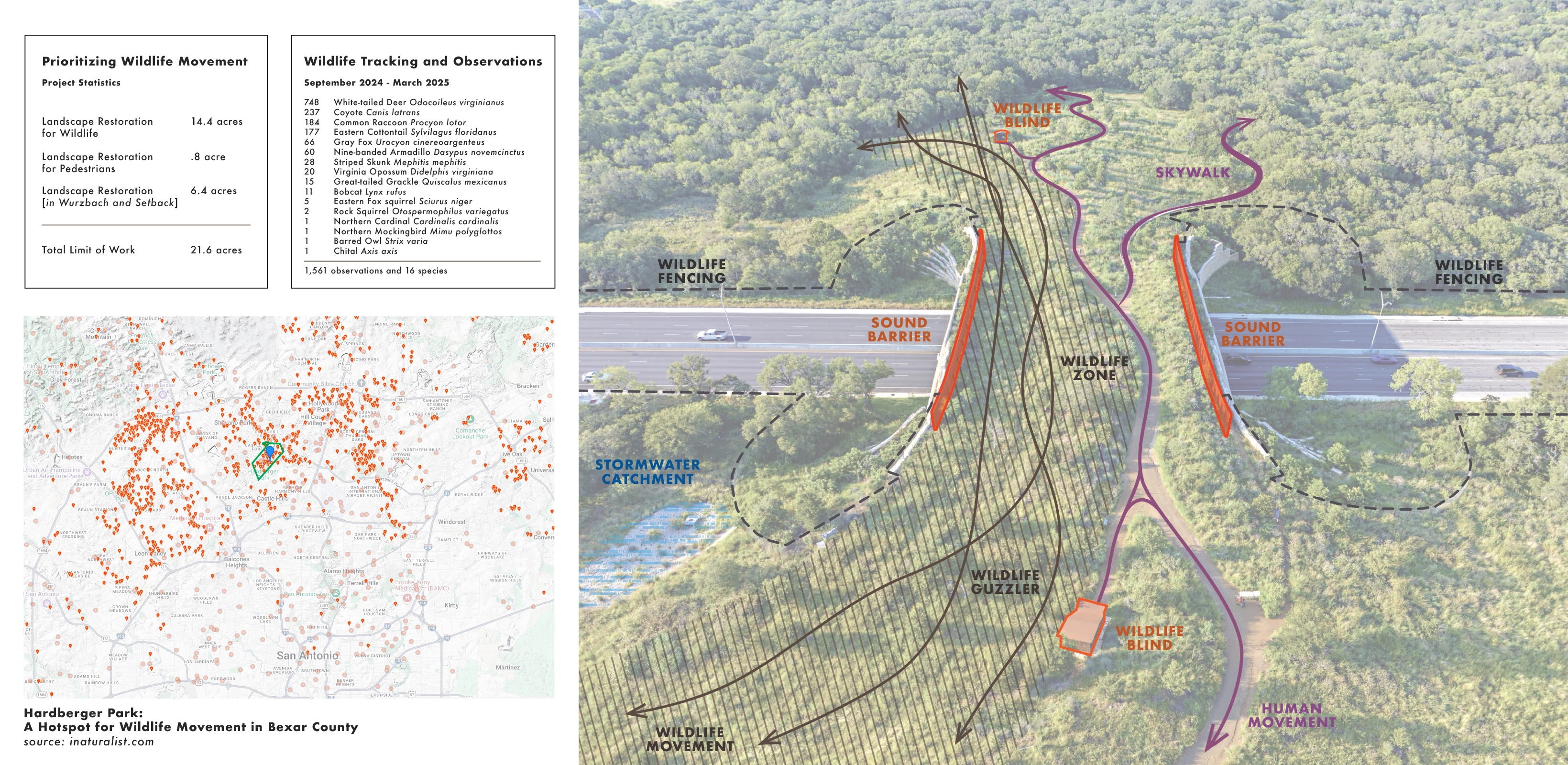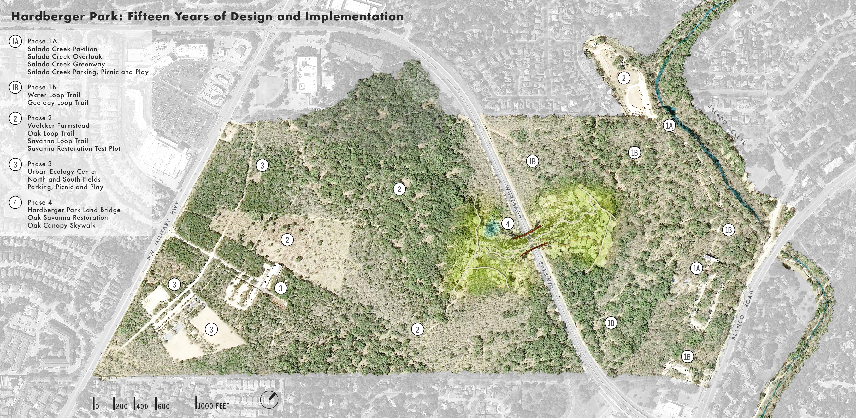 Phil Hardberger Park, is a 330-acre urban park in San Antonio, the 7th largest city in the United States. Designed in phases from 2007-2019, the park opened to the public in 2010 as a cultivated wild, where trails wind through preserved woodlands and restored savanna, with parking, picnic and play carved from scrubland. For over a decade, the park existed as two parcels and the last piece of the Comprehensive Plan, the land bridge, remained unrealized. Six lanes of Wurzbach Parkway severed the landscape, creating a barrier for humans and causing fatal collisions for wildlife migrating along the 38-mile-long Salado Creek. The land bridge was finally realized through a 2017 voter-approved city bond of $13 million and $10 million in grants and donations. It opened to the public in December 2020 and the park sustains 750-1,000 visitors per day. The project demonstrates a union of urban wildness and city-wide activism.