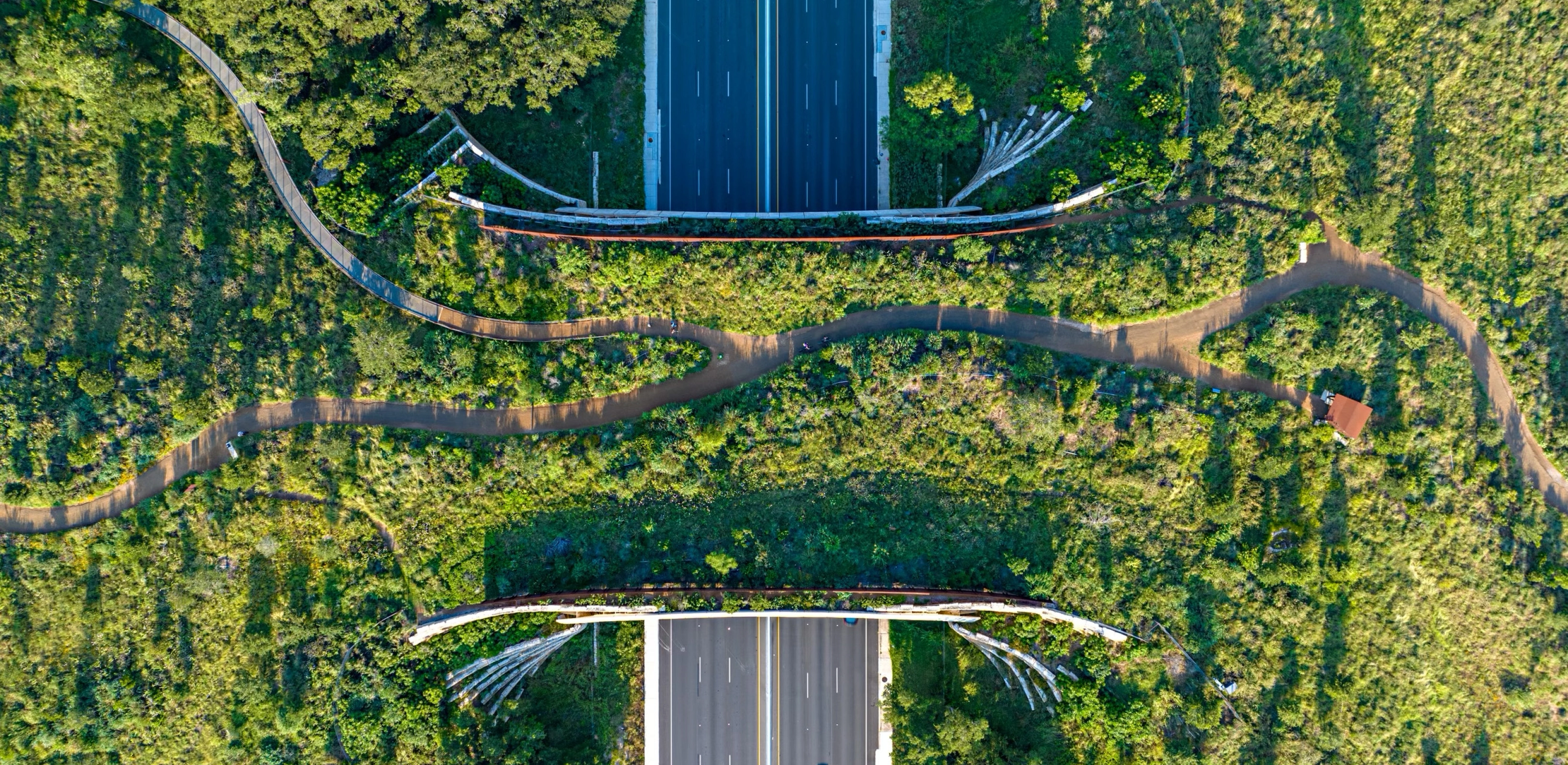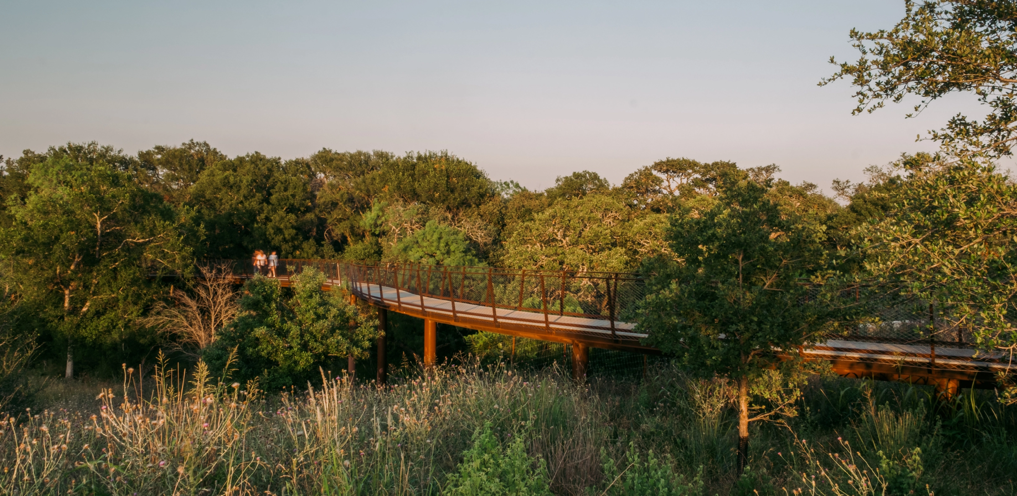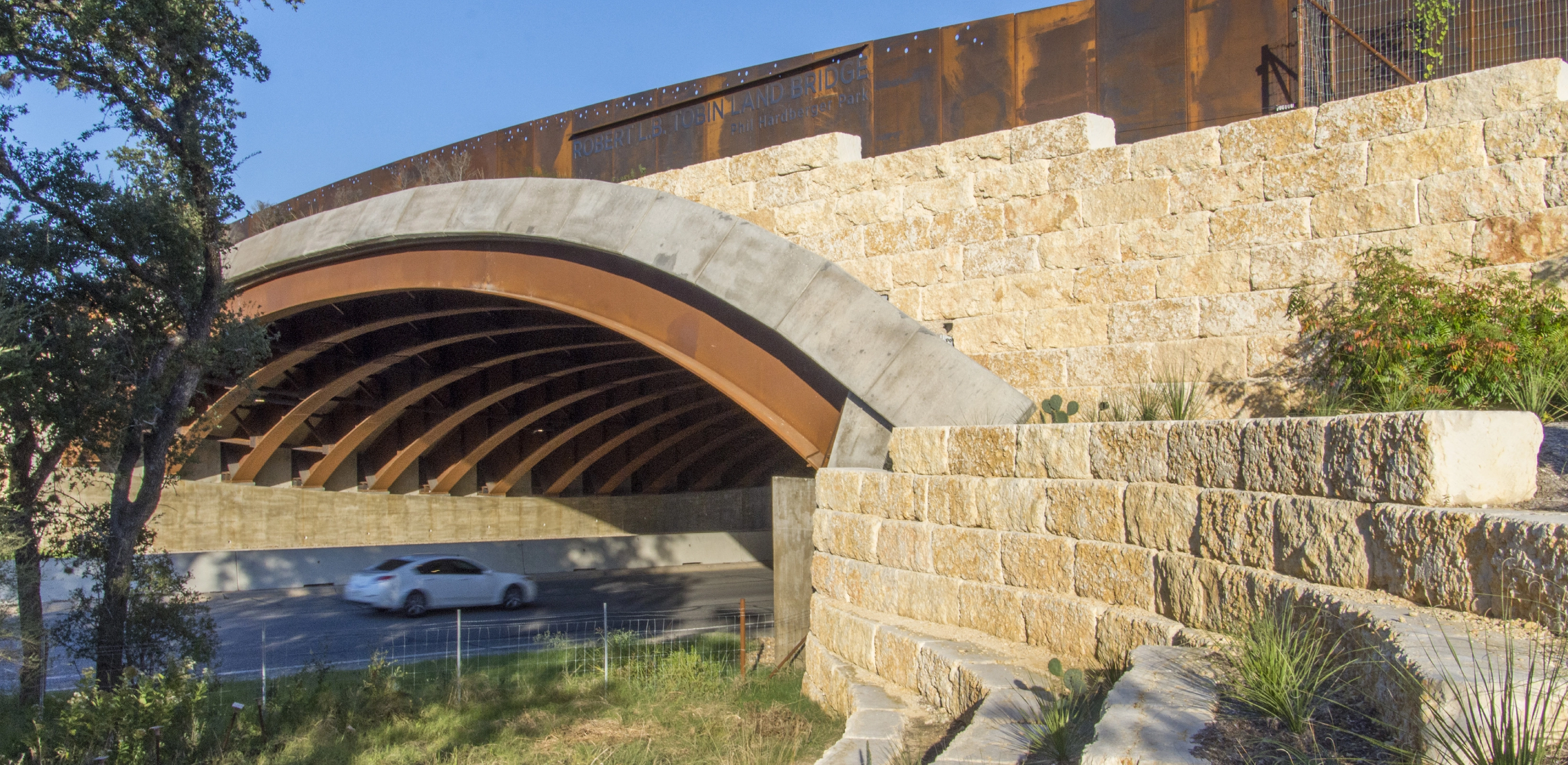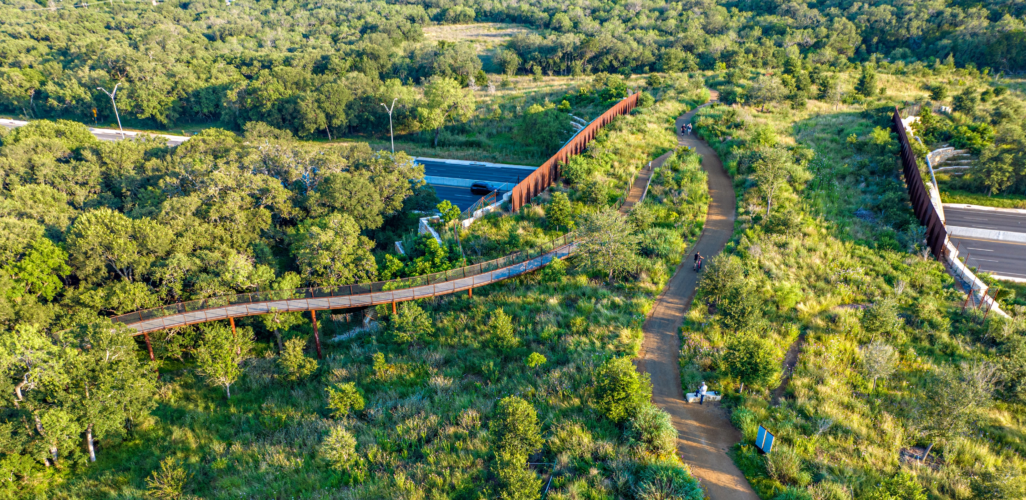 Wildlife biologists educated decisions on bridge dimensions and habitat requirements to maximize animal crossings. Passage is guided by 3,300 linear feet of barrier fencing along Wurzbach, directing animals upwards, while berms and plantings provide continuous cover across the structure. The bridge diversifies habitat with over 50 reintroduced species, many bearing fruits, providing shelter and supporting prey species. Before the first anniversary of the bridge, every mammal species known to reside within the park was captured on the land bridge’s trail cameras, including bobcat, white-tailed deer and ringtail cat.