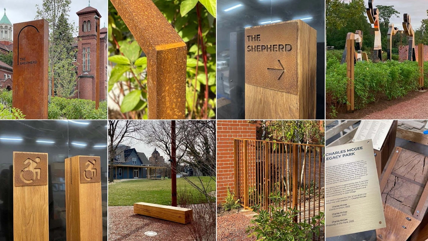 Design Approach - Materials and Planting: Walking around the neighborhood, the team found great beauty in materials and textures. The design team chose to embrace the story of the site, celebrate the broken glass, brick, and decay, and explore an artful and sustainable approach to material reuse. To achieve drainage requirements, porous paving is used extensively. Bricks were salvaged from the church’s decaying nunnery, then crushed and integrated with the site's paving. Local recycled glass—tumbled and rounded—was used in the paving, paying homage to the church’s stained glass windows. The glass gravel is placed in the meditation loop, following the logic of a ROYGBIV color wheel, referencing the identity of the community as an arts hub. Wood was salvaged from local trees downed during storms. For the project, the team designed furniture, signage, and wayfinding, using the reclaimed wood, and working with a local fabricator, creating a unified material vocabulary.