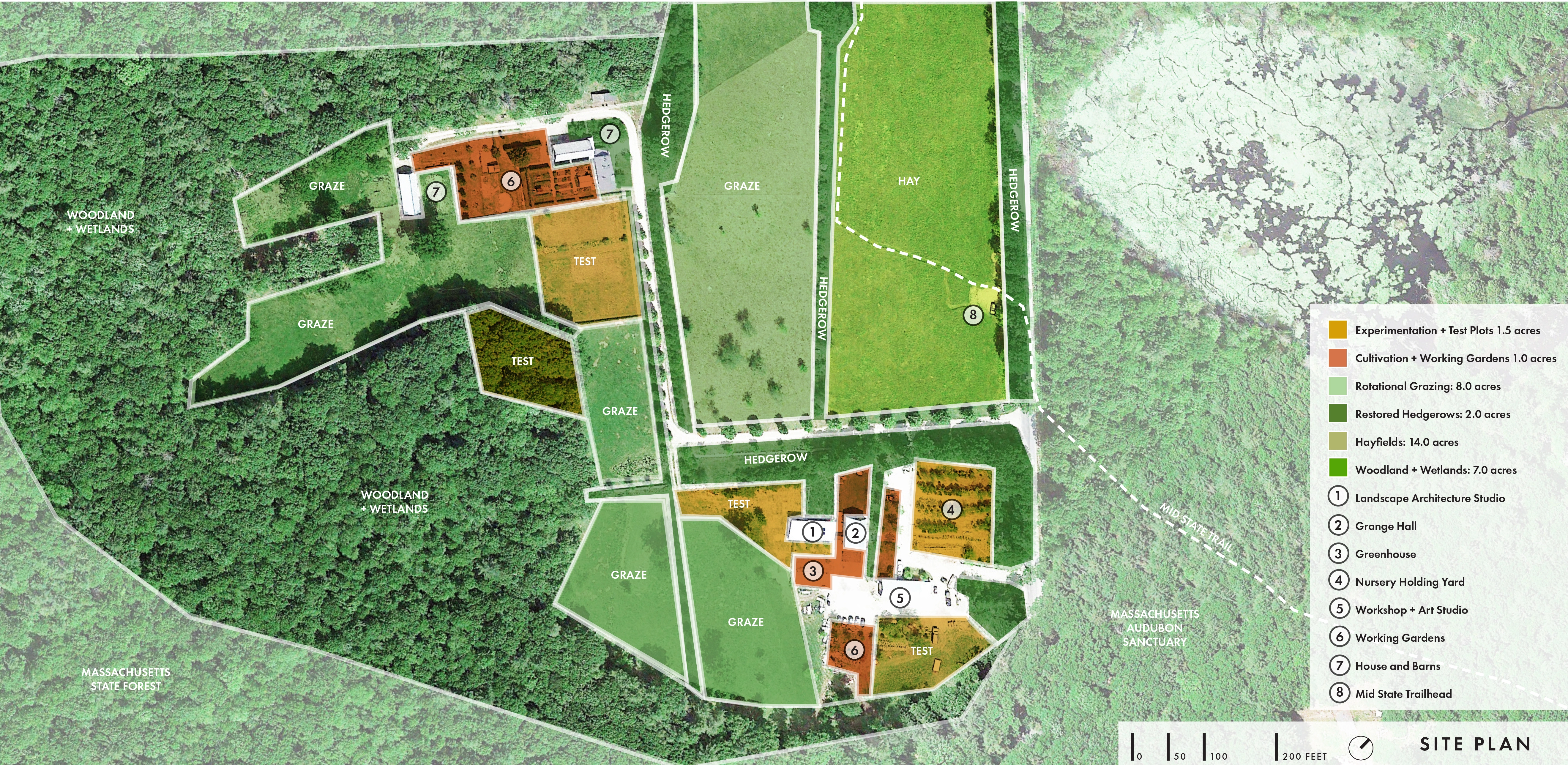 HOMESTEADING AND FARMING Charbrook is located in Nipmuc territory in rural Massachusetts. We began homesteading by rebuilding stonewalls and reclaiming invasive shrubland for grazing livestock. Pastures were re-seeded and farm lanes were planted with rows of native hardwoods. Five acres of fields and edge habitat were restored. Soon after, a house, barn and coop were constructed using our own red oak. Working gardens, pasture and meadows were established for vegetables, cows, sheep and wildlife. The farm abuts Audubon and State land, with the MA Mid State Trail running through, testing the idea that agriculture is compatible with restoration ecology. We oversee a twenty-acre plant nursery, fifty acres of hayfields, and a mosaic of woods and wetlands. As landscape architects, our instincts, spontaneous trials and experiences here have taught us the most about horticulture, craft and construction. After our second child was born, we realized our practice could benefit from this unique relationship with the land, and Charbrook has evolved into a place of mentorship, beyond the traditional studio.