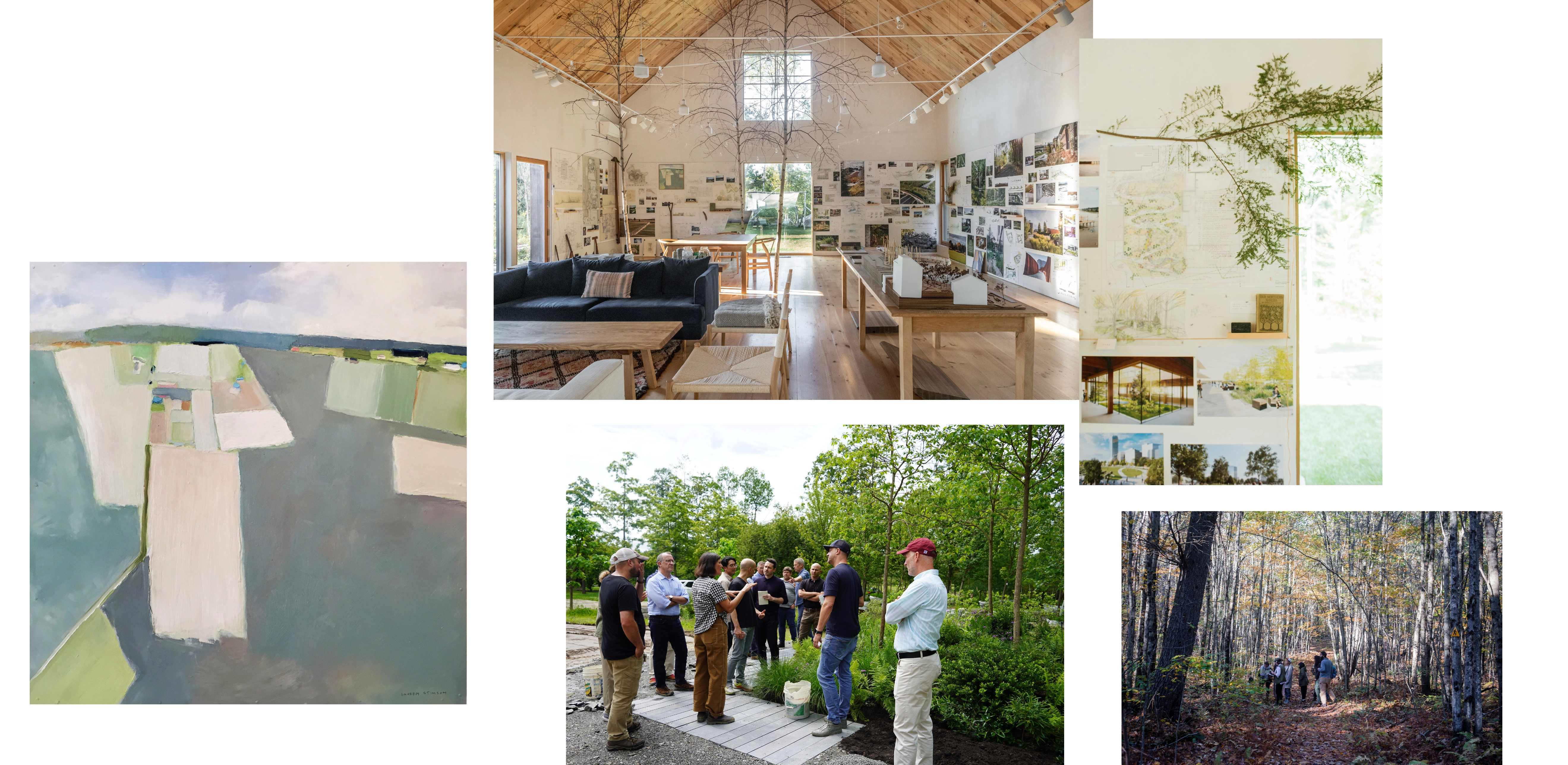FIELDWORK AND PRACTICE In 2020, a trio of buildings were completed, expanding Charbrook’s role in our practice. A studio, grange hall and greenhouse were constructed on the lower pasture using passive-house standards and sustainably harvested site timber. The farm has become a series of exploratory plots where we study materials, test planting strategies and experiment with field-based design. We have the construction equipment and ability to build mock-ups and host charrettes and farm tours. Students from design programs come for nursery dig and plant days. Lectures, exhibits and events engage the broader public. Charbrook is at once a home and a place of inquiry, making, and community—where the act of designing is inspired by the rural landscape.