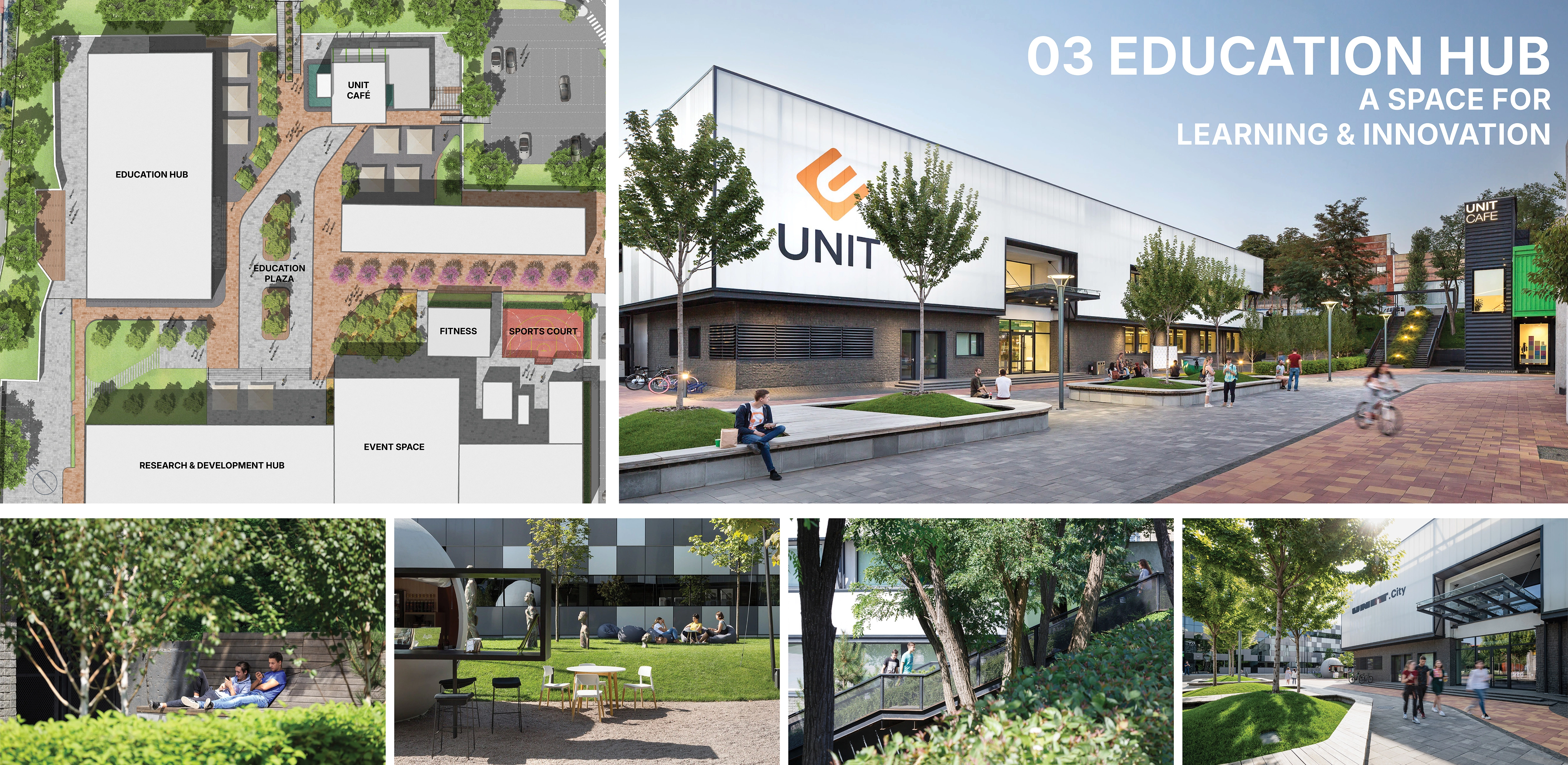 UNIT.City transforms a post-industrial site into an innovation district where education, work, and public life seamlessly intersect. The redevelopment reclaims a once-restricted area, establishing a walkable, climate-responsive urban environment that enhances connectivity with the city. A landscape-first approach defines key public spaces — including Event Plaza, pedestrian streets, an education hub, and rain gardens — that foster social interaction, biodiversity, and urban resilience. By prioritizing pedestrian-friendly design and green infrastructure, UNIT.City sets a precedent for adaptive, sustainable urban transformation, redefining how cities repurpose industrial heritage into thriving, future-ready districts.