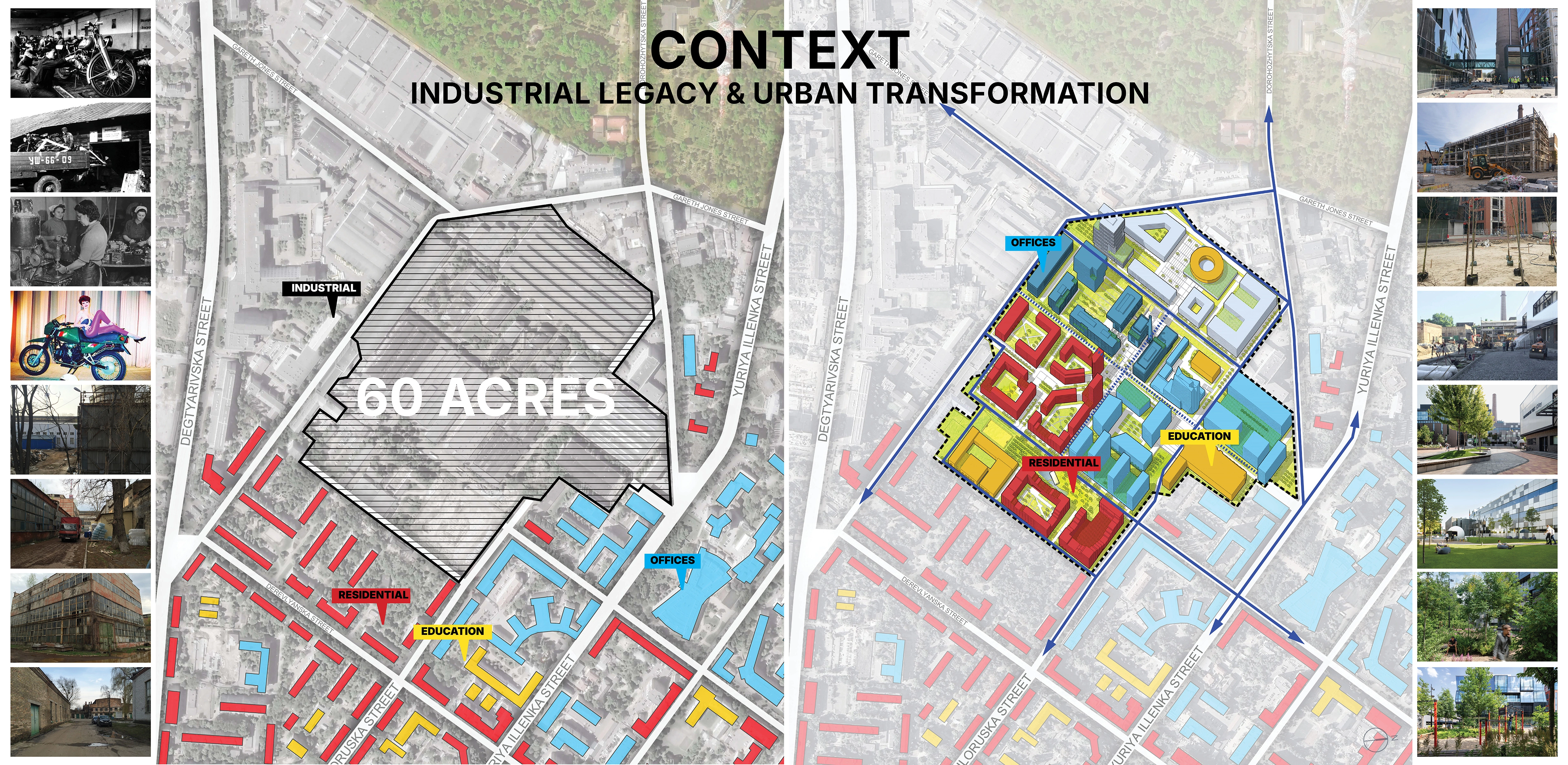 Reintegrating the site – reconnecting the once-isolated industrial zone with Kyiv’s evolving urban fabric Honoring industrial heritage – adapting its legacy to create a future-proofed innovation ecosystem Shaping a climate-resilient public realm – designing inclusive, pedestrian-first spaces that foster social, educational, and economic interactions