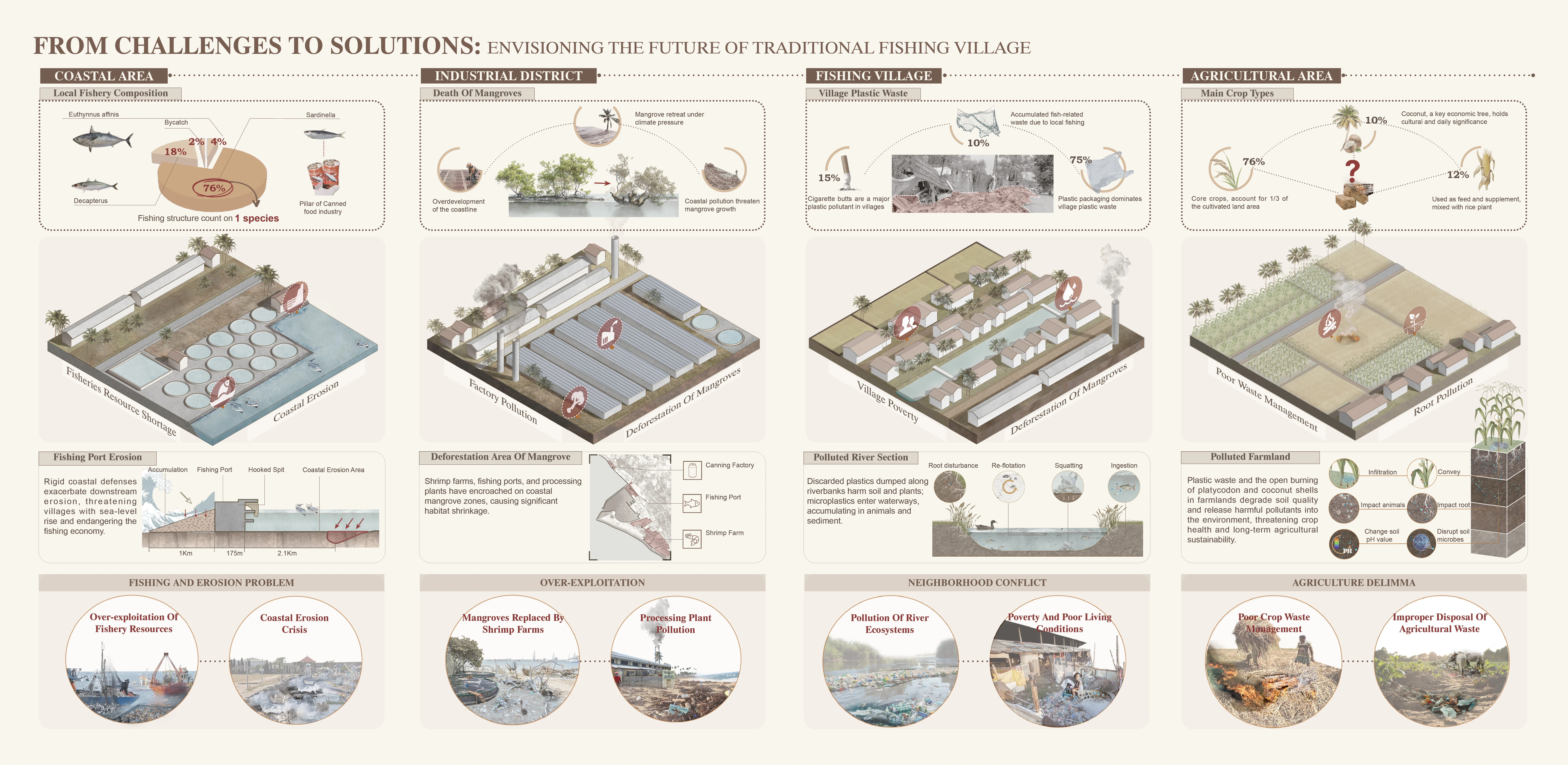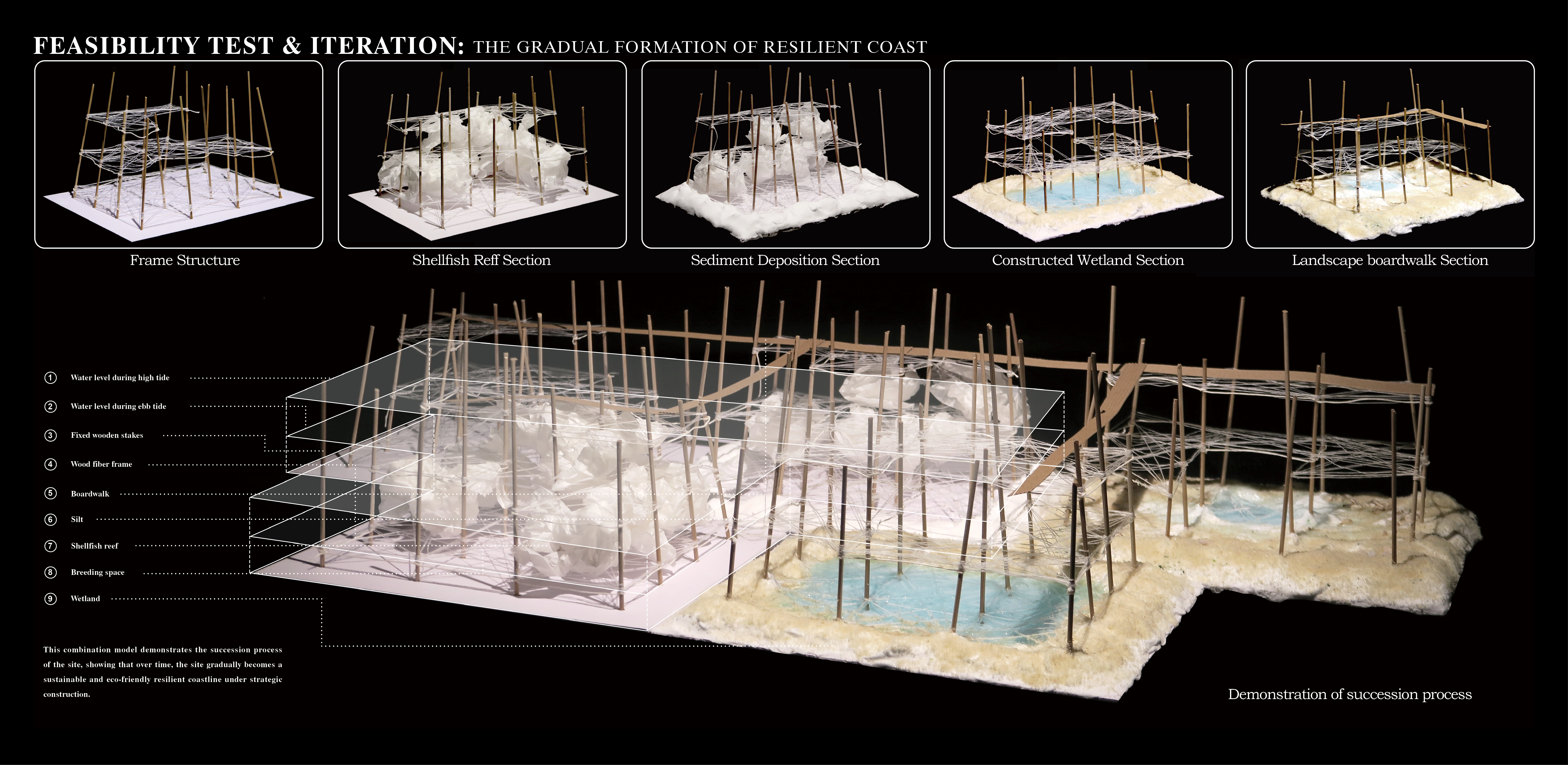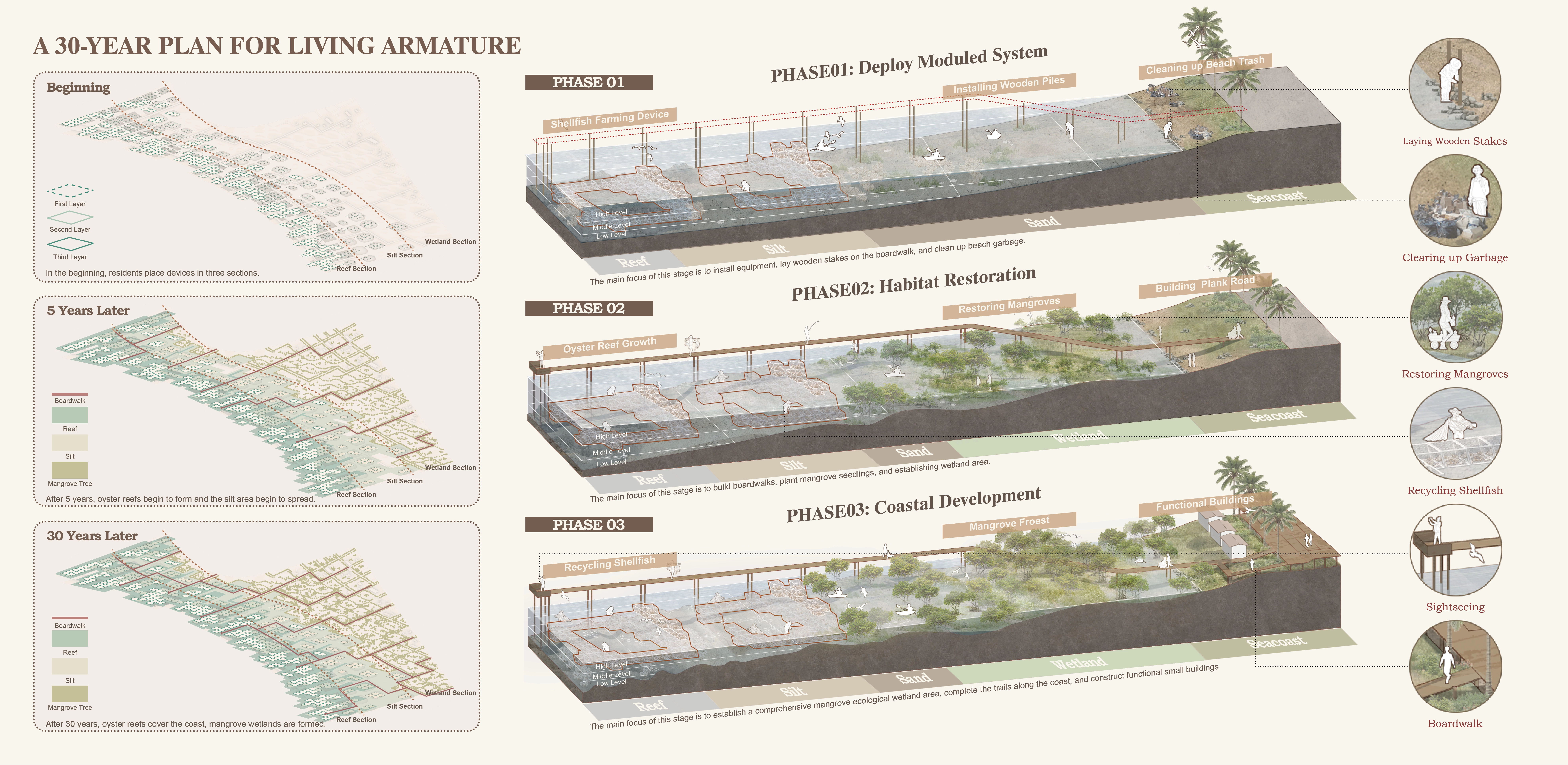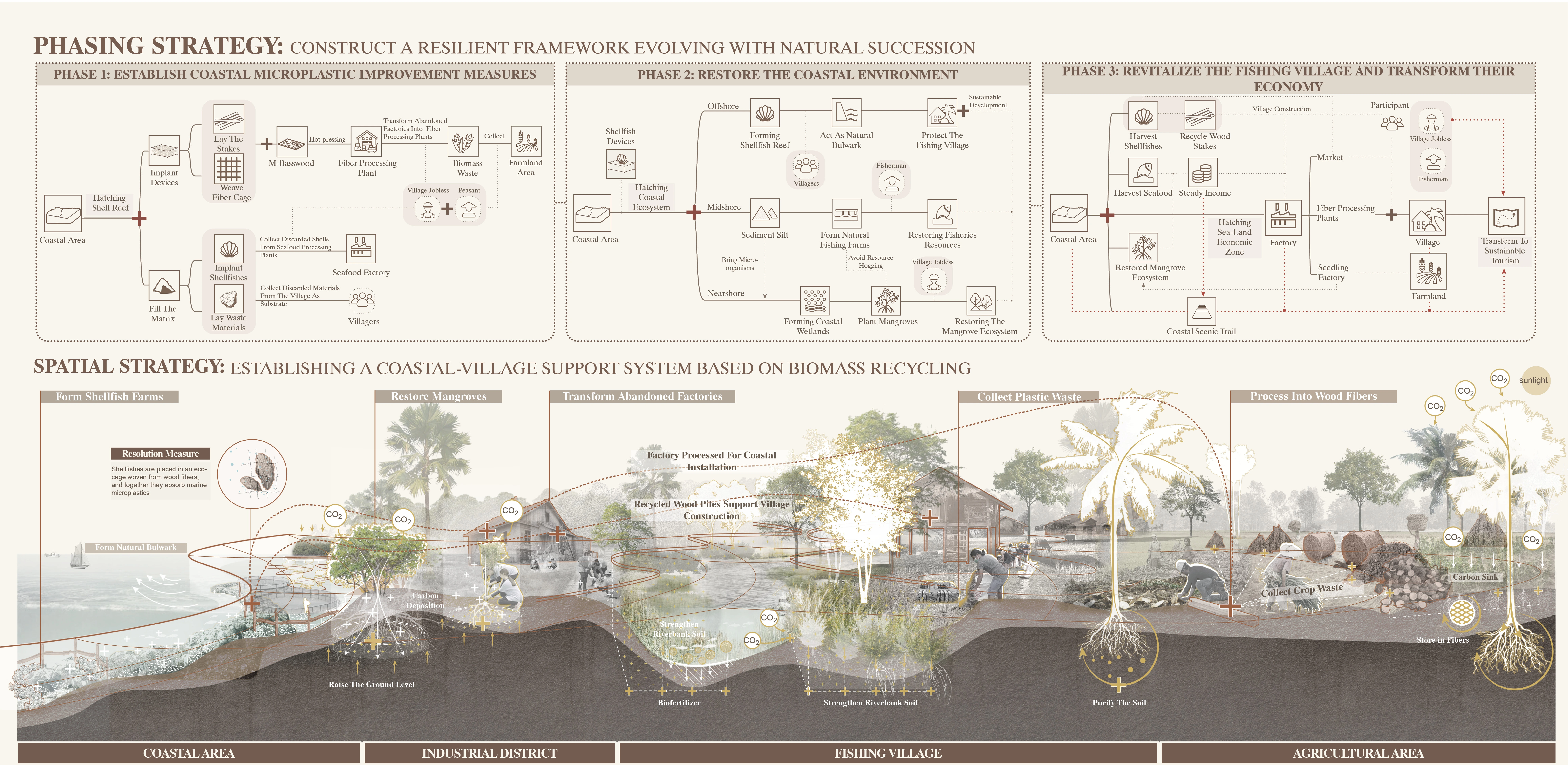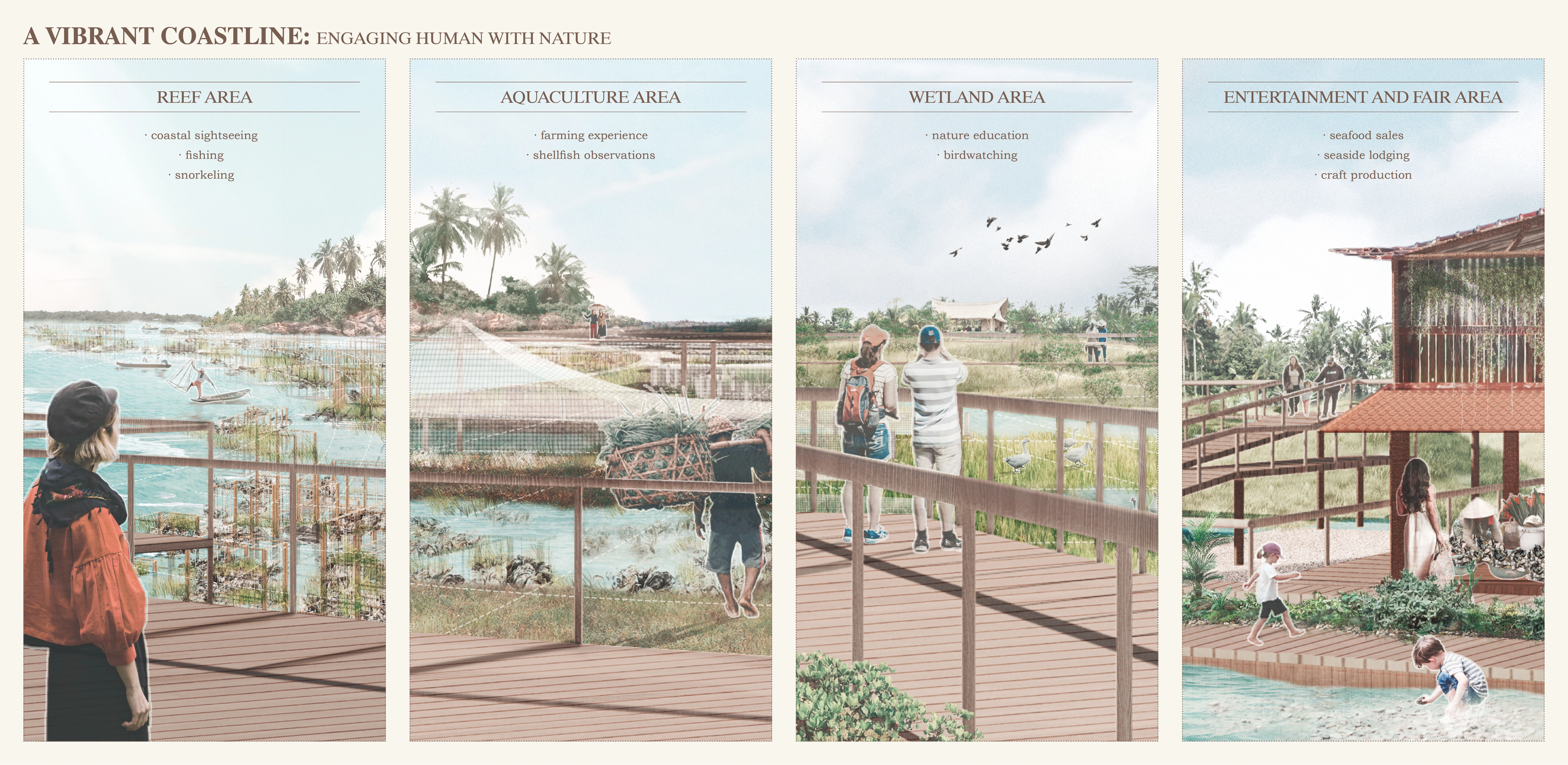 Shellfish meat supplies local restaurants; shells are crafted into handicrafts. A viewing trestle, built from recycled plastics, links the village to restored wetlands. Waves gradually reshape the shoreline, filling reefs with sediment to combat erosion. Degraded industrial zones transition into resilient wetlands, merging ecology with tourism appeal.