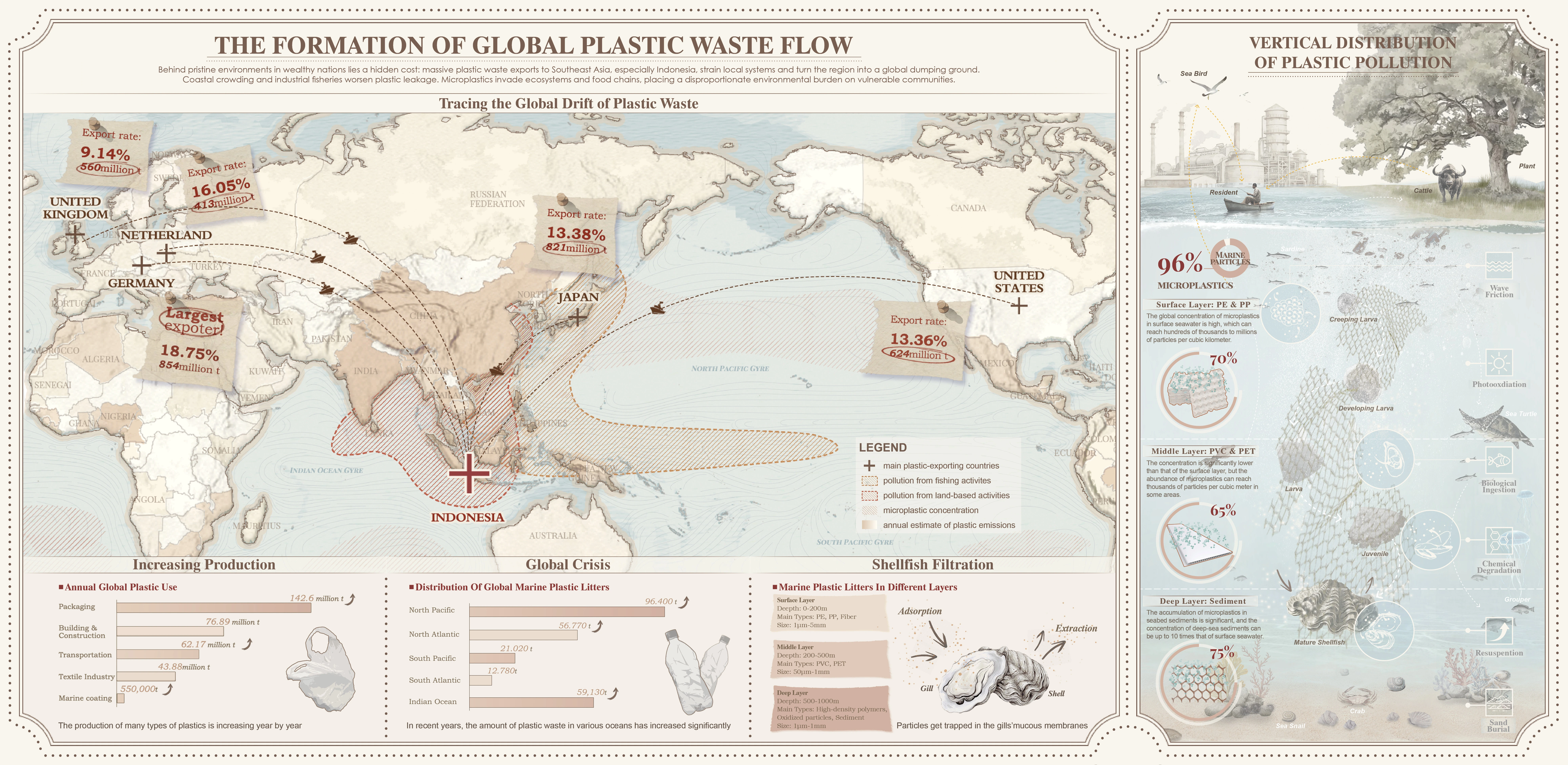 Bali faces severe microplastic pollution, with Indonesia recycling only 9% of its 400 million metric tons of annual plastic waste. Daily, 2,000 truckloads of plastic enter Bali’s waters, degrading into microplastics (<5mm)—“ocean PM2.5”—threatening ecosystems, fisheries, tourism, and human health. Pengambengan, a western Balinese fishing village, epitomizes this crisis, battling erosion, mangrove degradation, and pollution that undermine livelihoods and tourism.