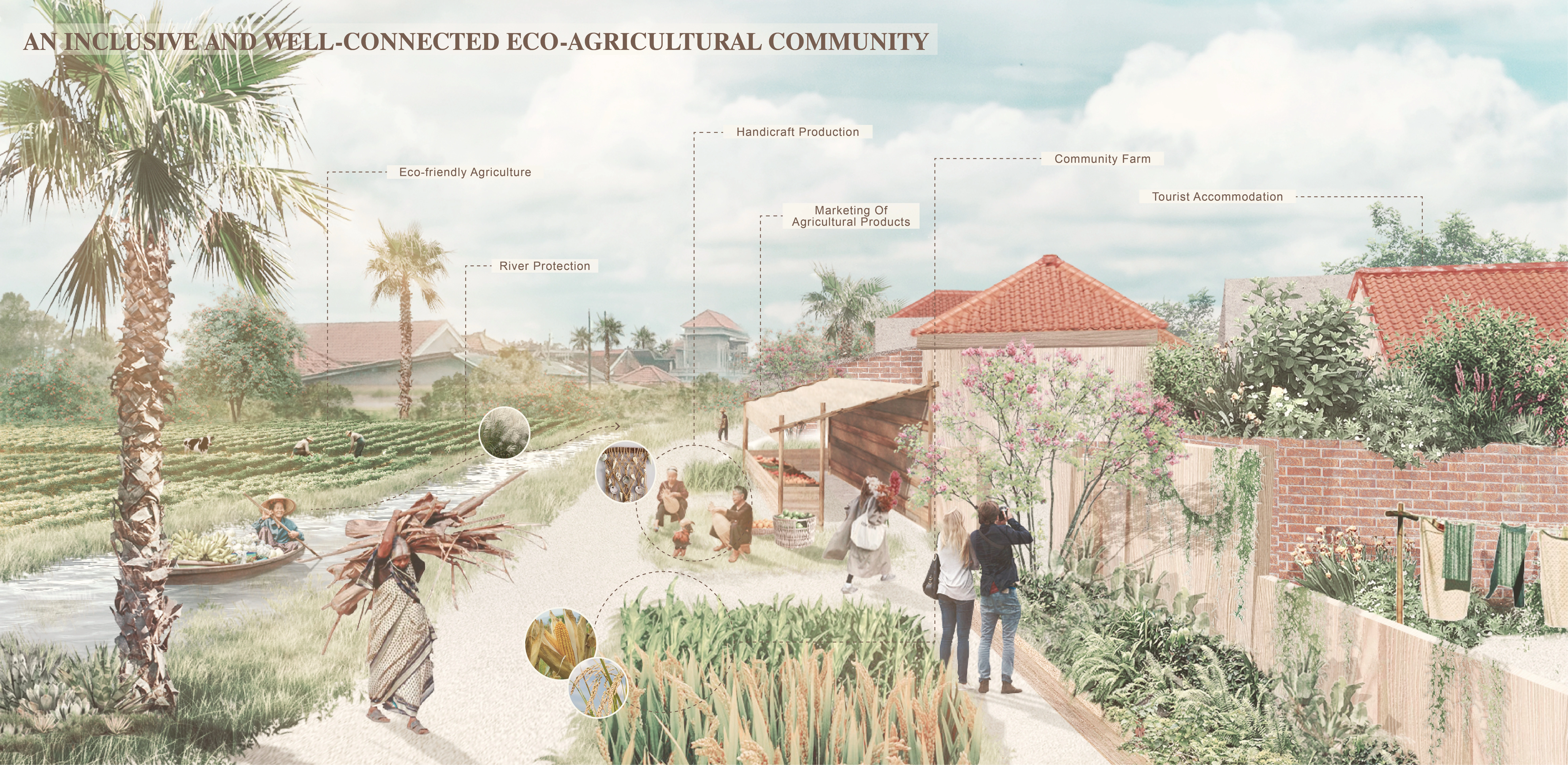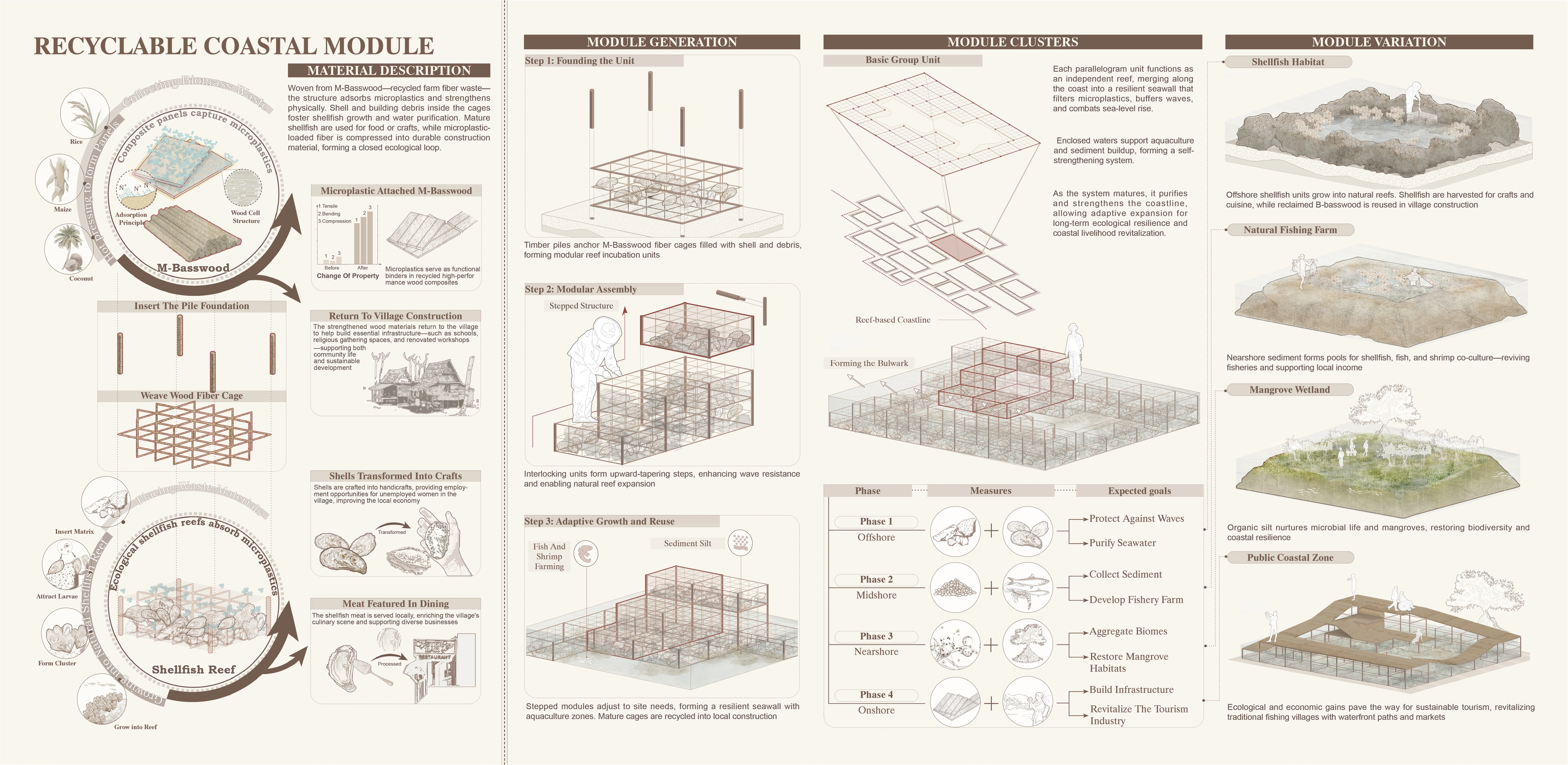 Southeast Asia’s coastal villages face converging crises: microplastic pollution, overexploited fisheries, and declining livelihoods. In Bali’s Pengambengan village, this project pilots a regenerative model rooted in shellfish reef ecology. Modular reef units—woven from recycled M-Basswood—foster shellfish growth, filter microplastics, and support aquaculture. Pollutant-laden fibers are repurposed into building panels, while harvested seafood feeds local businesses and crafts. A recycled plastic trestle links the village to restored tidal zones, drawing ecotourism. This evolving system offers a pathway to transform vulnerable fishing ports into resilient, self-sustaining coastal communities driven by ecological tourism.