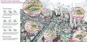 (1) Pocket parks: Develop pocket parks in vacant spaces strategically located to form a network for rainwater drainage. Utilize micro-terrain shaping techniques to create rainwater garden landscapes, which not only enhance the aesthetic appeal but also guide water flow, reducing its velocity and minimizing flood risks.