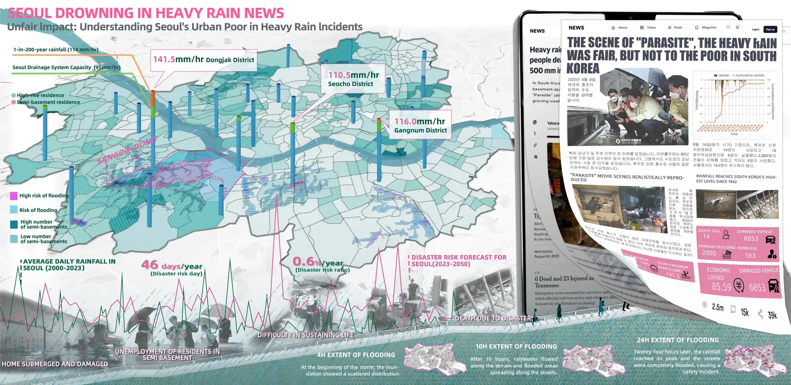 Seoul, the capital city of South Korea, faces significant challenges from heavy rainfall and urban flooding, with a particular impact on the semi-basement areas. These areas, located in low-lying regions, experience architectural constraints that lead to inadequate sunlight exposure and insufficient ventilation. As a consequence, residents in semi-basement communities endure environmental injustices and face greater vulnerability to flooding. The property damage and casualties caused by heavy rain disasters further exacerbate the existing wealth disparity in these areas.