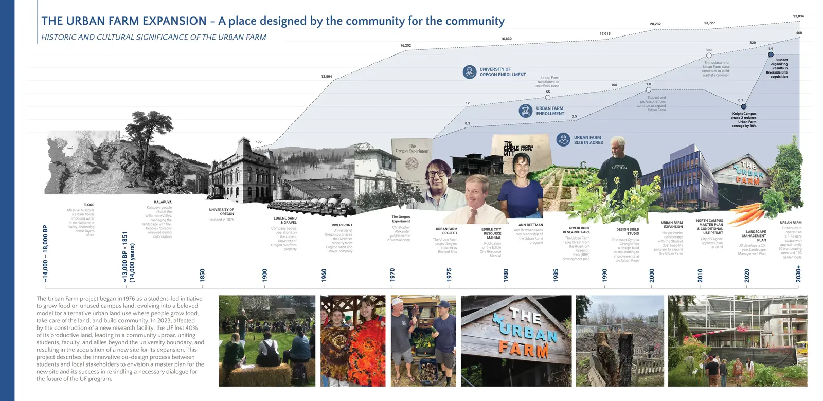 The University of Oregon Urban Farm (UF) represents a local response to contemporary global challenges. As cities expand and the climate changes, the need for innovative and sustainable food production in urban areas is critical. In 2020, the UO Food Security Task Force reported "that 36% of UO students experience food insecurity at some point during their time on campus." To meet this and other critical needs, the Urban Farm provides "a model for alternative urban land use where people grow food, take care of the land, and build community." This approach has engaged students for five decades, and "it is estimated that the program produces and distributes approximately 20,000 pounds of food to UO students per year" (University of Oregon, 2022). As part of the Department of Landscape Architecture, the UF offers hands-on courses to more than 300 students annually from 95 different disciplines across the University. The UF project began in 1975 as a student-led initiative to grow food on unused campus land. Spearheaded by landscape architecture professor Richard Britz, who outlined his theories in the publication "The Edible City Resource Manual" (Britz, 1981), the initiative continued to this day thanks to the efforts of Ann Bettman and Harper Keeler, current Urban Farm director since 2007. Since 2022, affected by the construction of the Knight Campus Phase 2, the UF has lost 40% of its productive land. This impact can be considered a social milestone in the recent campus history. The organized student response was an inspiration for the entire community, uniting and reconnecting staff, faculty, and students across departments and drawing attention beyond the University boundary. Although these actions did not change the course of the building construction, they effectively led to the acquisition of a new 1.9-acre site along the Willamette River and funds to expand the program. Unfortunately, it also generated a climate of distrust between the academic body and the administration that wasn't ideal for the development of the future location. The complexity of the project and its contentious nature, with the UO community still mourning the recent loss, put the initiative on hold until two architecture and landscape professors led a collaborative studio to create a visioning master plan for the new site in the summer of 2024. The Urban Farm Riverside studio was designed as a platform for students, faculty, local stakeholders, and administration to co-design the future of the UF while honoring the efforts of all those who made the program grow and last for five decades. Through lectures, immersive workshops, field trips, research methods, student-led engagement sessions, and multimedia presentations, the studio cohort developed a proposal that successfully brought everybody together. This project is a reminder of the principles Christopher Alexander brought to the UO Campus Plan with 'The Oregon Experiment' in 1975. It is also proof that the UO community can still revive those principles despite the increasing centralized administrative control that seems to drive campus planning nowadays, and that Alexander tried to revert through his theories. In the case of the Urban Farm expansion, students demonstrated that users can still be responsible for the future of the physical environment where they live and work, and that transparent and ambitious co-design methodologies such as the one presented here are essential to achieve such goals.