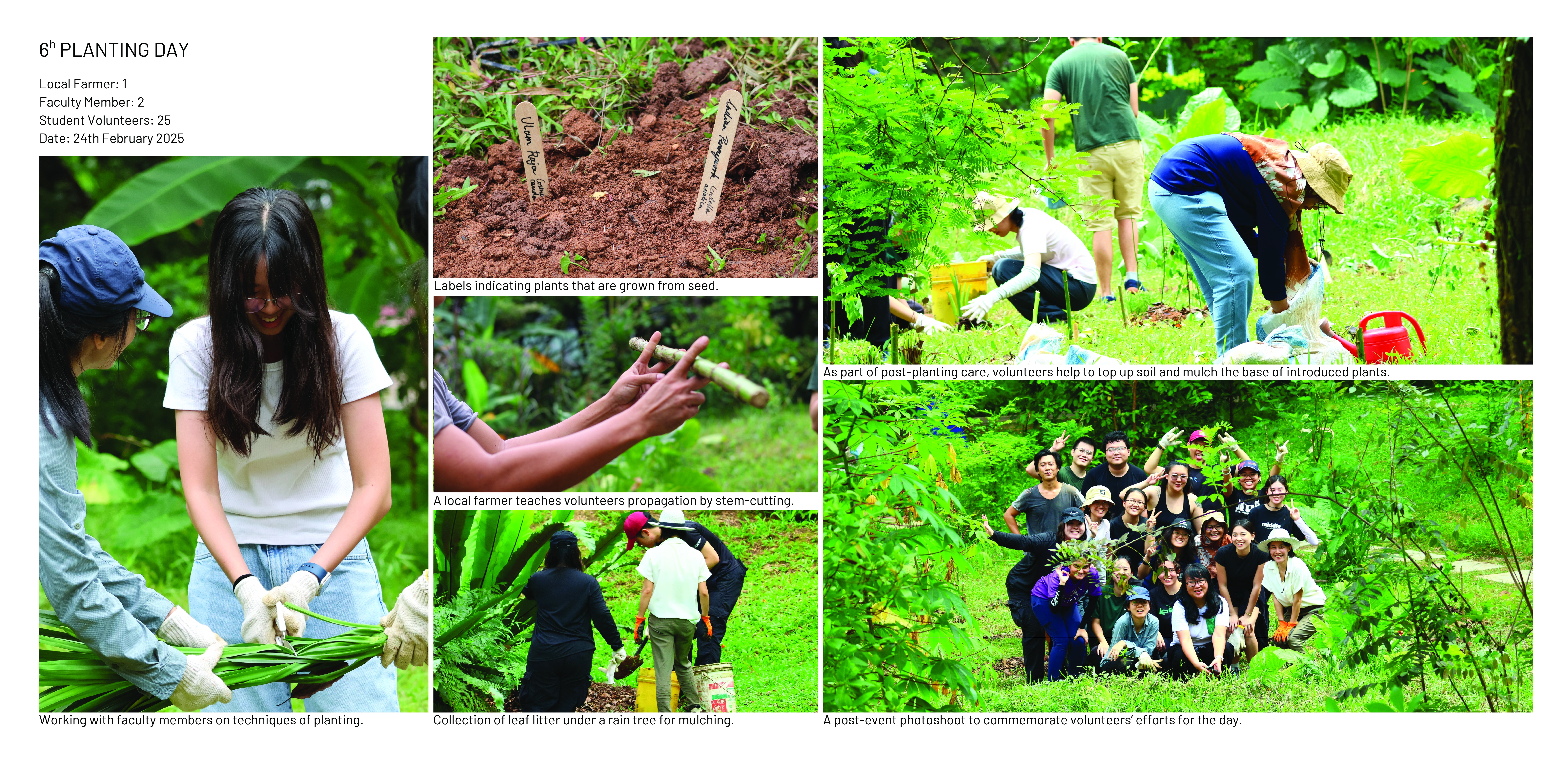 Nasi Ulam Forest Garden is an alternative green space in a university campus composed of edible and spontaneous plants that flourish together under selective maintenance. It features around 30 edible species that form the ingredients of Nasi Ulam (Malay mixed-salad rice), including fruit trees, vegetables, and herbs, layered with naturally grown tree saplings and wildflowers. Organic compost, edible plants, tree saplings, and vegetable seeds were transferred to the garden from one of the last surviving local permaculture farms running on an expiring land lease. It provides an opportunity for students to learn about multifunctional values of rewilding green spaces and local kampung perennials, while developing storytelling tools to build and sustain academic-community alliances. A student-led organization from the bachelor’s of landscape architecture programme known as the Landscape Architecture Collective (LAC), serves as the conduit that inherits from pioneering local farmers their knowledge on maintaining a forest garden, and disseminates this information to the school community through organising planting activities. This ensures that the sustainable ethos that balances agriculture with the preservation of the wild, continues to be practiced in the current generation. These planting activities have been held twice a semester since 2022, inviting volunteers to partake in a day of planting, where they are engaged in transplanting, weeding, composting and survey activities that contribute to the upkeep of the garden. In addition, herbs are occasionally harvested from the garden and used to make Nasi Ulam, allowing participants to understand the value of ‘farm-to-table’ tied to indigenous food culture. Halting regular grass-cutting in the originally manicured campus lawn allowed for the spontaneous growth of vegetation from seeds brought to site by wind and birds. The selective removal of invasive climbers and fast growing trees helped to maintain the diversity and health of slow-growing native flora. Planting of edible species in clusters of varying heights and forms under the preserved canopy, creates a multi-layered vegetation structure that harbours a range of wildlife. Planting of edible species in clusters of varying heights and forms under the preserved canopy, creates a multi-layered vegetation structure that harbours a range of wildlife. After 4 years, the garden hosts 28 planted edible and over 12 spontaneous flora species, many of which are native to the tropical rainforest.The garden has also become a habitat for 28 butterfly and 21 bird species, including hornbills that play a crucial role in seed dispersal for numerous native flora.This symbolic landscape evokes the character of the country’s early tropical rainforests, plantations and scrublands. At the same time, selective maintenance, following Nassauer’s Cue to Care concept, ensures public acceptance and safety. Paved paths made from recycled concrete, and neat edges provide pleasant walking experiences, balancing tamed and untamed elements, while facilitating ease of access to maintain the garden.The project's ecological aesthetics enhance public appreciation for dynamic vegetation growth. By involving diverse groups in monitoring biodiversity and participating in hands-on activities on a regular basis, the garden serves as a living laboratory offering educational opportunities that foster environmental stewardship and ecological knowledge.