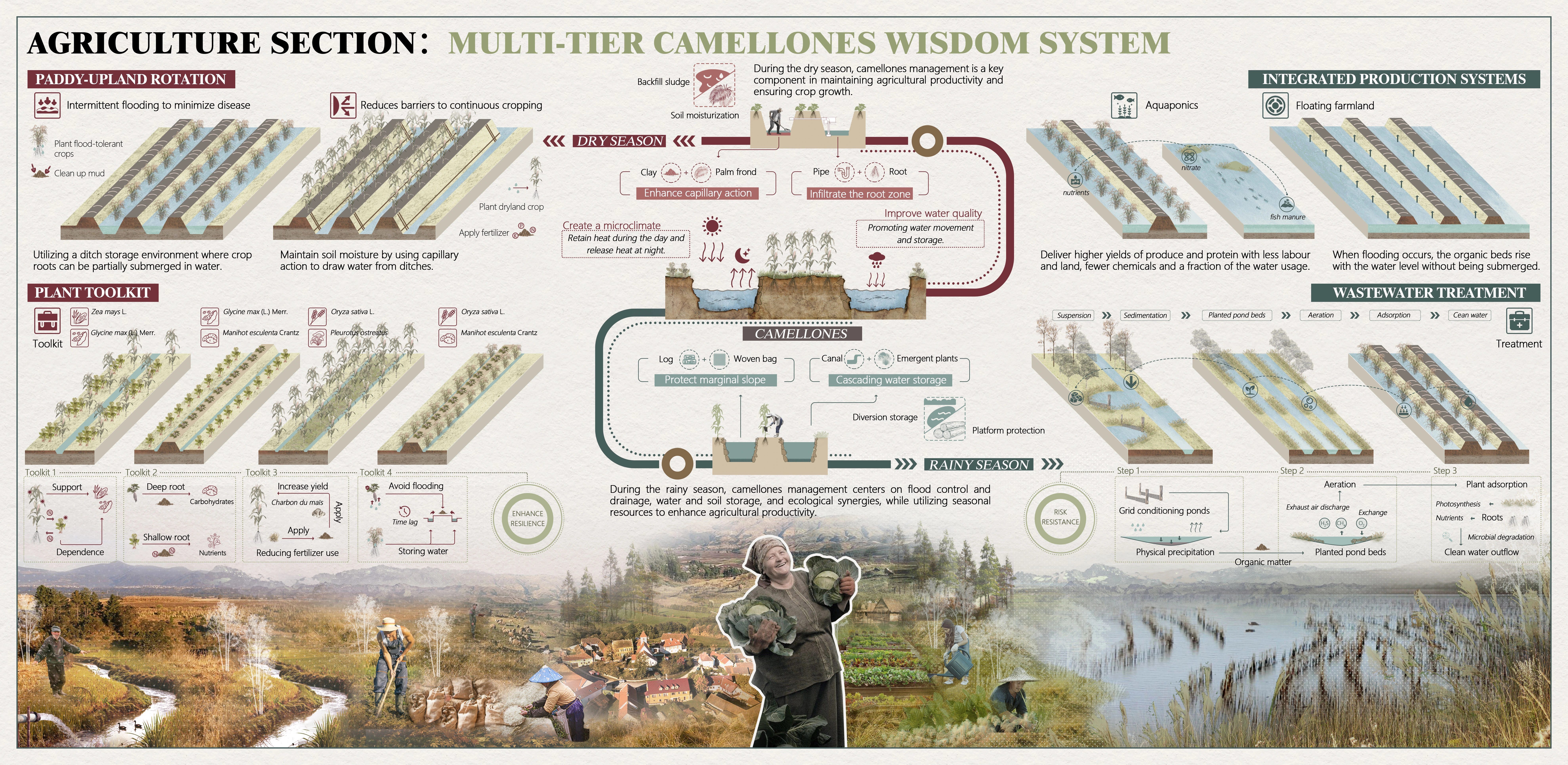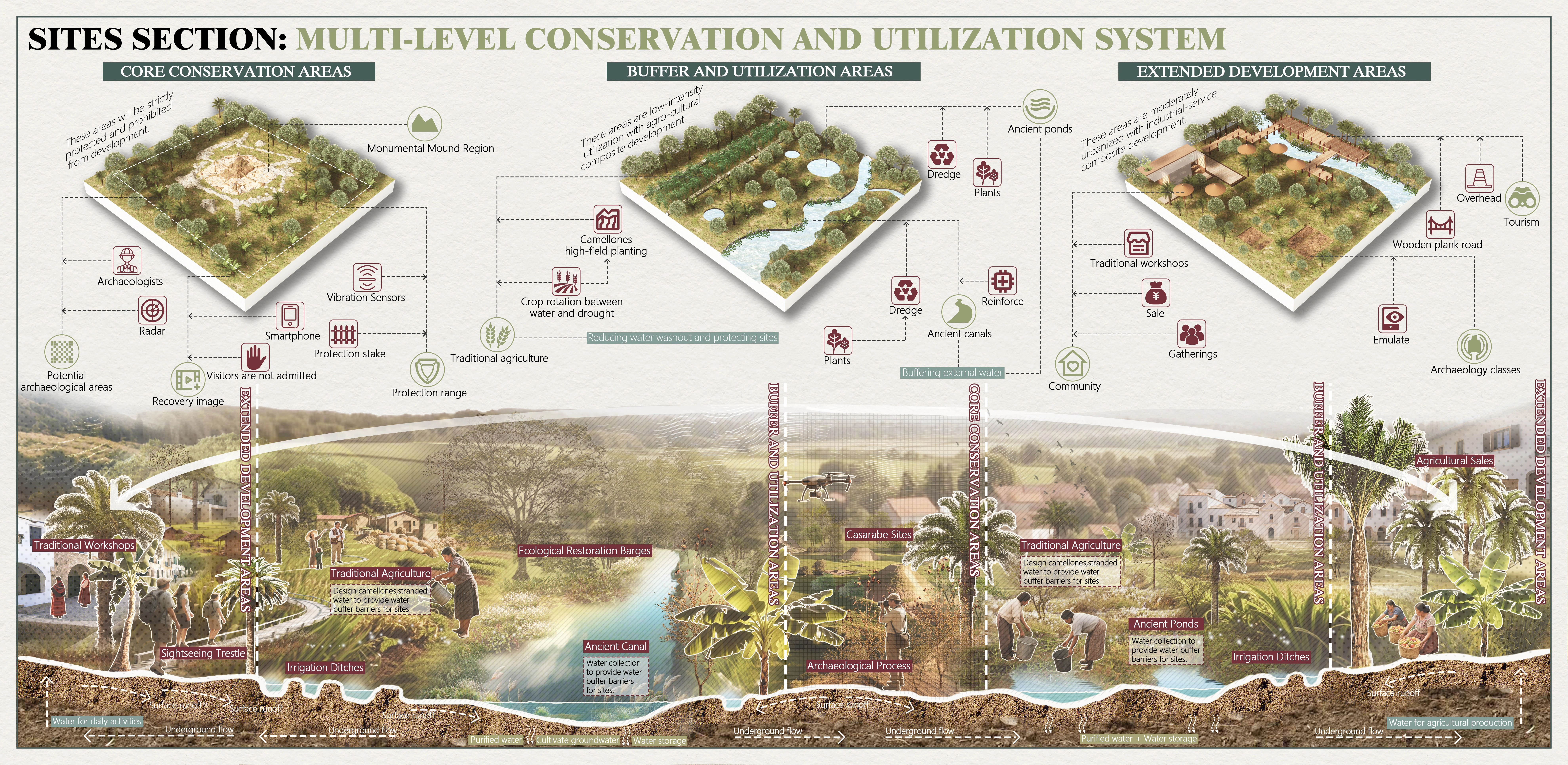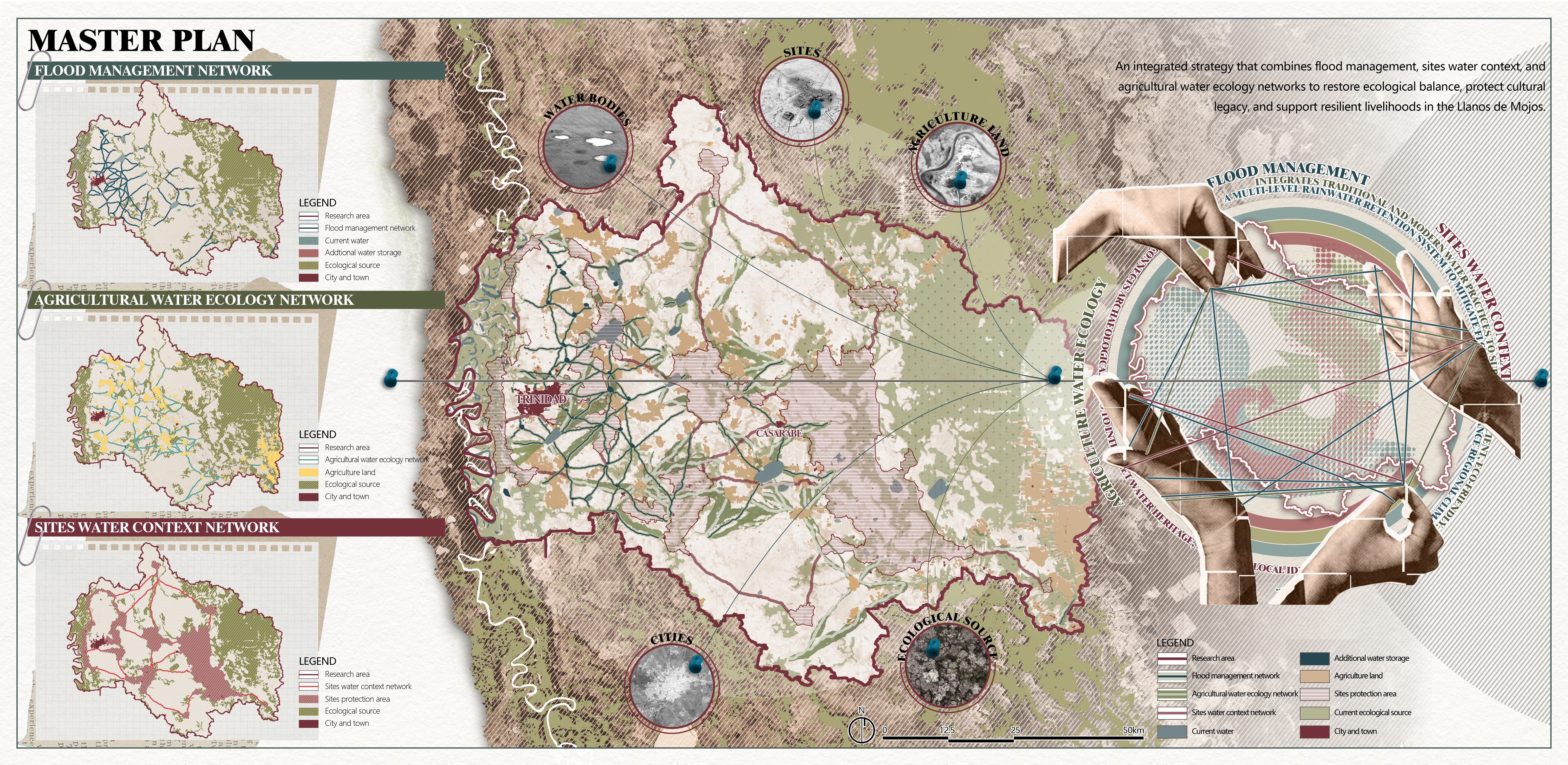 Drawing on ancestral water wisdom, our plan weaves three complementary network systems—Flood Management, Agricultural Water Ecology, and Sites Water Context—into a unified framework: