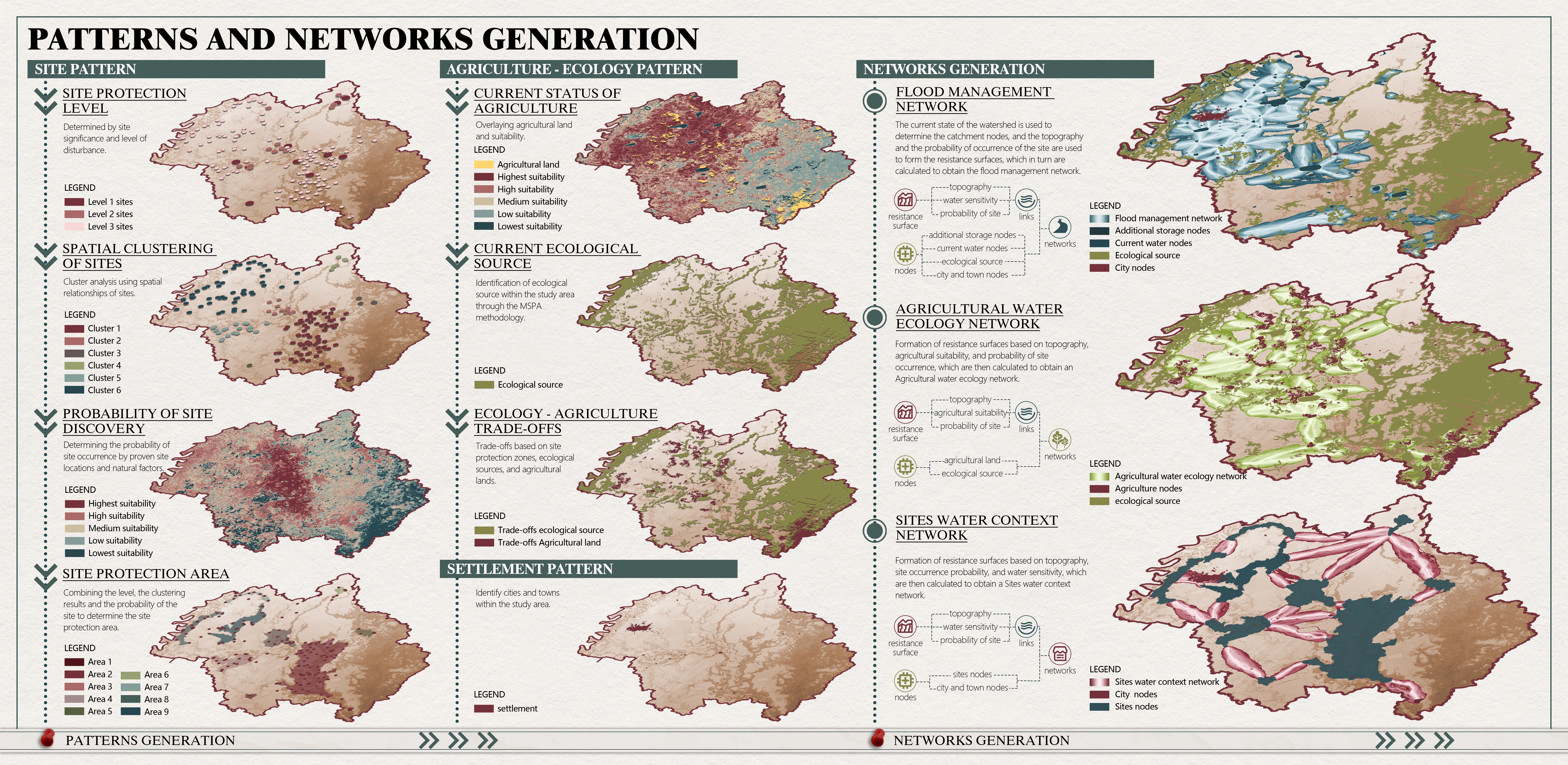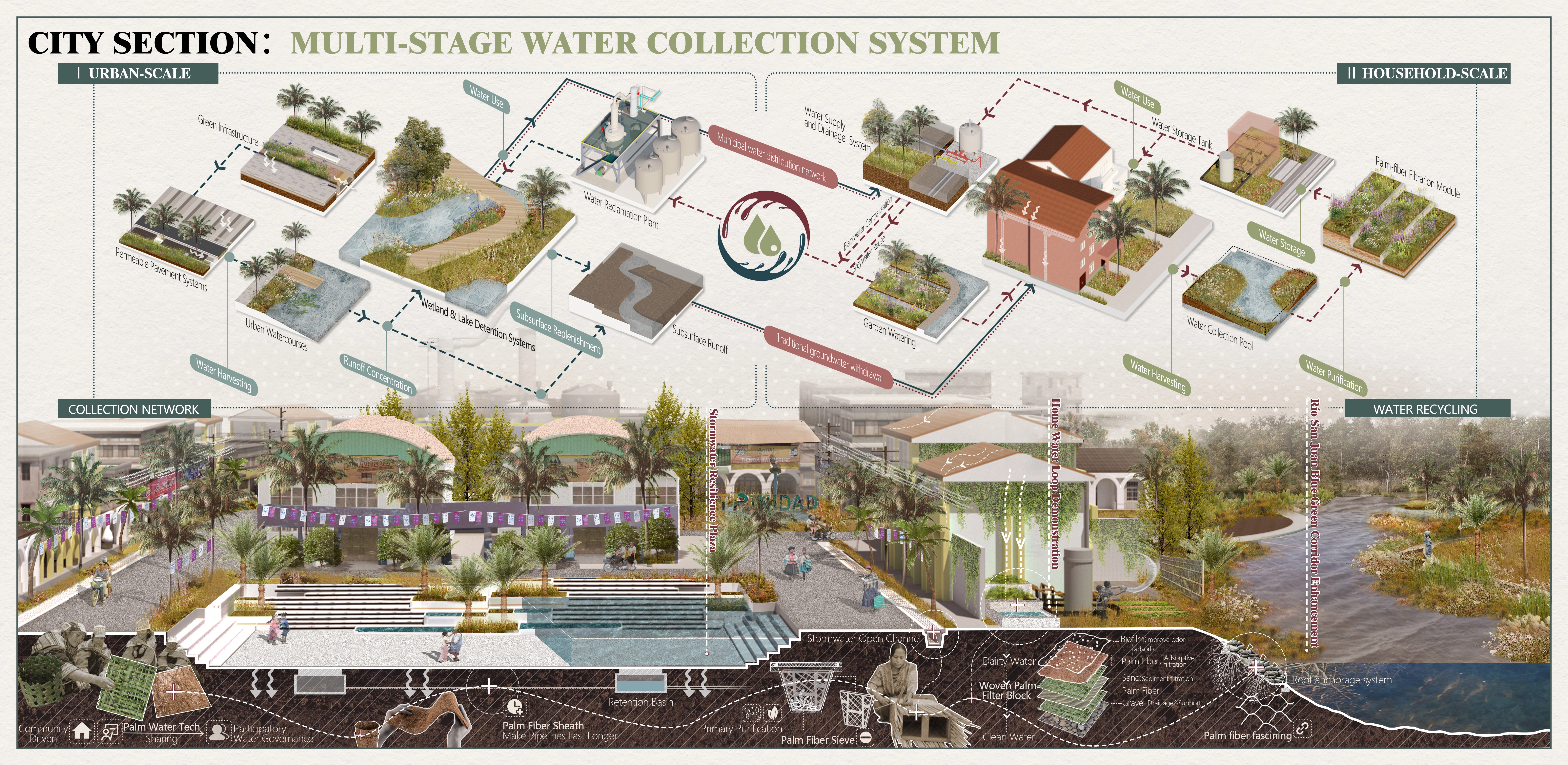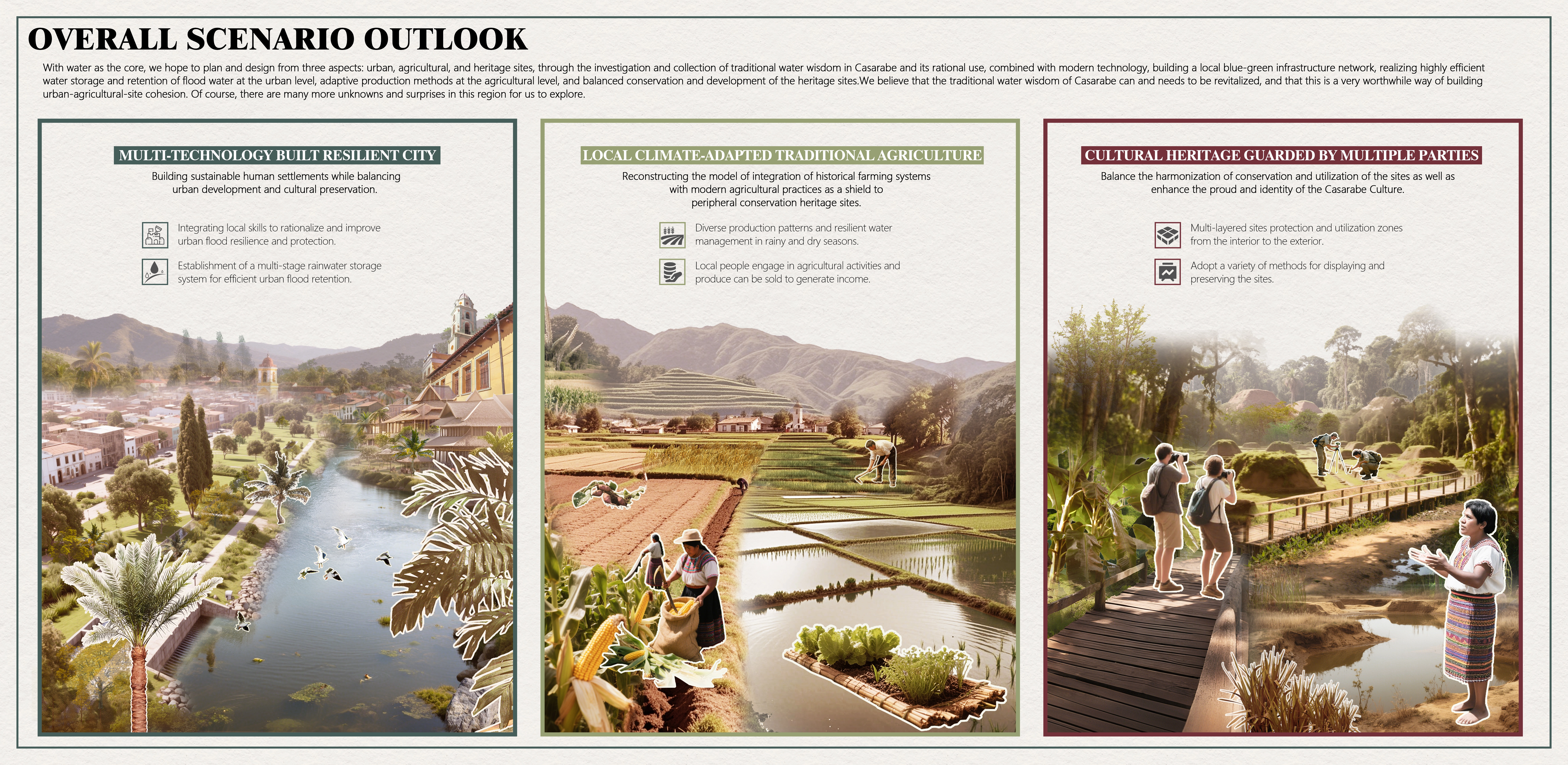 Drawing on ancestral water wisdom, our plan weaves three complementary network systems—Flood Management, Agricultural Water Ecology, and Sites Water Context—into a unified framework: