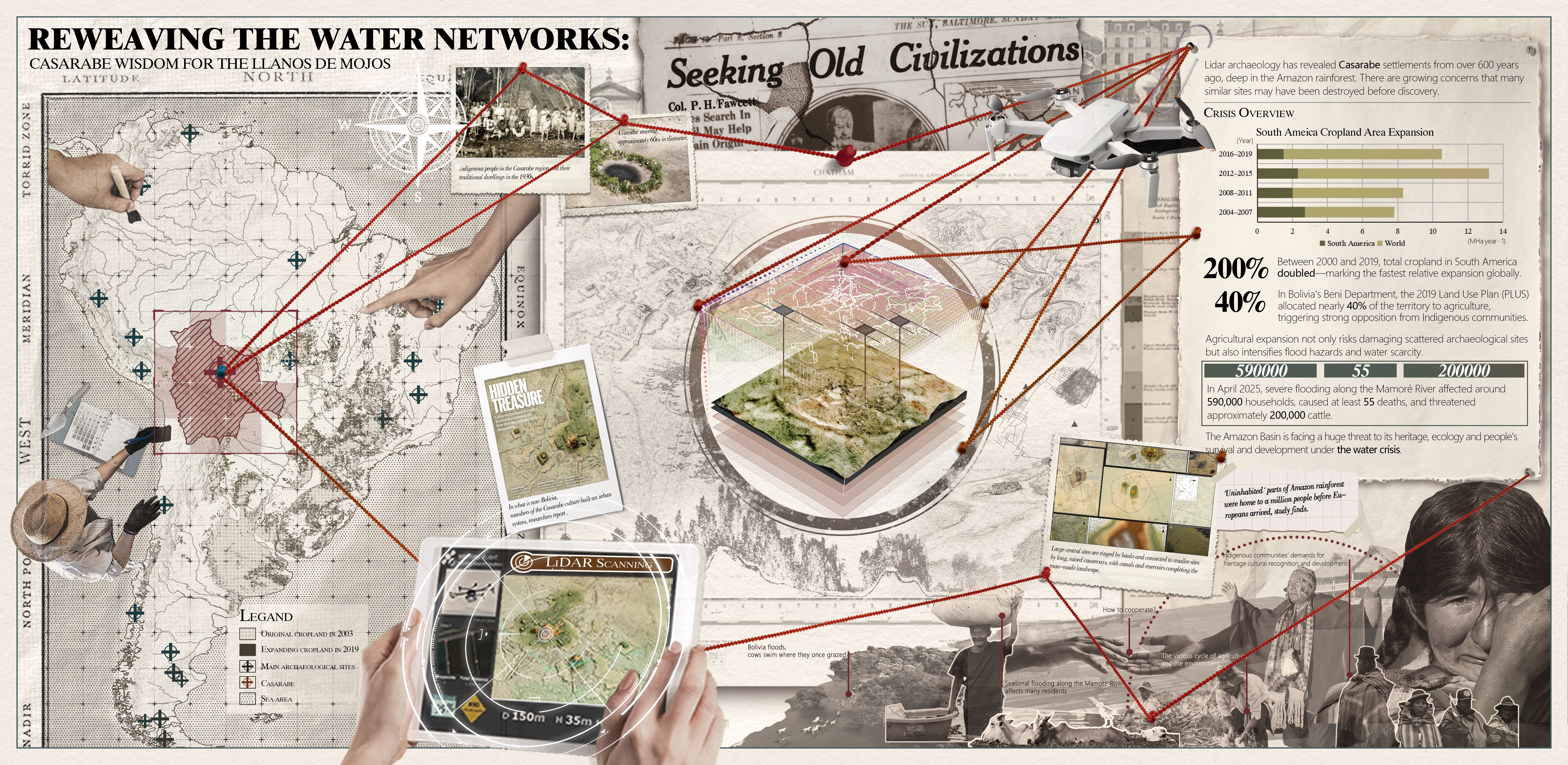 Recent airborne LiDAR surveys have revealed the vast, complex settlement landscape of Casarabe on the edge of the Amazon. Ancient ponds, canals, raised fields, and mounds to moderate both wet-season floods and dry-season droughts. Today, rapid land-use change and climate variability spark severe water scarcity, triggering land-use conflicts and accelerating loss of unrecorded archaeological features. Many sites risk destruction by agriculture, livestock grazing, and development long before formal recognition. A proactive, landscape-scale planning strategy is urgently needed to reconcile competing interests, safeguard irreplaceable heritage, and restore ecological resilience.