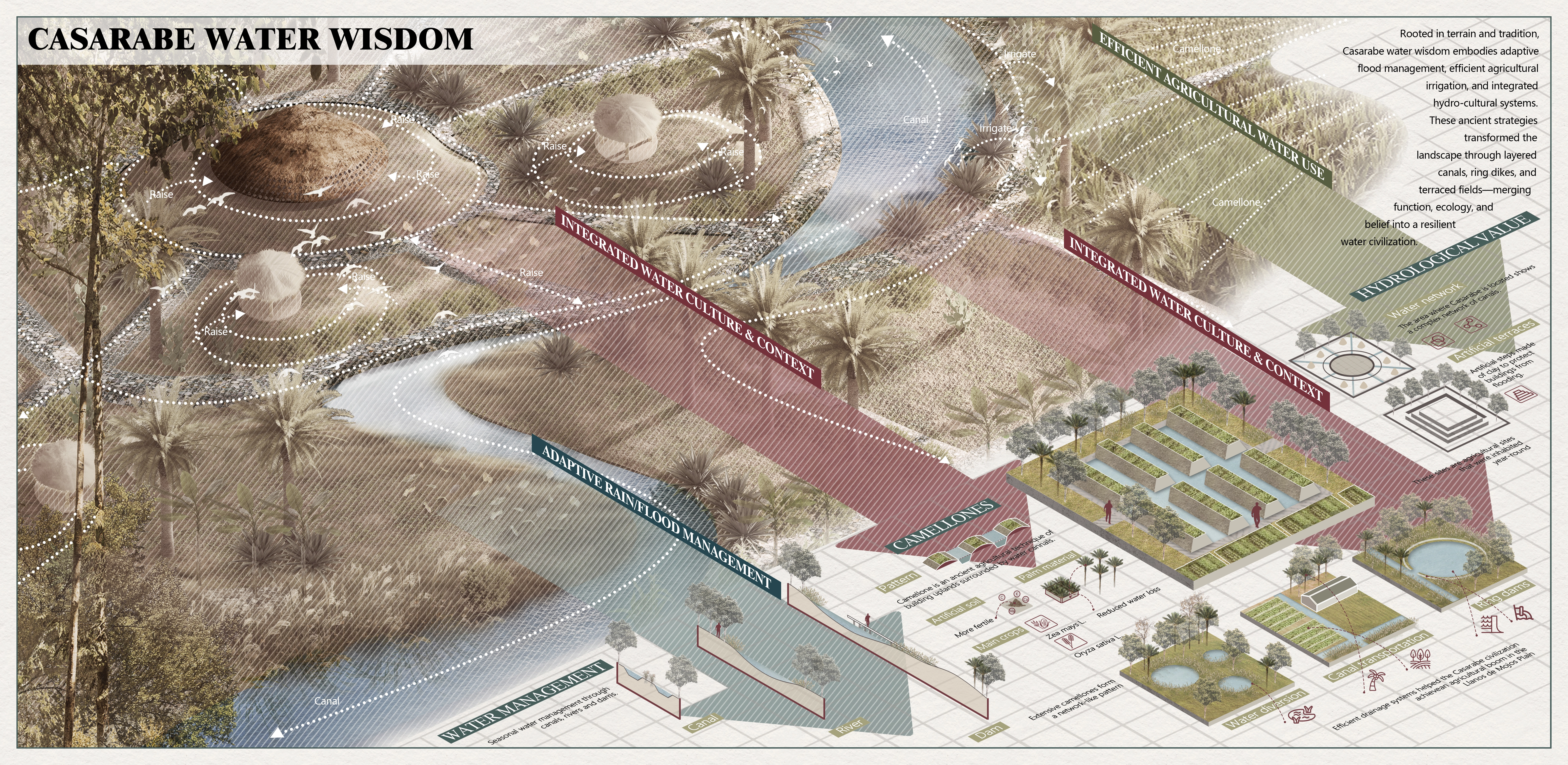 At the Casarabe heritage landscape in Beni Province, seasonal droughts and floods create water crises that threaten local communities, agriculture, and archaeological sites. The ancients countered extremes with ponds, canals, raised fields, and mounds, forming a resilient mosaic landscape. Drawing on three water-wisdom legacies—Flood Management, Efficient Agricultural Water Use, and Integrated Water Culture—we establish a Flood Management Network, an Agricultural Water Ecology Network, and a Sites Water Context Network. This heritage-informed, networked strategy balances ecological restoration, sustainable farming, and site conservation, offering an innovative, replicable model for resilient landscape stewardship.