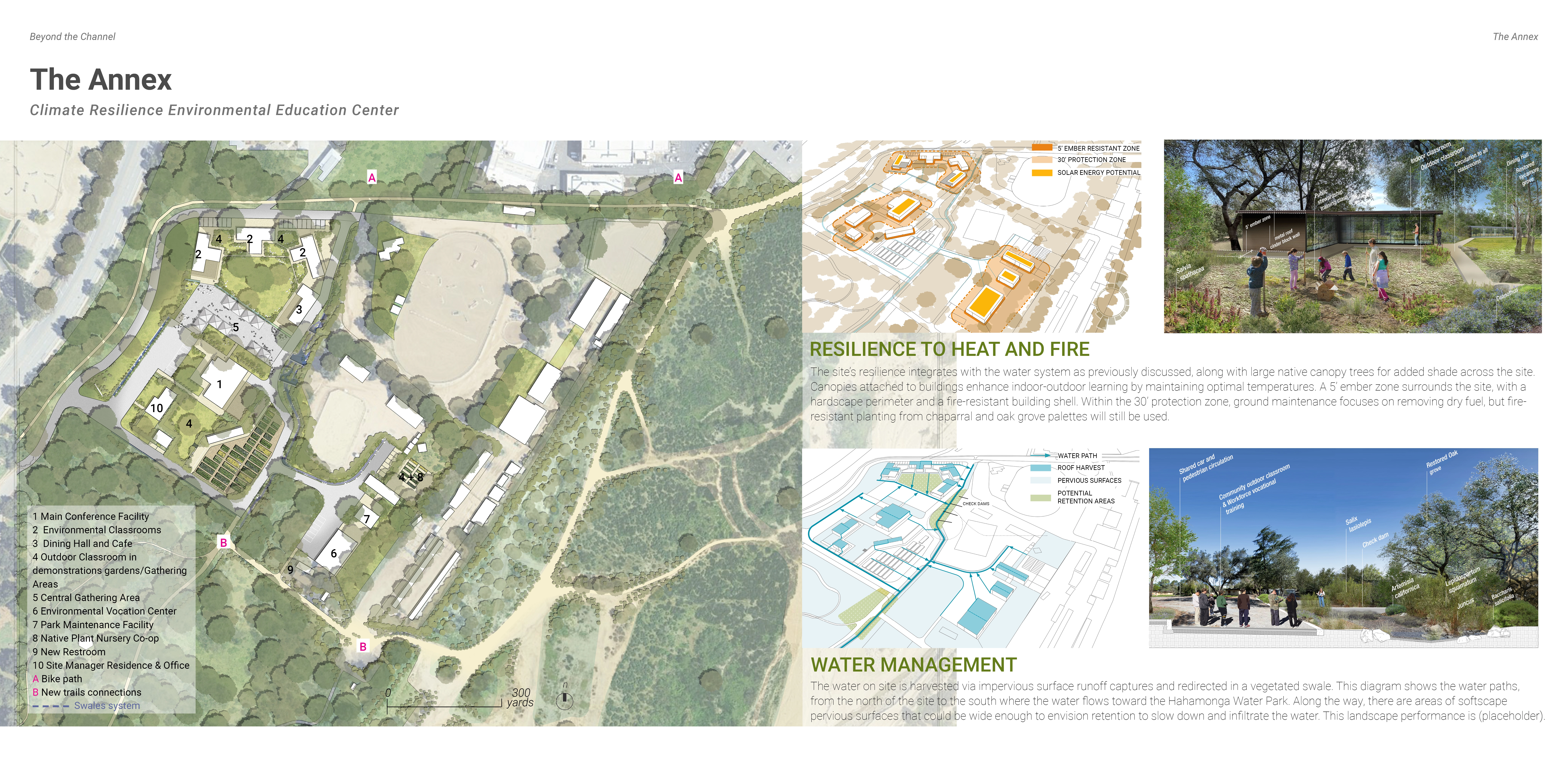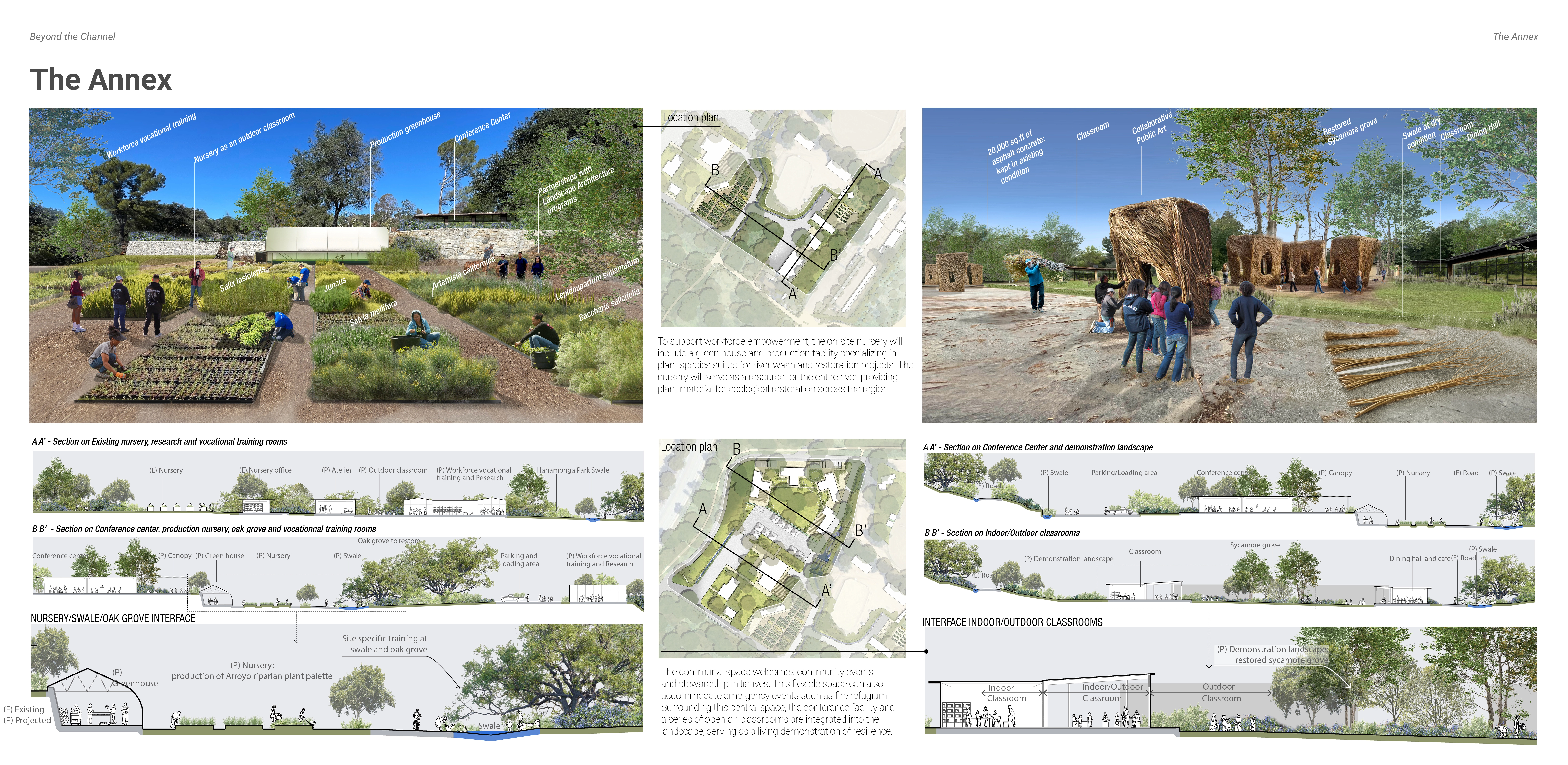 Our spatial and community strategies bring restoration to life. Our designs include an education hub with a nursery that fosters stewardship; A rerouted flow near Devil’s Gate Dam restores sediment and invites learning; A rewilded golf course merges ecology with recreation, and urban upgrades improve access and pedestrian safety. We aim to demonstrate a successful model of urban river revitalization through culture building, community reconnecting, and care to both the human and natural systems.