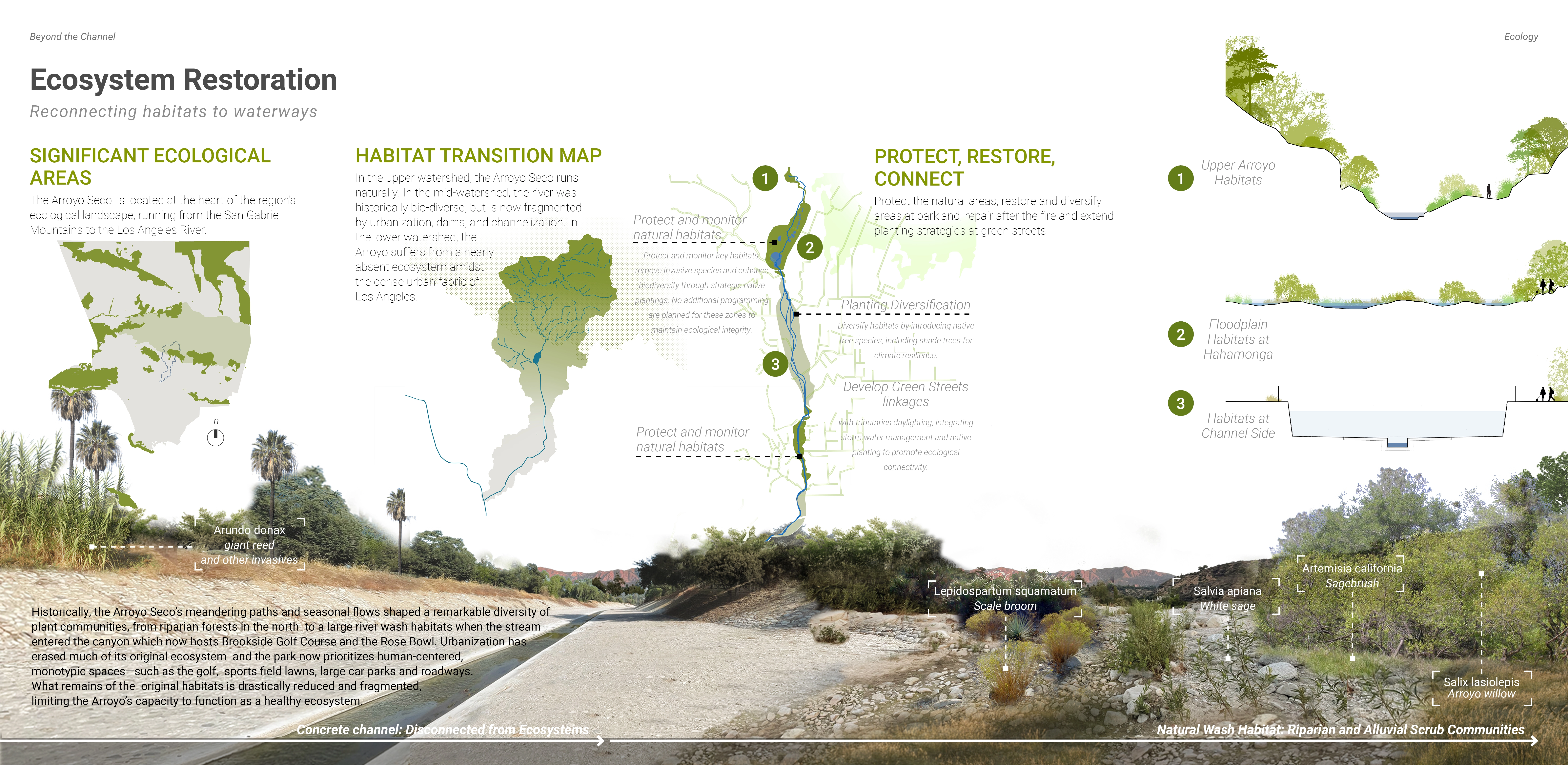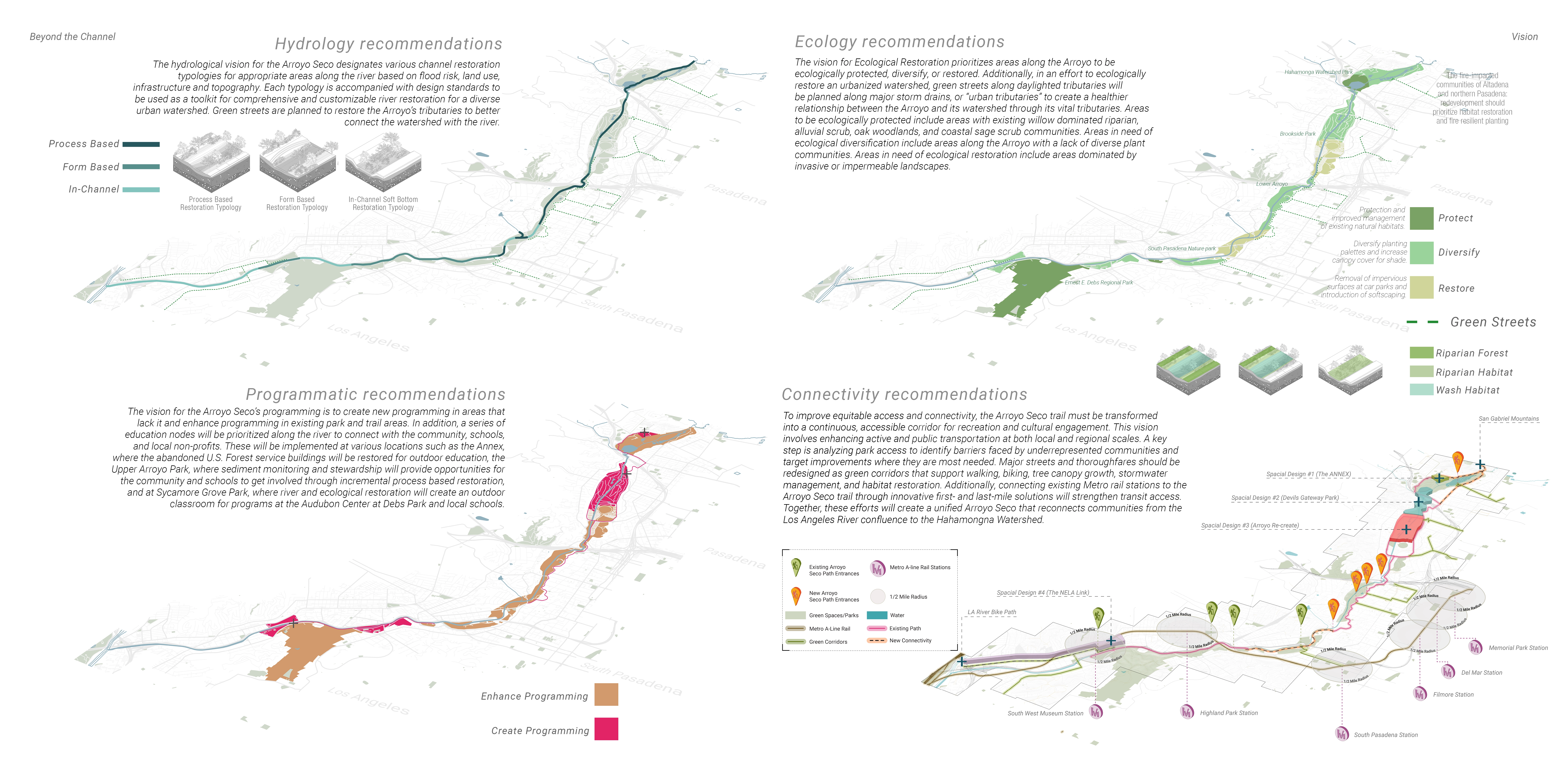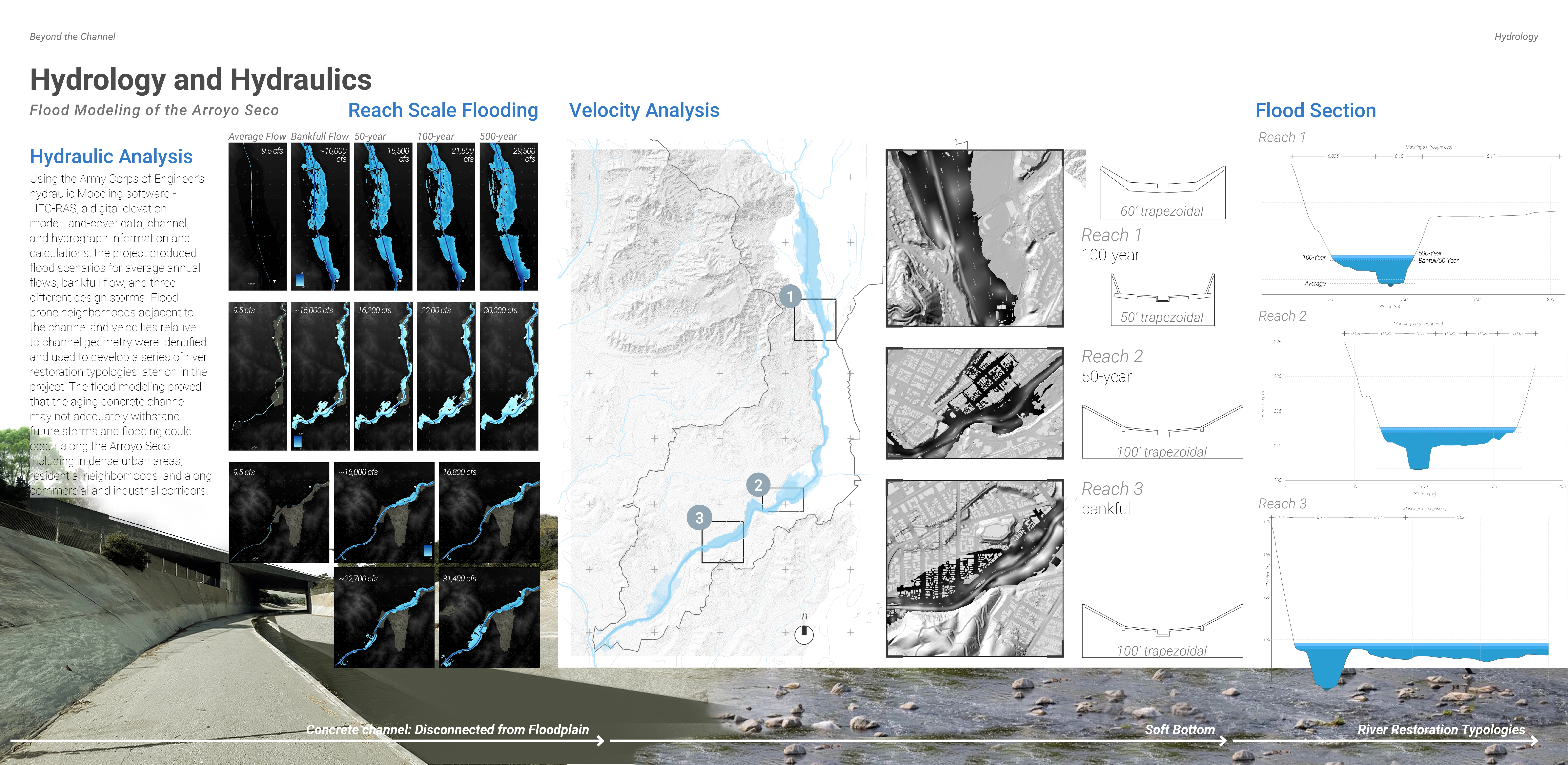 The Arroyo Seco Restoration Project seeks to reconnect Pasadena’s human-centered values with natural processes and ecological systems, prioritizing the health of the river as the foundation for public health, community stewardship, park programming and connectivity. We began by identifying four primary goals: to analyze existing and future hydrologic conditions, develop strategies to enhance habitat diversity, explore opportunities for programming informed by river restoration and community feedback, and improve equitable access and connectivity. Our first step was to understand how the river currently functions and what it needs to recover. Through HEC-RAS modeling, we analyzed 100-year storm scenarios to determine where and how flooding could occur. This allowed us to explore potential interventions that support ecological restoration while protecting communities. We reviewed relavant precedents and past studies, attended public meetings, and interviewed City staff to understand existing priorities and constraints. We also engaged in critical conversation with the Arroyo Seco Foundation and One Arroyo Foundation whose insight into community attitudes, policy limitations, and ecological concerns helped guide our thinking.