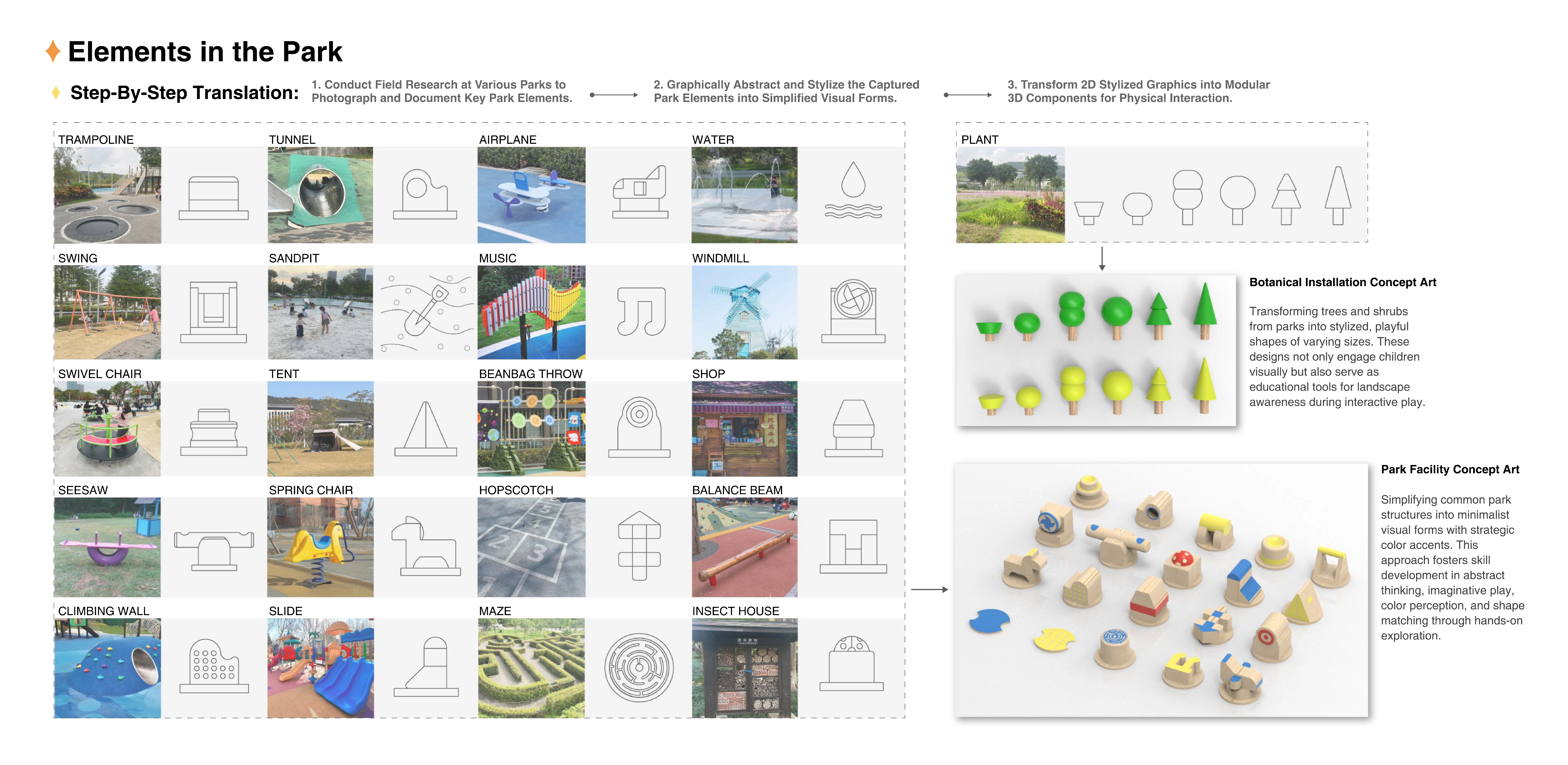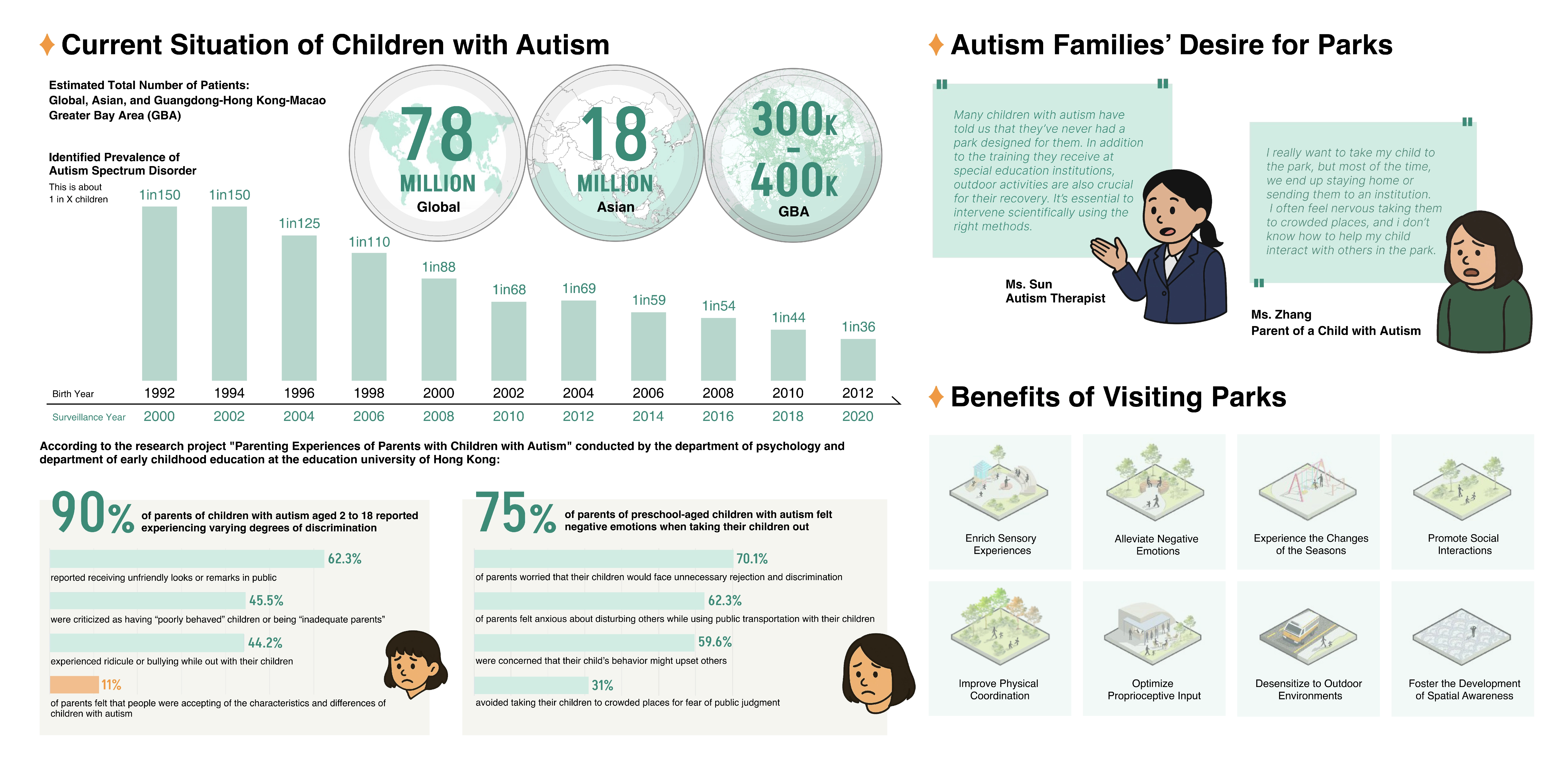 The number of children diagnosed with autism has been increasing steadily in recent years. This group faces unique challenges during development, particularly in adapting to outdoor environments and integrating into society. Through in-depth conversations with parents and teachers, we discovered their shared desire for the children to leave the confines of indoor spaces, experience nature, and participate in social activities in parks.