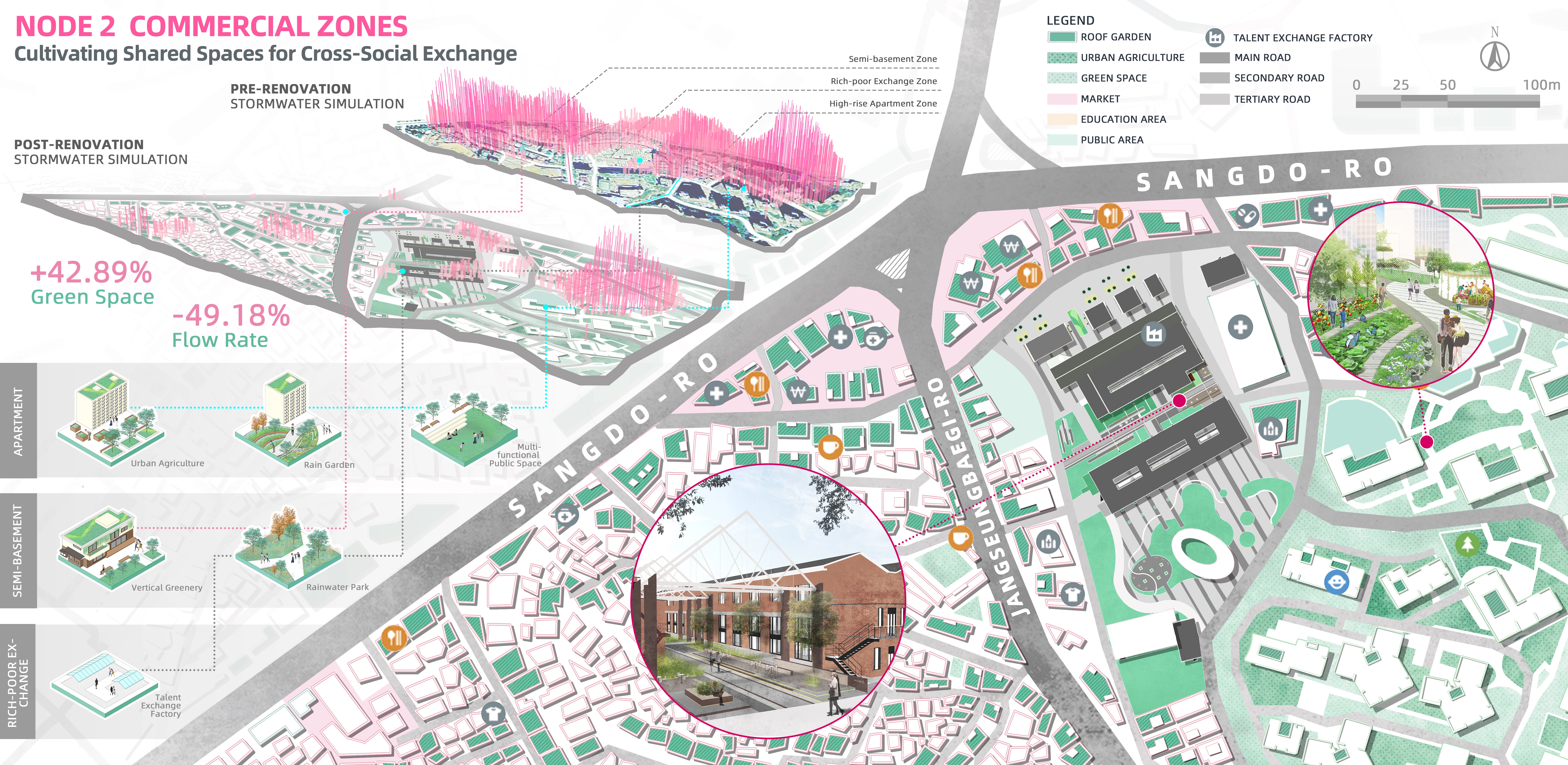 Heavy rainfall poses a significant threat in Seoul, South Korea. Semi-basements experience higher property damage and casualties due to urban flooding. To address this, we propose a synergistic urban rainwater micro-upgrading strategy and a path towards green justice to address the challenges and alleviate wealth disparity in Sangdo-dong, Dongjak District. The project offers three strategies: divert rainwater in affluent areas with higher elevation to minimize impacts on lower areas, transform vacant spaces into green infrastructure in economically diverse regions, and establish a network of rainwater pocket parks, pre-during-post disaster framework, and detailed rainwater management in low-lying semi-basement areas.