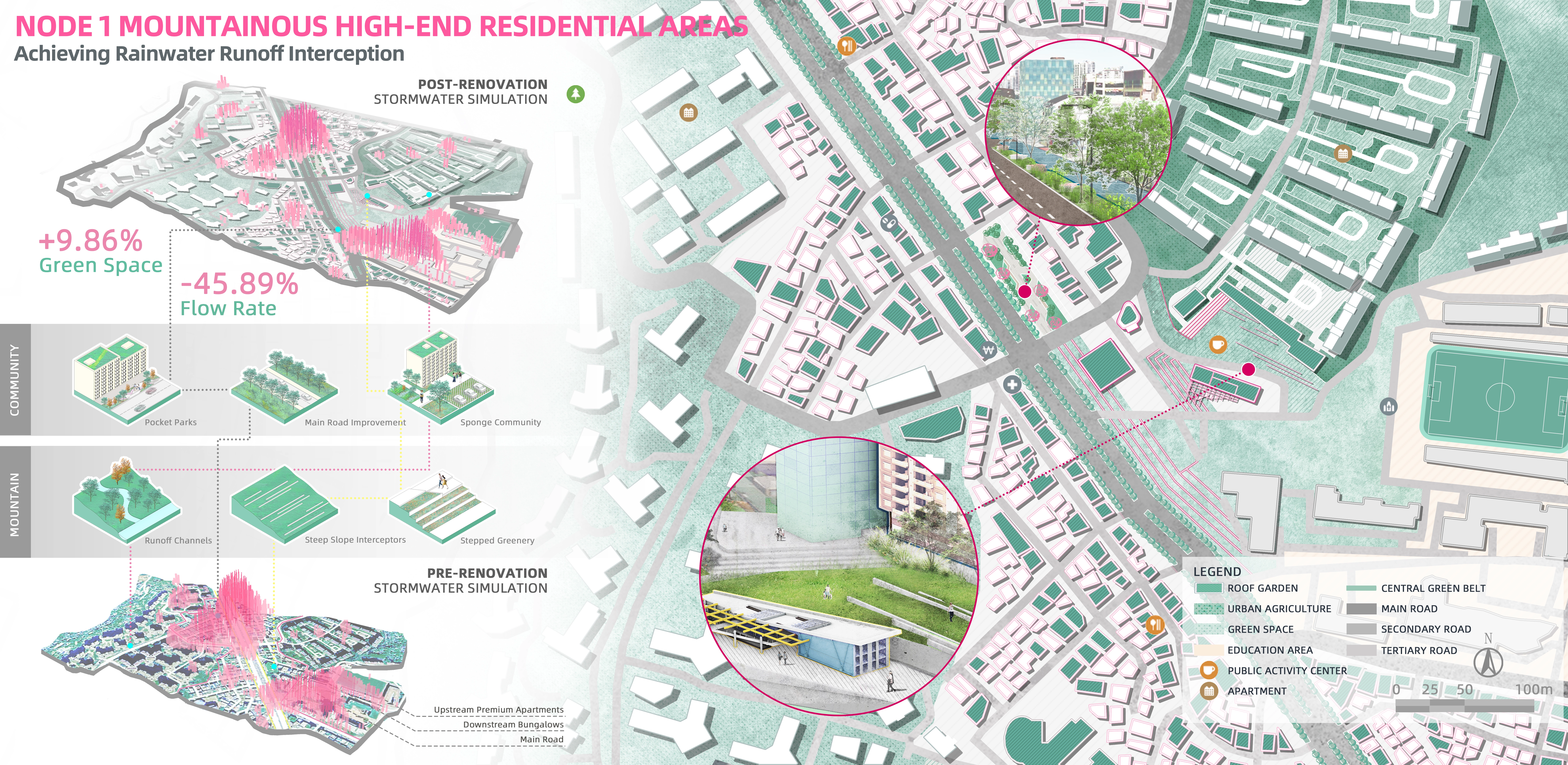 Node 2: The Adjoin area, characterized by moderate topography and the coexistence of high-end residential areas and flood-prone semi-basement districts, necessitates a multifaceted approach. The following strategies can be implemented: