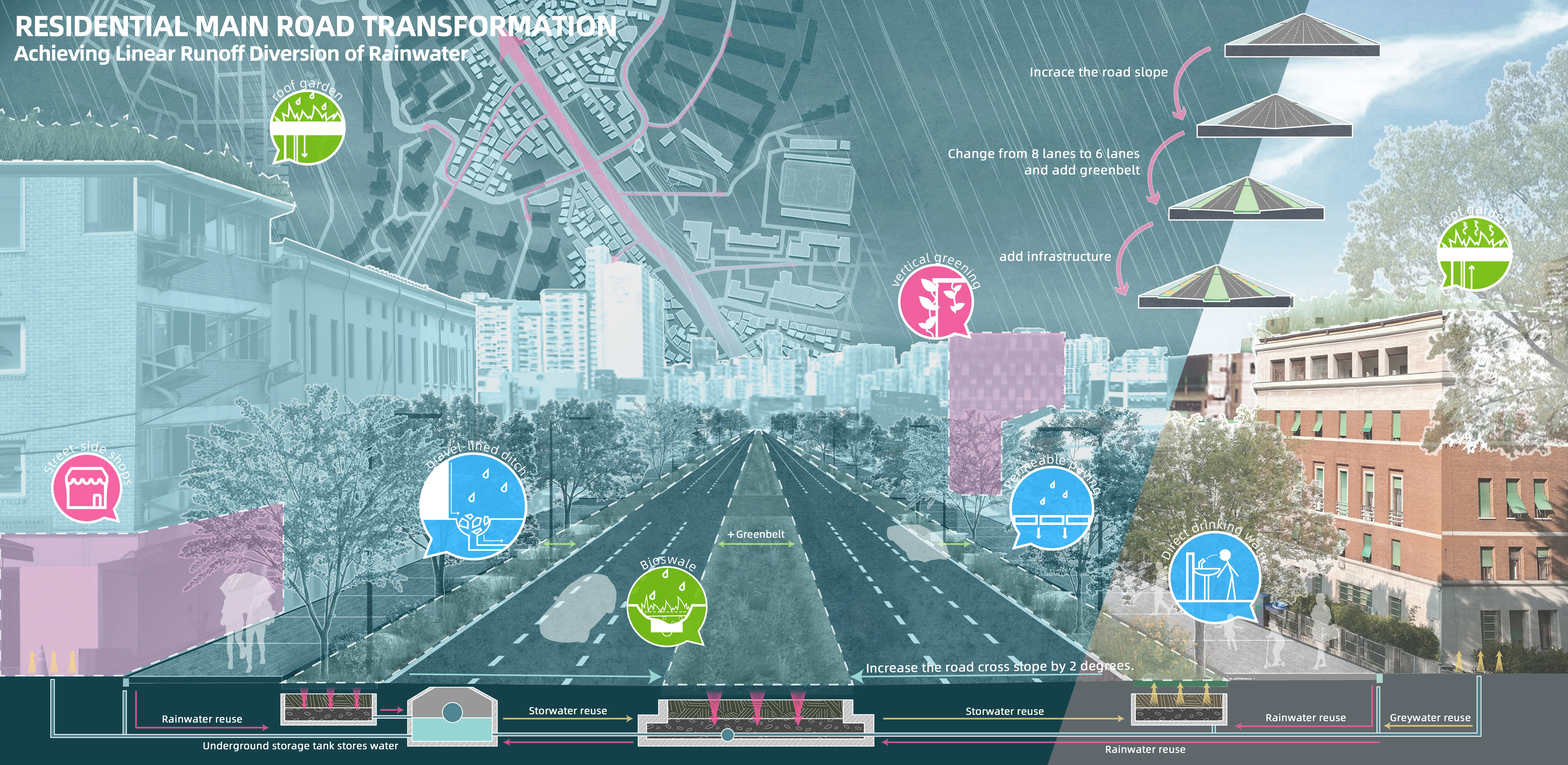 (1) Linear runoff management: Adjust the road slope in low-lying areas to optimize water flow, while integrating rain gardens and green spaces to facilitate water storage and promote its reuse.