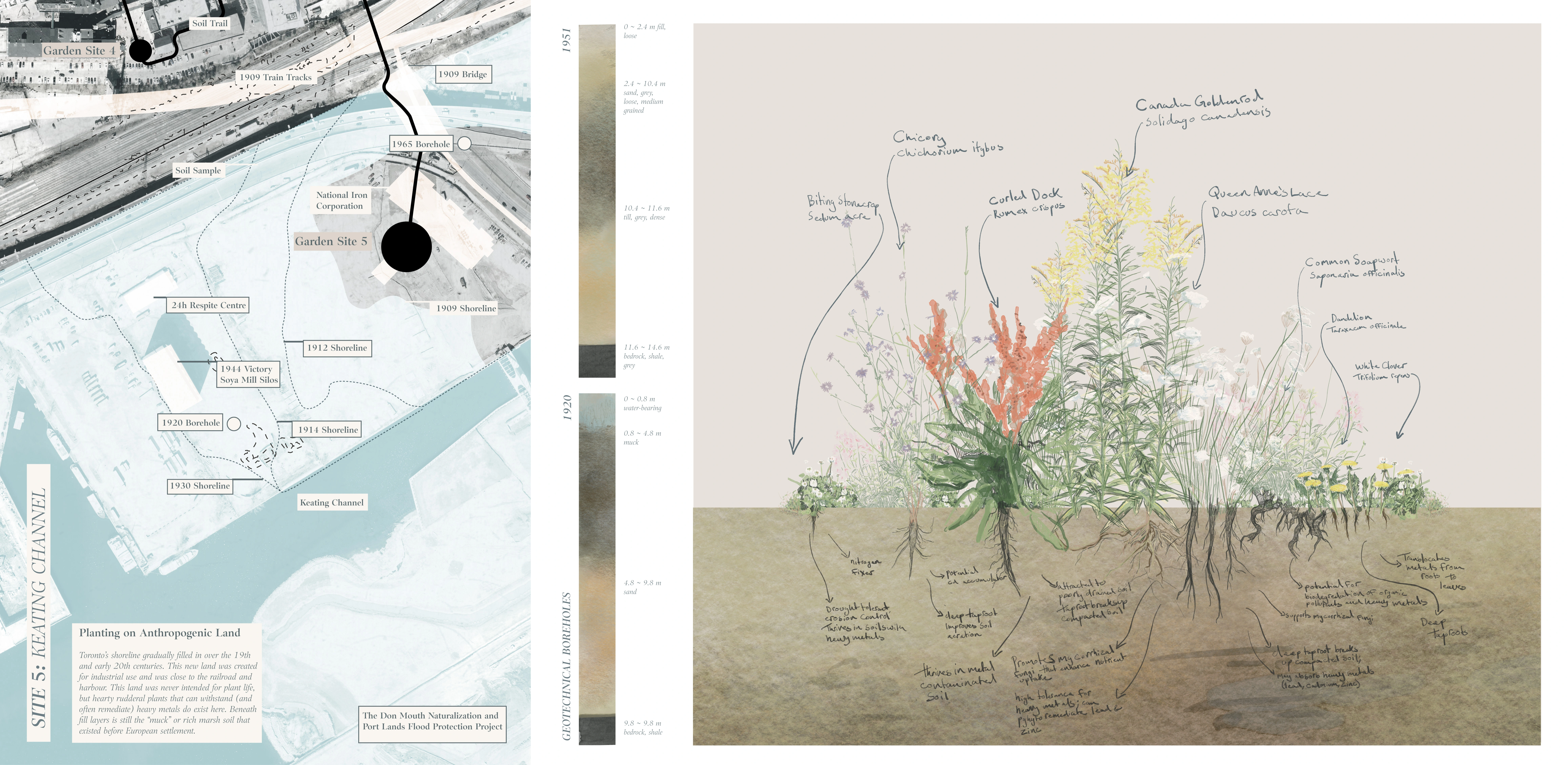 To promote soil literacy, this project proposes an urban soil survey and a series of experimental gardens along a 10-kilometer trail in Toronto’s Lower Don Valley Sub-watershed. These gardens integrate varying degrees of intervention with one rule: no new soil can be added. Instead, existing urban soil conditions are explored through collaborations with plant life.