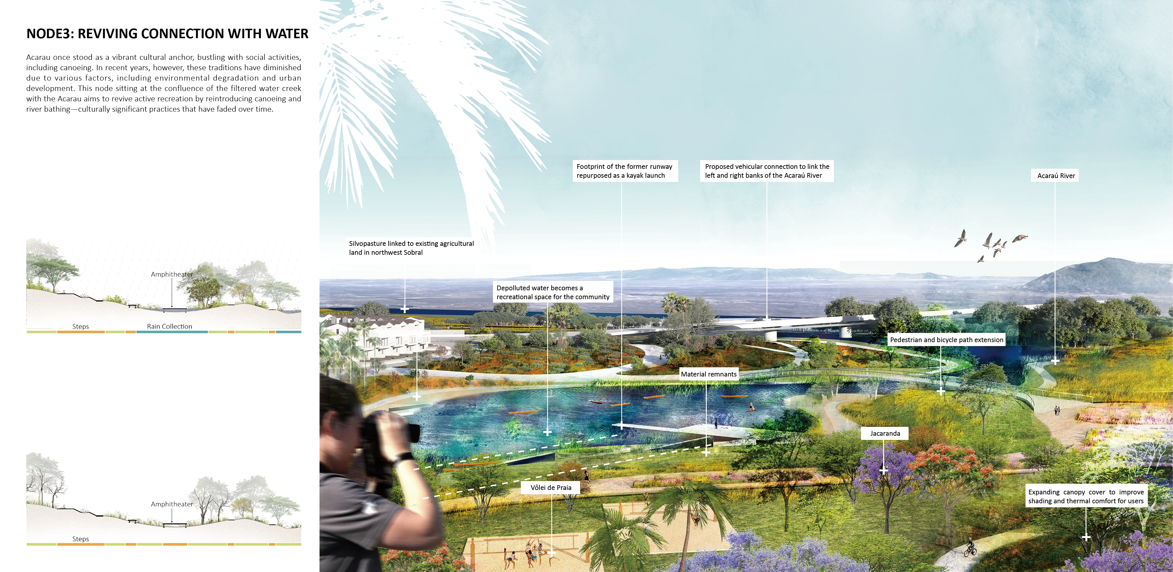 Acaraú once stood as a vibrant cultural anchor, bustling with social activities, including canoeing. In recent years, however, these traditions have diminished due to various factors, including environmental degradation and urban development. This node, situated at the confluence of the filtered water creek and the Acaraú River, aims to revive active recreation by reintroducing canoeing and river bathing; culturally significant practices that have faded over time.