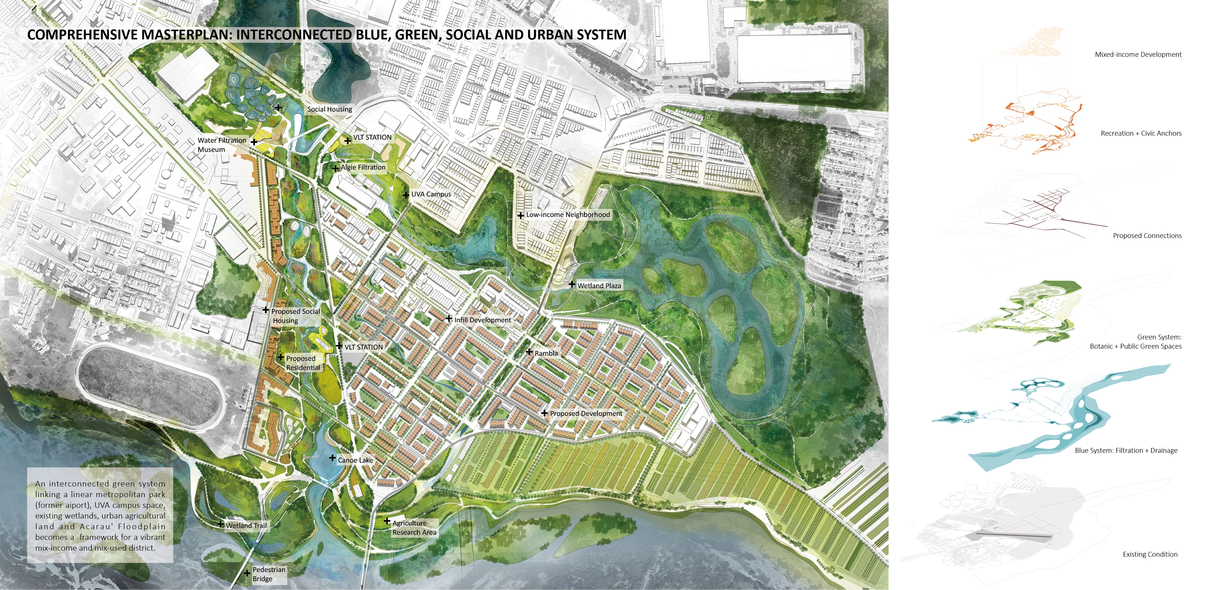 The project exhibits a multi-layered interconnected system- An ecological approach to landscape remediation with a blue-green armature, a cohesive urban development that stitches fragmented neighborhoods as well as Sobral's strong cultural identity reflected in an interconnected system of civic anchors. These interconnected systems are showcased through four major nodes.