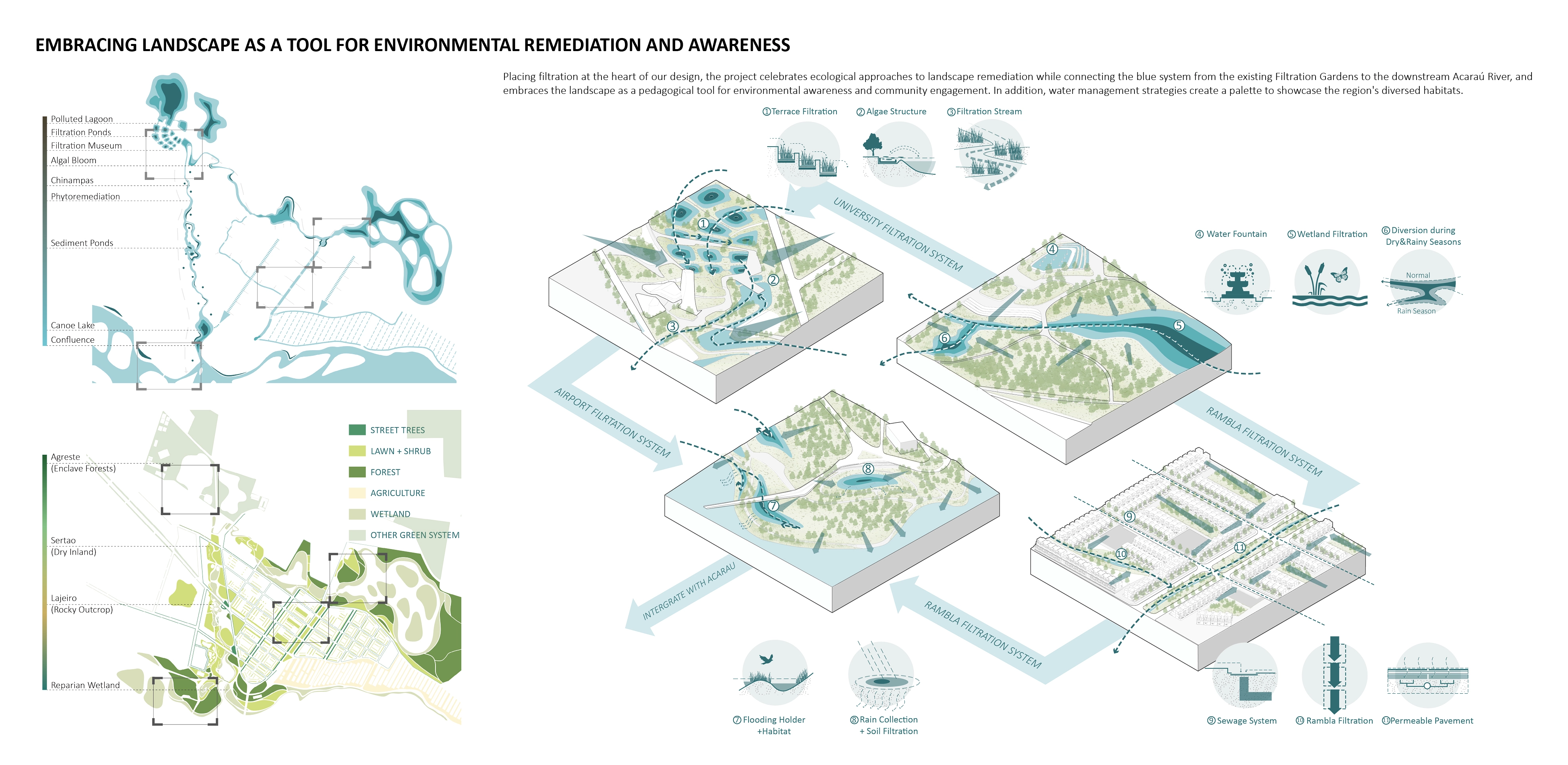 At the heart of our design lies a commitment to water filtration and ecological restoration responding to the city's distraught relationship with sewage water treatment and urban flooding. The project aims to reconnect the blue system—from the existing Filtration Gardens (the city's pilot natural filtration project) to the downstream Acaraú River—while embracing landscape as a pedagogical tool for environmental awareness and community engagement. Water management strategies showcase the region's diverse habitats, integrating ecological approaches to landscape remediation.