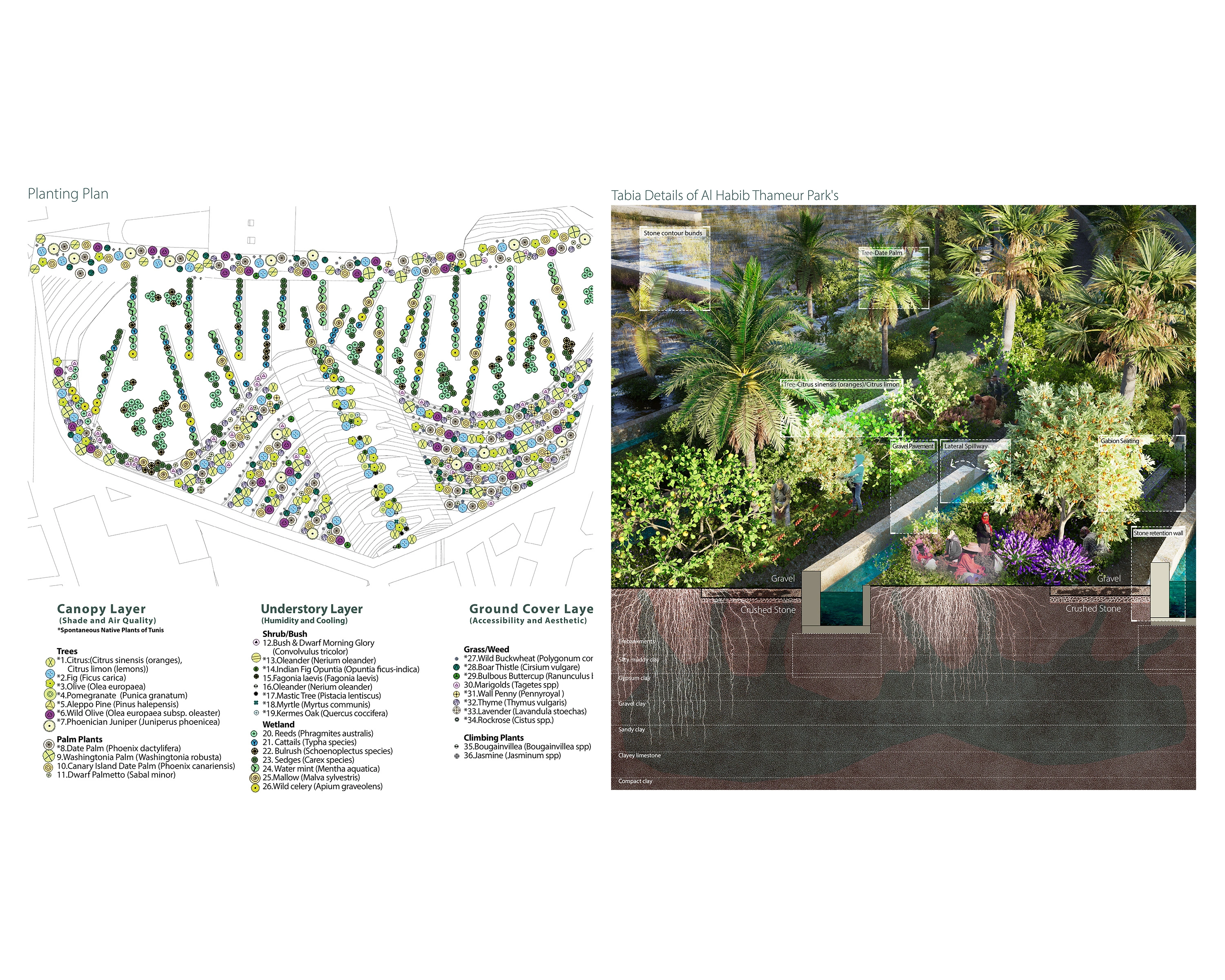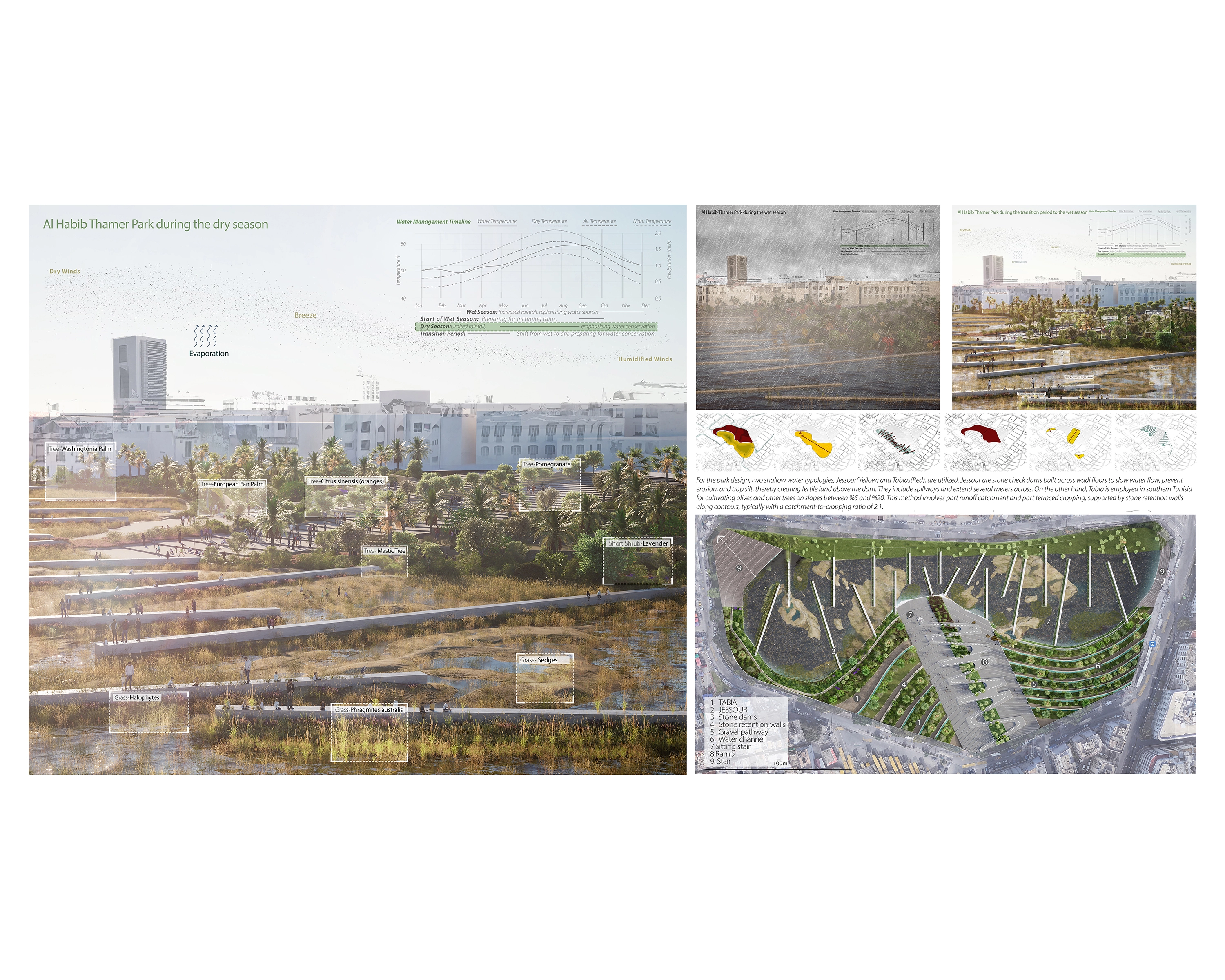 All 84 sites require a water management timeline with wet and dry seasons and two transitional periods. Al Habib Thamer Park (XL size) uses the Jessour and Tabia traditional systems based on their size and slope. Jessour involves building stone dams to slow water movement and prevent erosion, and acts as a sponge during the wet season, absorbing rainwater to prevent flooding and storing it in the soil. Tabia, which features terraced fields for water retention and soil fertility, was adapted for steeper areas of the park. In the dry season, the park becomes productive, providing food and economic benefits while maintaining a cool oasis for recreation. Medium-sized sites, such as the Bab Souika, were designed with the half-moon typology, while small sites, like Bab Bnet, utilized the Zai system.