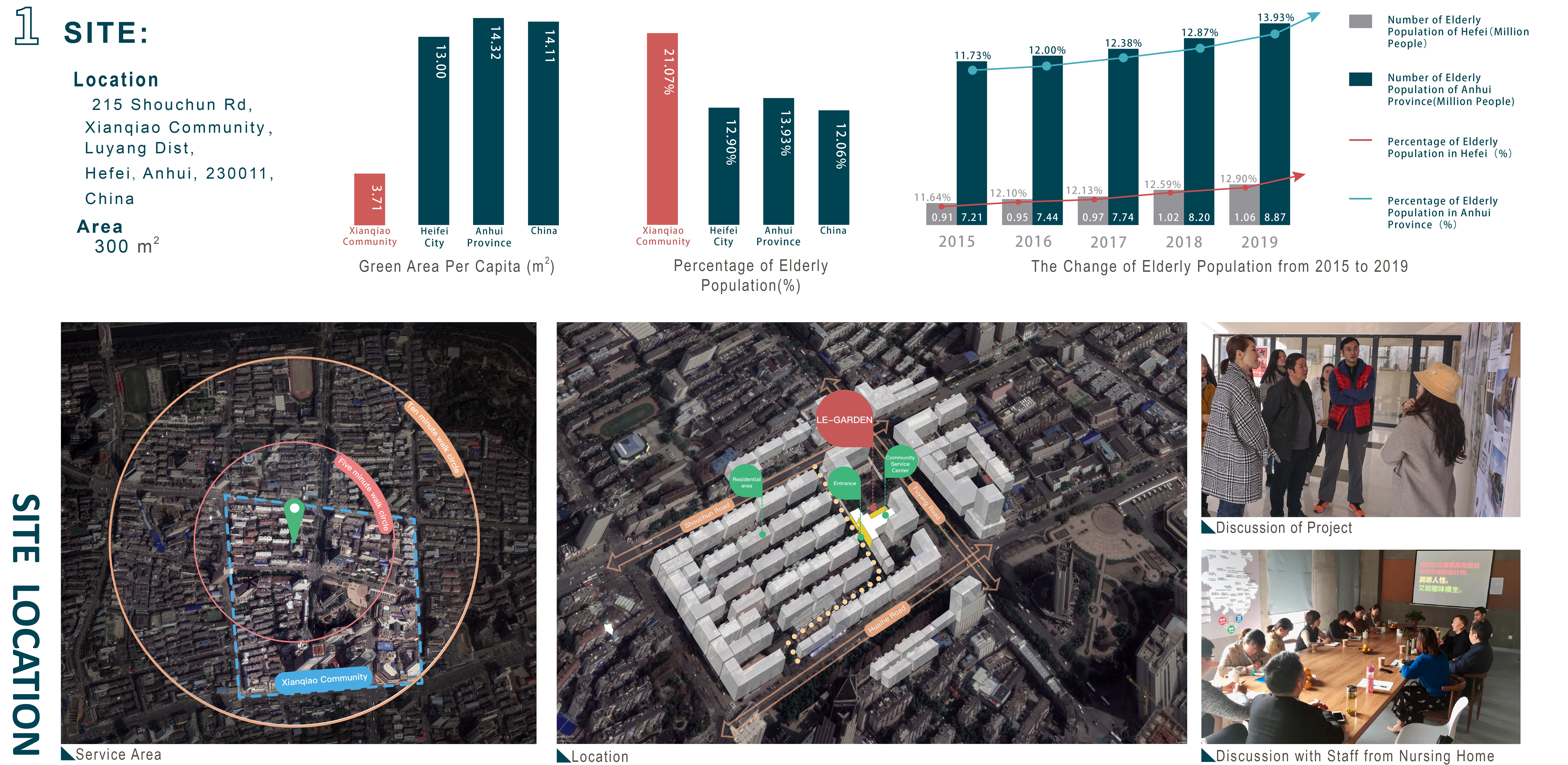 The site is located in Xianqiao community, one of the oldest communities in the center of Hefei city, the capital of Anhui province. This community covers 0.46 km2 and has 6 relatively independent residential areas. As of 2019, there are more than 7,600 residents, about 21 % are seniors. Aging population is a focus in this community. In addition, due to old landscape design and high density caused by rapid development of construction, Xianqiao community has only one public plaza and one pocket park, green spaces and access to the nature in the region are limited.