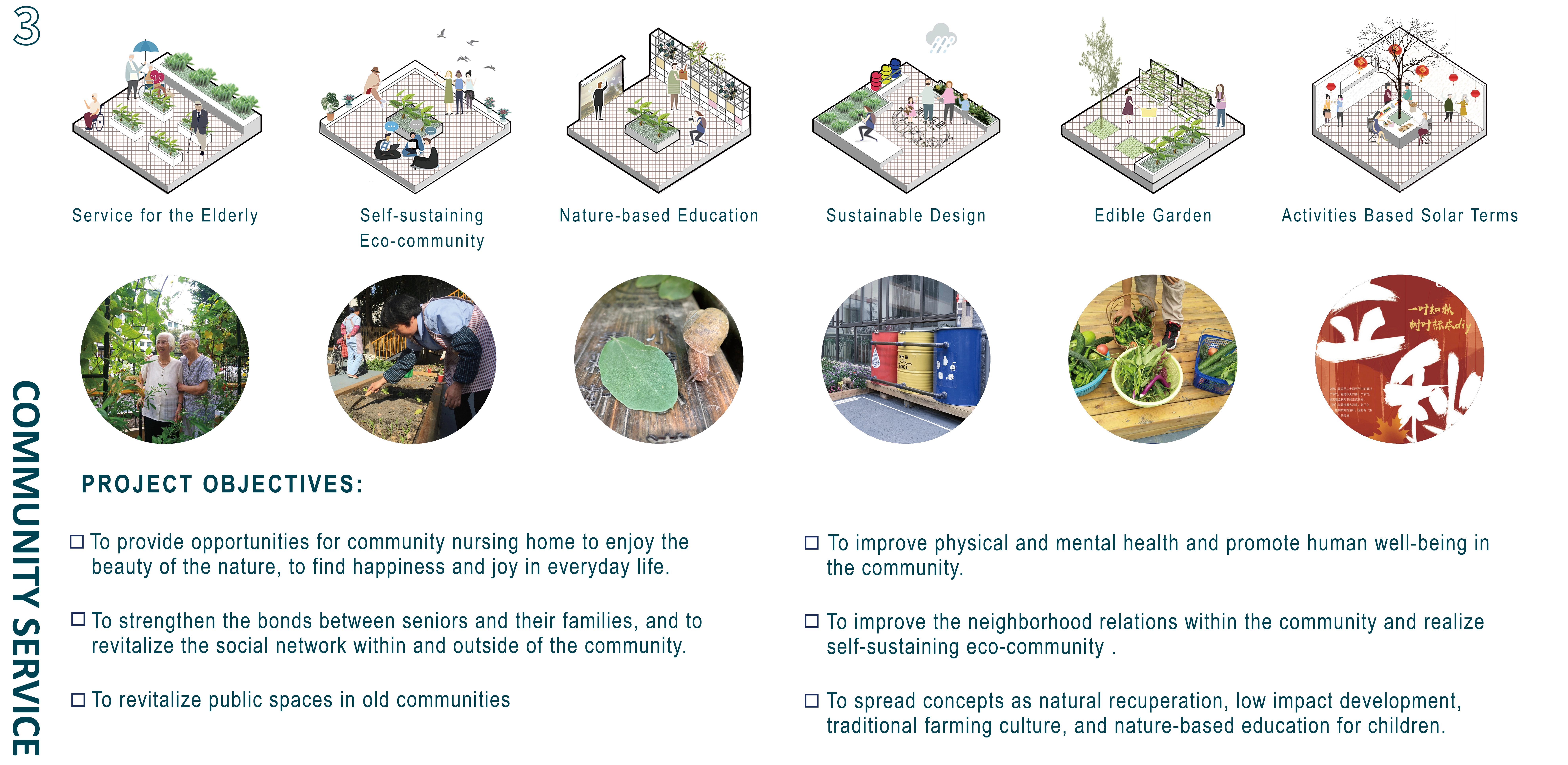 As China is rapidly entering into an aging society, the traditional home-based care model is facing huge challenges. There is a growing need for better designed community programs to serve the seniors and their families within the environment they live. This project Le Garden, aims at creating a healthy and comfortable outdoor space to accommodate interactive, recreational, and educational activities for seniors, to strengthen the bonds between seniors and their families, and to revitalize the social network within and outside of the community.