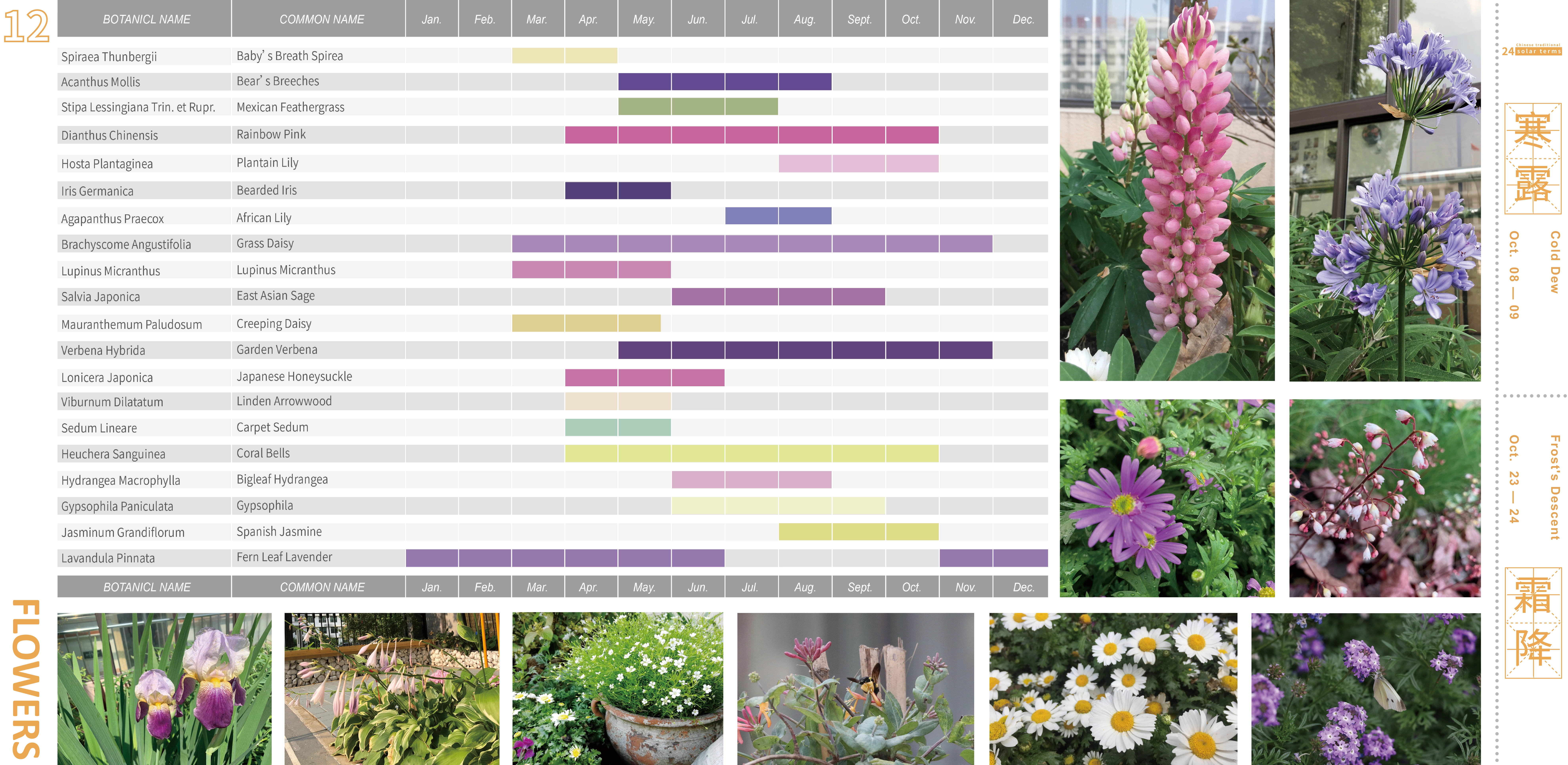 Year-round Flower Bed: The flower bed consists of two planting areas contiguous to buildings, each of which covers 30 m2. To meet the expectations of local residents to enjoy the blossom of plants all year round, a collection of 16 different locally adaptive species of flowers have been particularly selected.