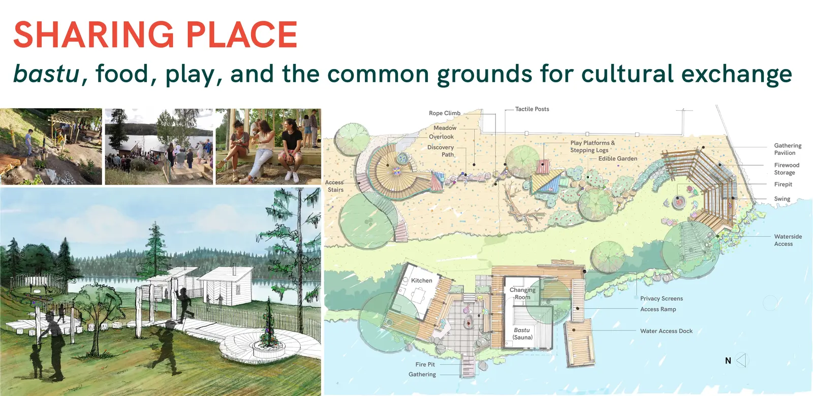 The project’s first phase highlighted the site’s cultural and ecological connection to water. The three principal program elements were a bastu (traditional Swedish sauna), a kitchen pavilion, and a cooking hearth/gathering garden situated between the two structures. The sauna is a historic public space typology presenting an environment of vulnerability and equity. The act of bathing together offers a culturally significant way to cross barriers between people. It also functioned as a topic of dialogue around cultural connotations of gender and nudity amongst the ethnic Swedes and Syrian community. As a winter activity, when people primarily shelter within their homes, the sauna activates the park as a community outlet for social interchange and friendship. The food pavilion and cooking hearth build upon a successful precursor: a temporary community kitchen fostering cultural exchange of food, recipes, and language.