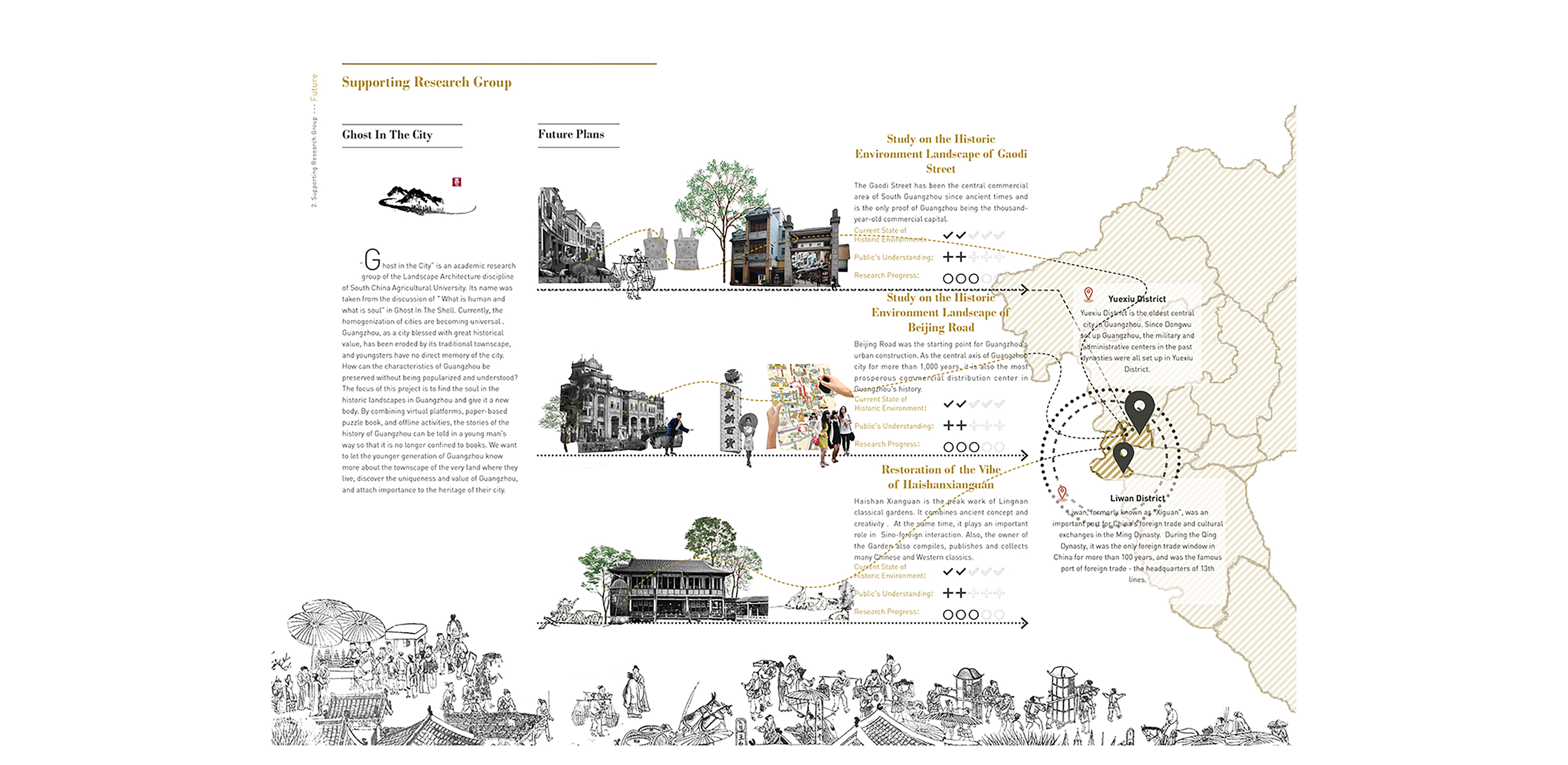 Guangzhou has a city construction history of more than 2200 years. The legacy of traditional wisdom that was hand down by the changes in the urban environment is still of great value to the construction of urban environment and quality city life. However, with urbanization taking off, the public has lost track of the basic understanding of Guangzhou's history. Many Guangzhou's historical landscapes with regional characteristics have been forgotten by the public and are not being preserved.