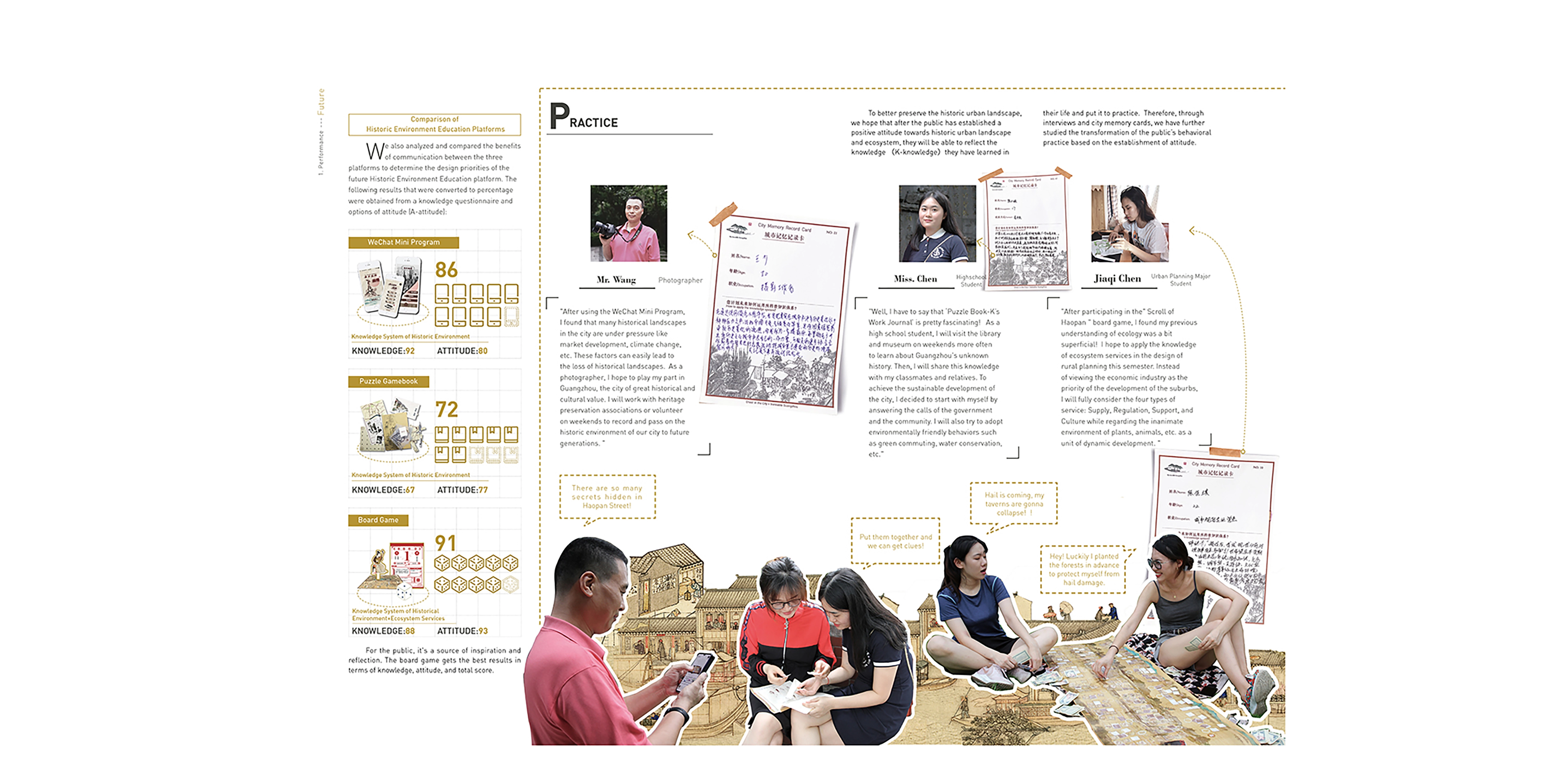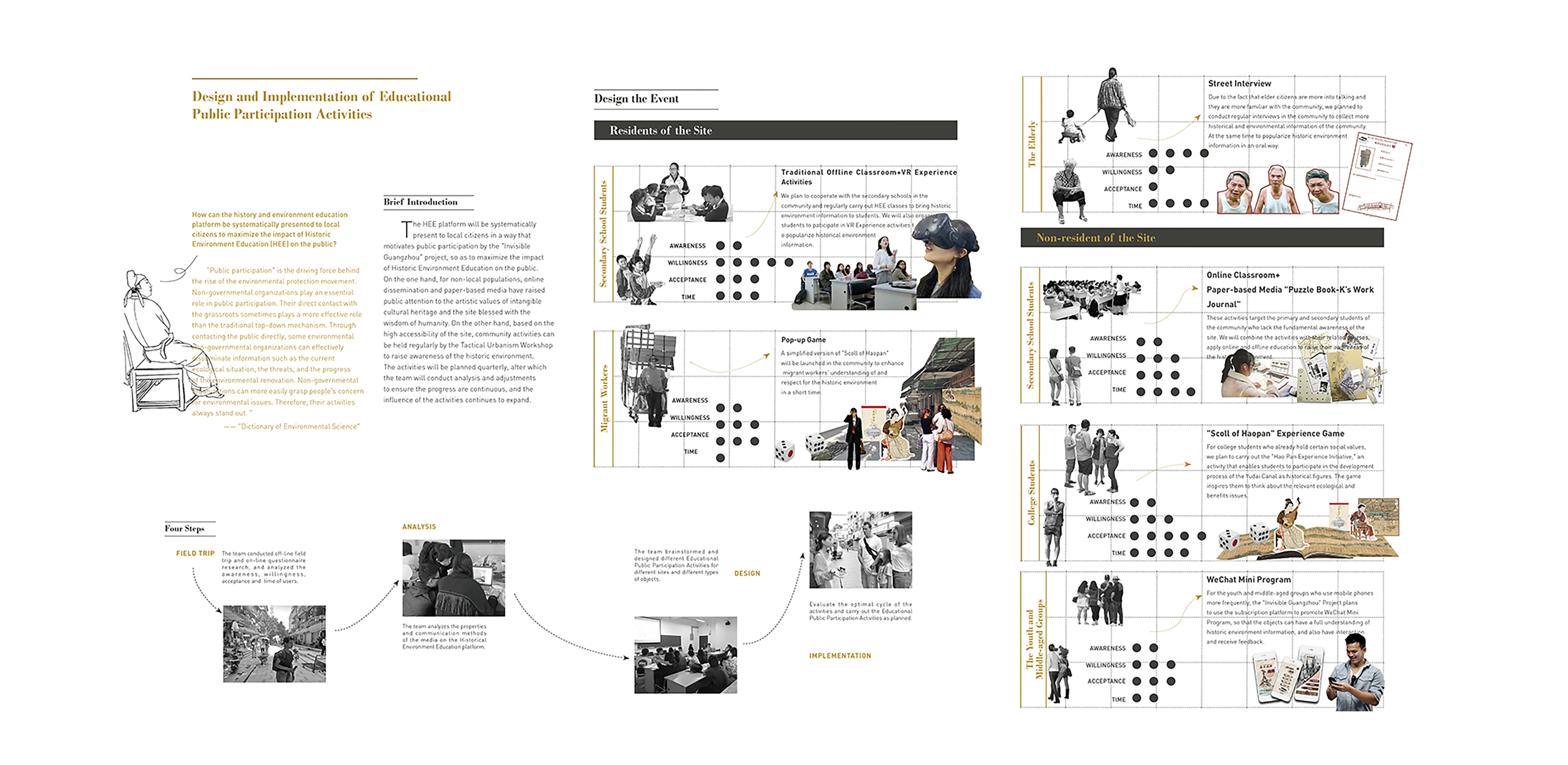 By designing public participation activities, the project helps the public to establish a correct attitude towards the historic urban environment (A-attitude) in the process of popularizing historic environment information (K-knowledge), and hopes the educatee are able to reflect on their life, thus can better preserve historic urban landscapes of Guangzhou (P-practice). Meanwhile, the platform gives the science popularization education of historic environment through the historic urban environment information database, as well as online and offline information communication media. It also further summarizes the knowledge of eco-social infrastructure services (K-knowledge) provided by historic environment to the masses.