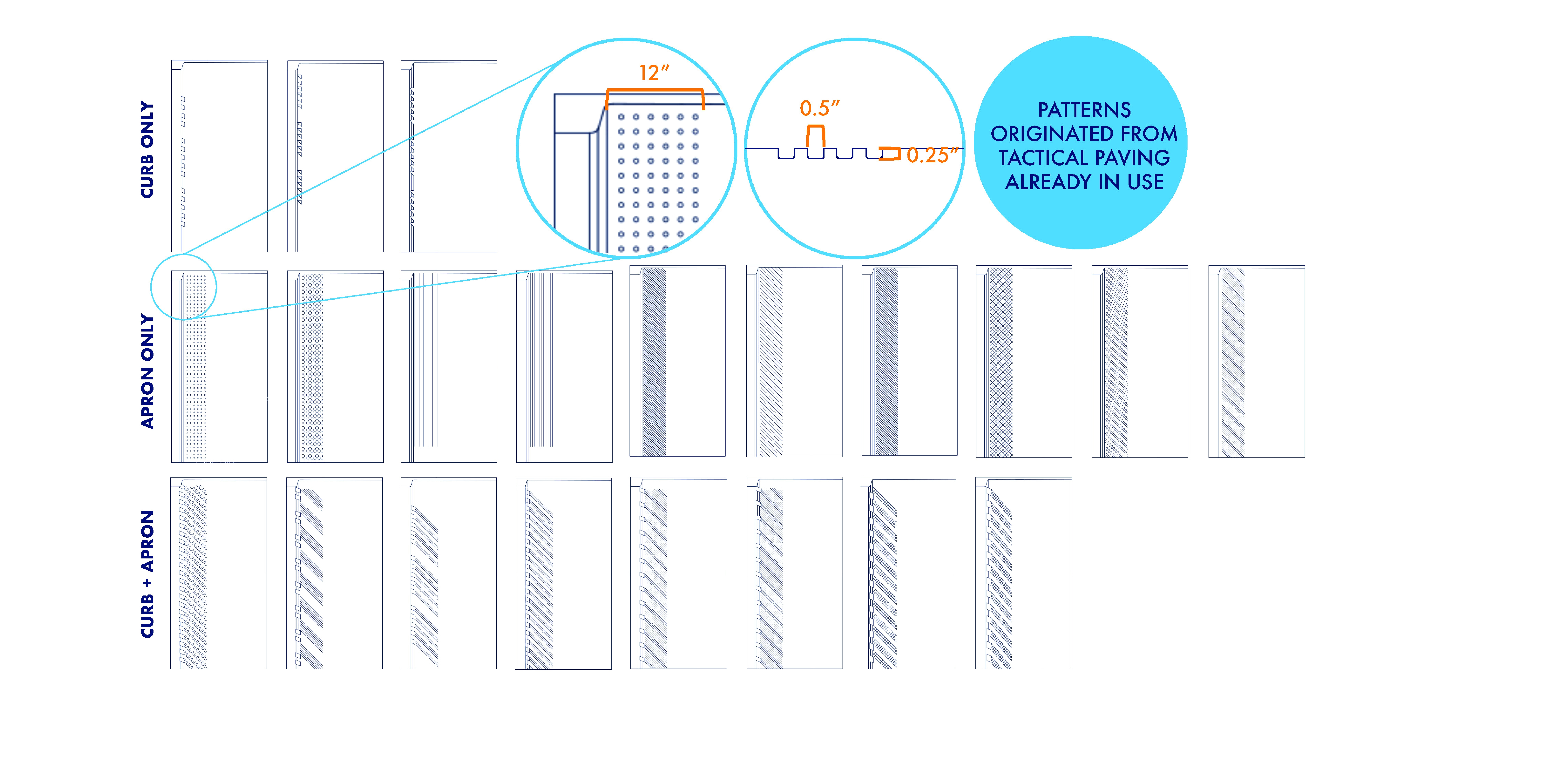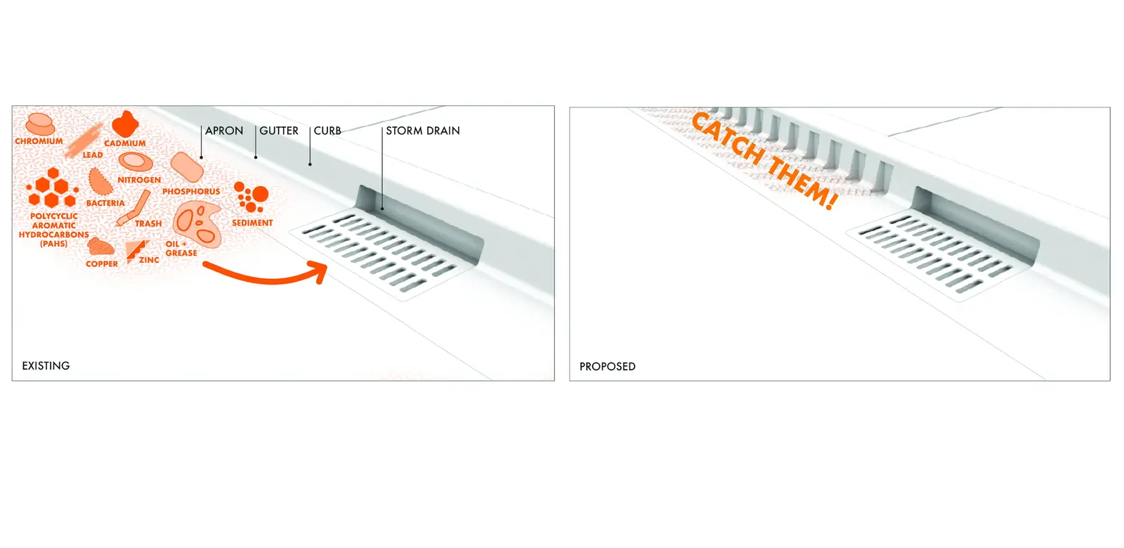 The design of a curb is straightforward. Often formed of concrete, it delineates pedestrian and vehicular space via a 6” grade change from gutter to sidewalk. The curb itself provides a conveyance of stormwater, facilitating the movement of water - and pollutants - from the street into our waterways. Pollutants such as sediment, nutrients from lawn fertilizers, bacteria, pesticides, metals, and petroleum by-products are all present in stormwater. Pollutants accumulate on the road surface and are released during storm events, carried to storm drains via a system of concrete curbs, gutters, and aprons, and deposited into waterways by sewers, often without treatment. Once pollutants enter the waterways they impact the ecosystem and affect water quality. How can discrete standards - like a curb - be leveraged to have larger systemic impacts? This research project, Curbing Sediment, challenges the design standard of the concrete curb and apron. Curbing Sediment investigates alternatives to this standard via alterations on the curb and apron face to reduce stormwater runoff velocity and collect roadway sediment before it enters waterways.