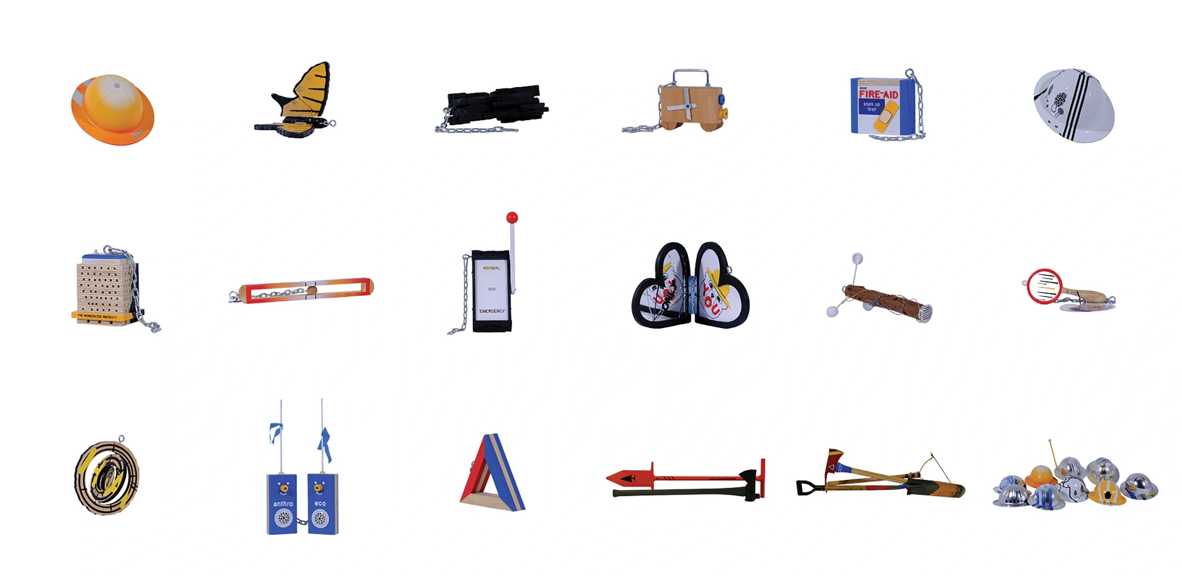 In the second phase, multiple skill-building creative explorations took place immediately after the forest visits and served as preparation for the final exhibition. Helmets were a necessity for the more recent post-fire sites and these were painted with colors and symbols related to forestry communication. Some common tools from the wildland firefighter’s toolbox were similarly treated.