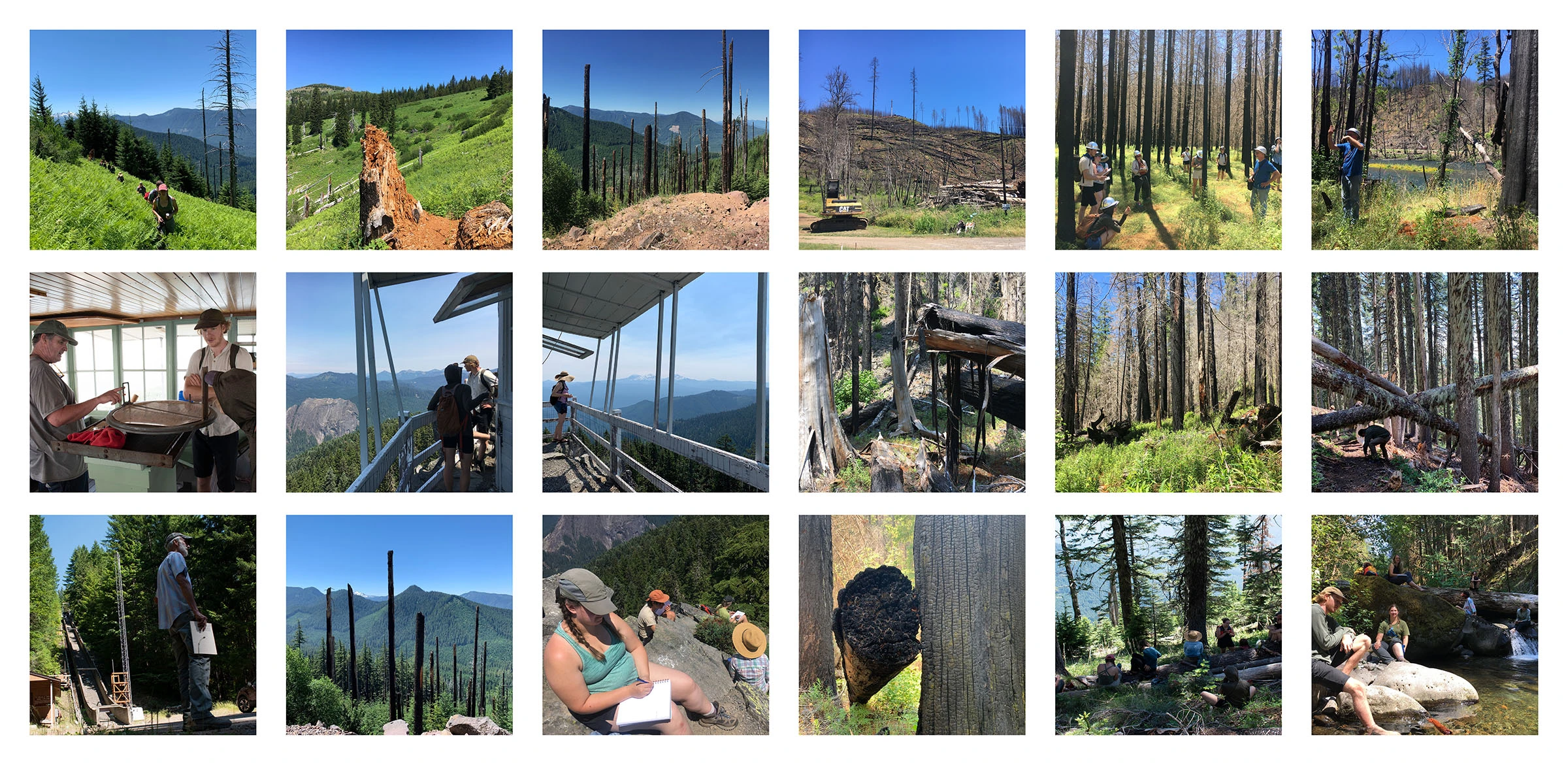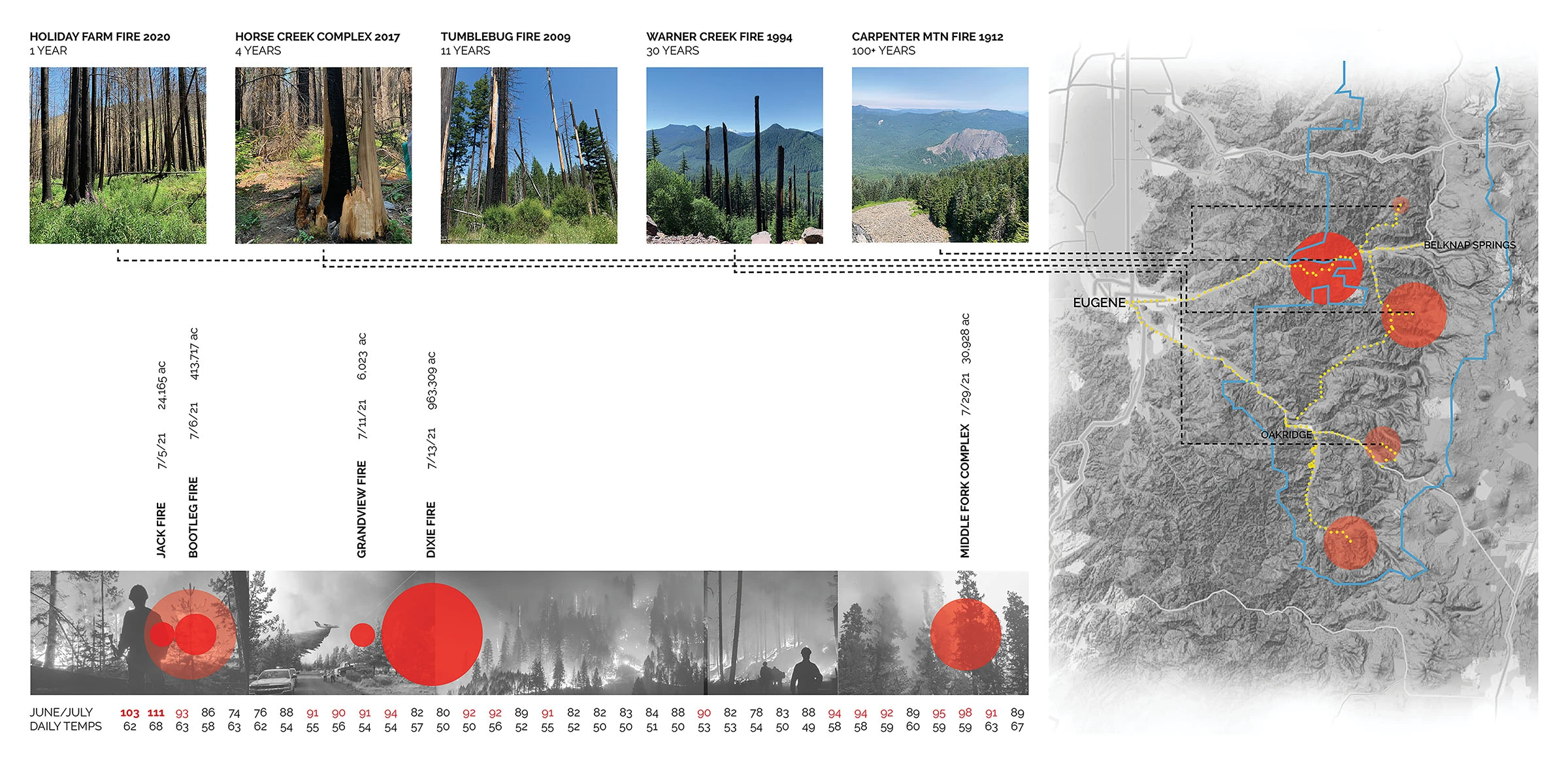 The work draws extensively from field visits to post-fire sites within the Willamette National Forest. We were also strongly influenced by concurrent environmental events: a record heat wave which coincided with the first day of the field school, and the explosion of wildfires as we entered our final design phase.