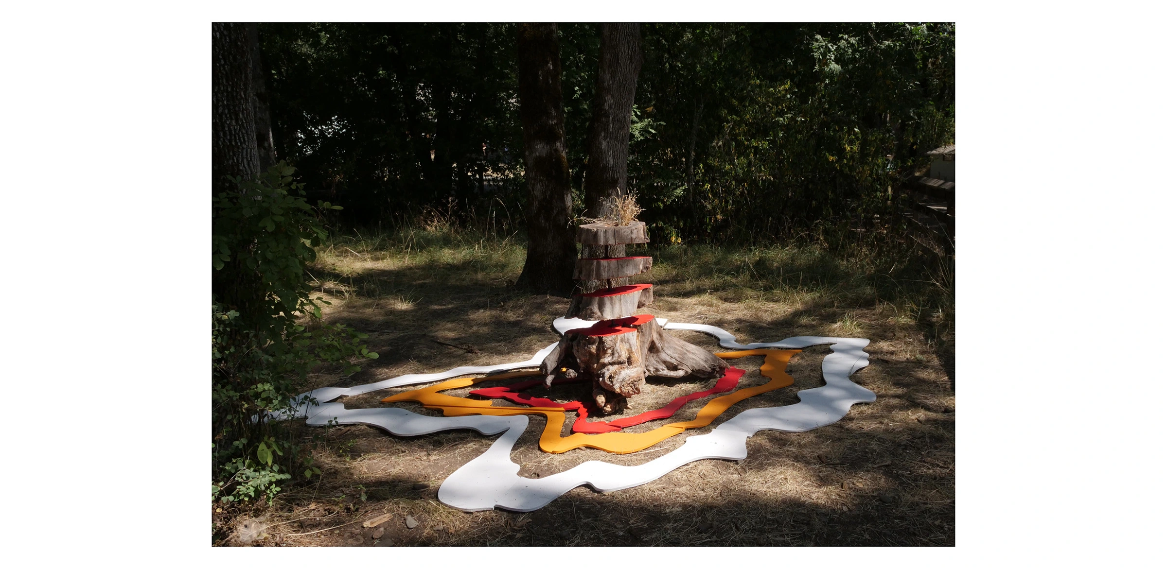 Ripple Effect: A snag is an integral part of a forest ecosystem and has a ripple effect that extends far beyond itself. During its decay or after a fire, it provides energy and habitat for mushrooms, insects, mammals, birds, and many other organisms. This installation reflects recovery after death and the connections that extend past mortality.