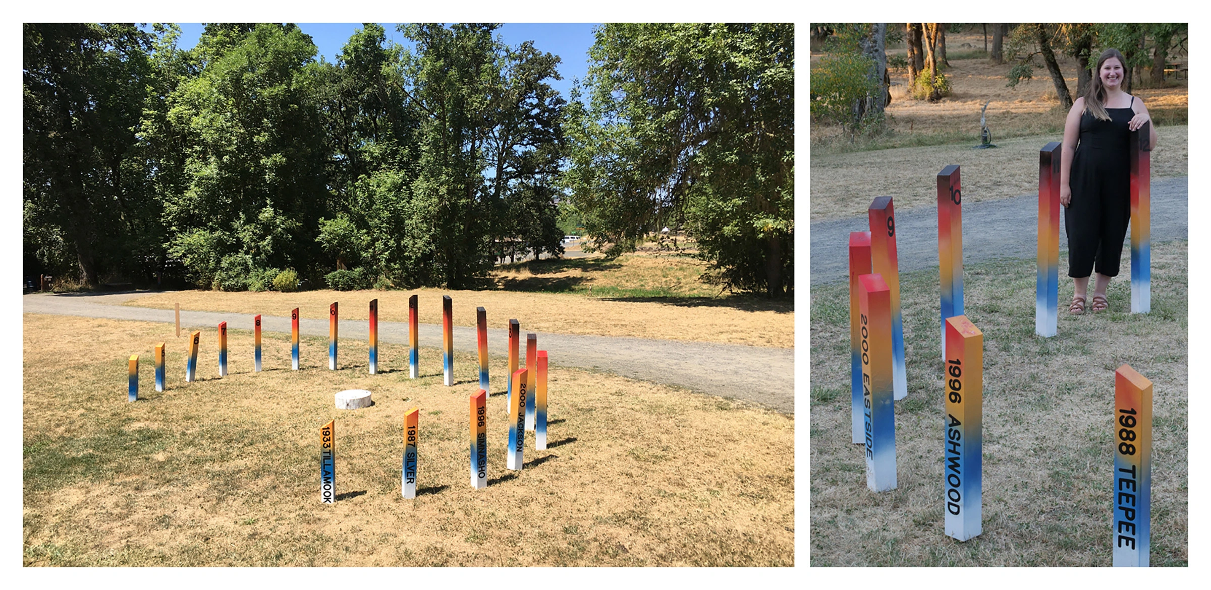 Revolutions of Recovery: In this sundial, the viewer is invited to engage directly with the piece. By standing in the center and facing north, the viewer’s shadow will act as the time-telling hand on the sundial. Around the edge of the interactive shadow sundial, each hour marker represents a large wildfire in Oregon’s history. In this way, the sundial not only charts the daily cycles of time – it is a monument to the dynamic cycles of fire and recovery through time.